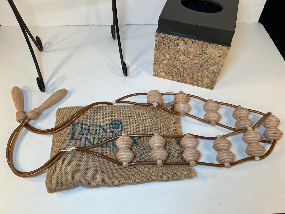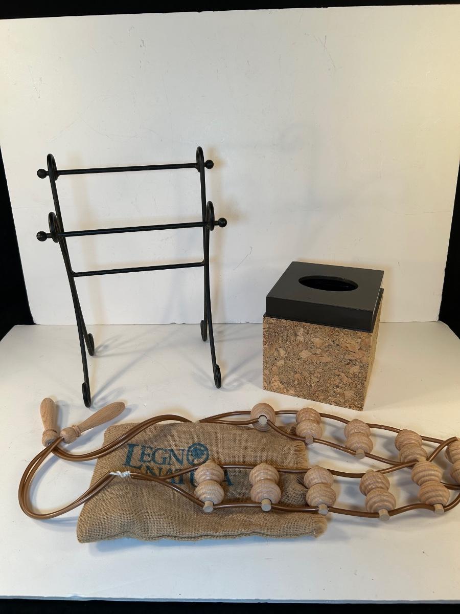 Hand towel towel rack, tissue box cover & wood roller back massager