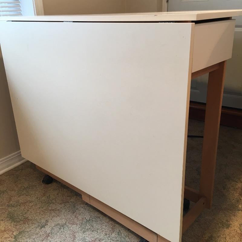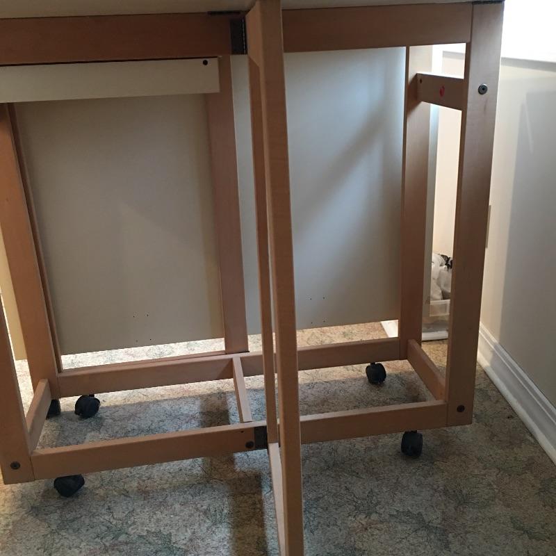 Folding Quilting table on wheels measures 40” x 72” x 35 when open and 40” x 16.75” x 35” when closed. A great table to have that can hide in the corner when not needed and then expand when you do need it.