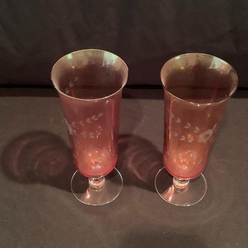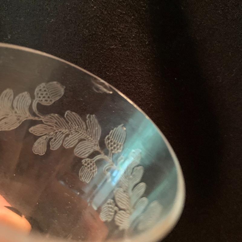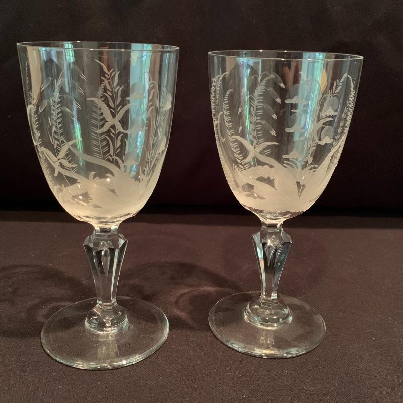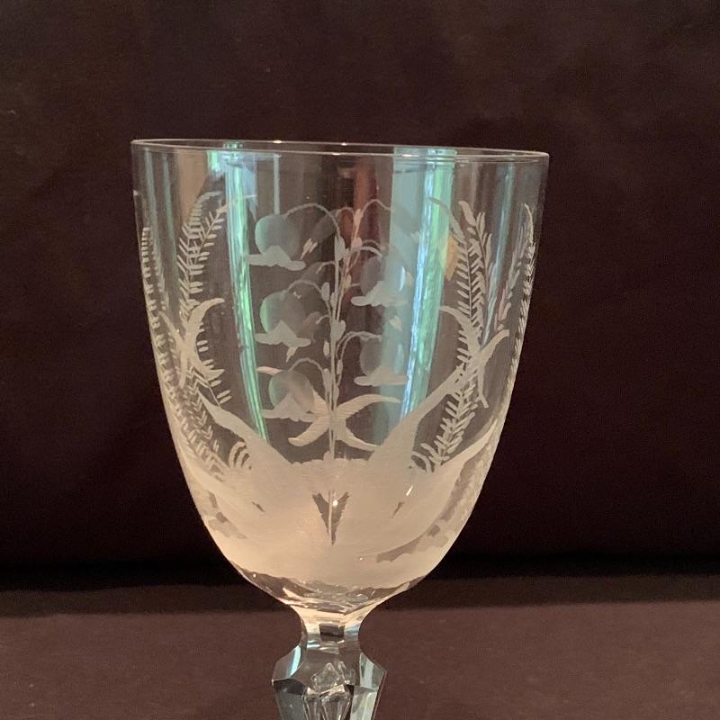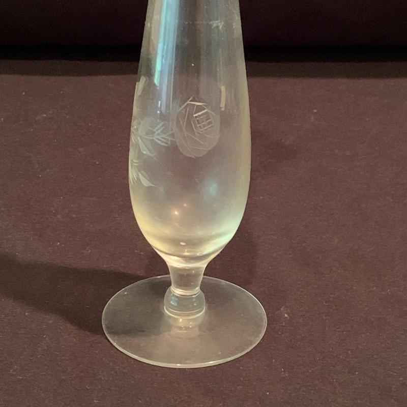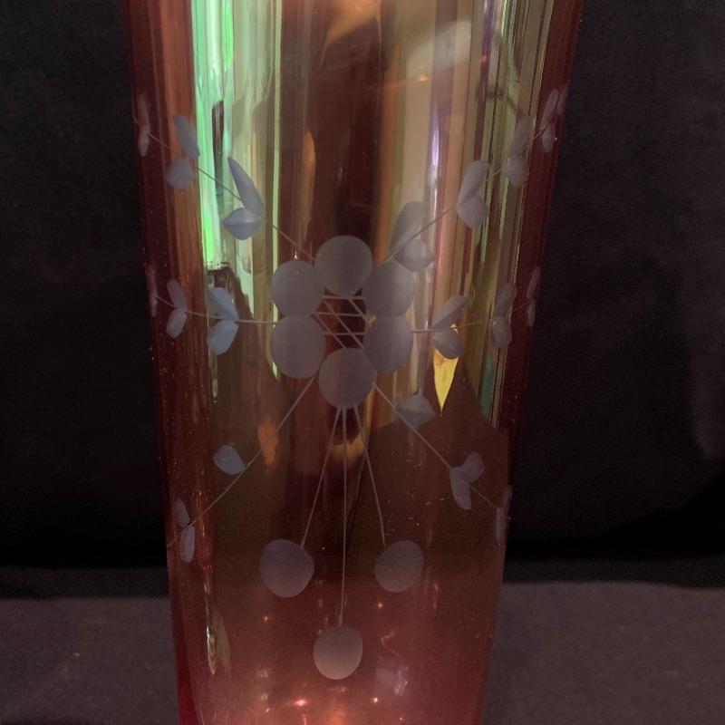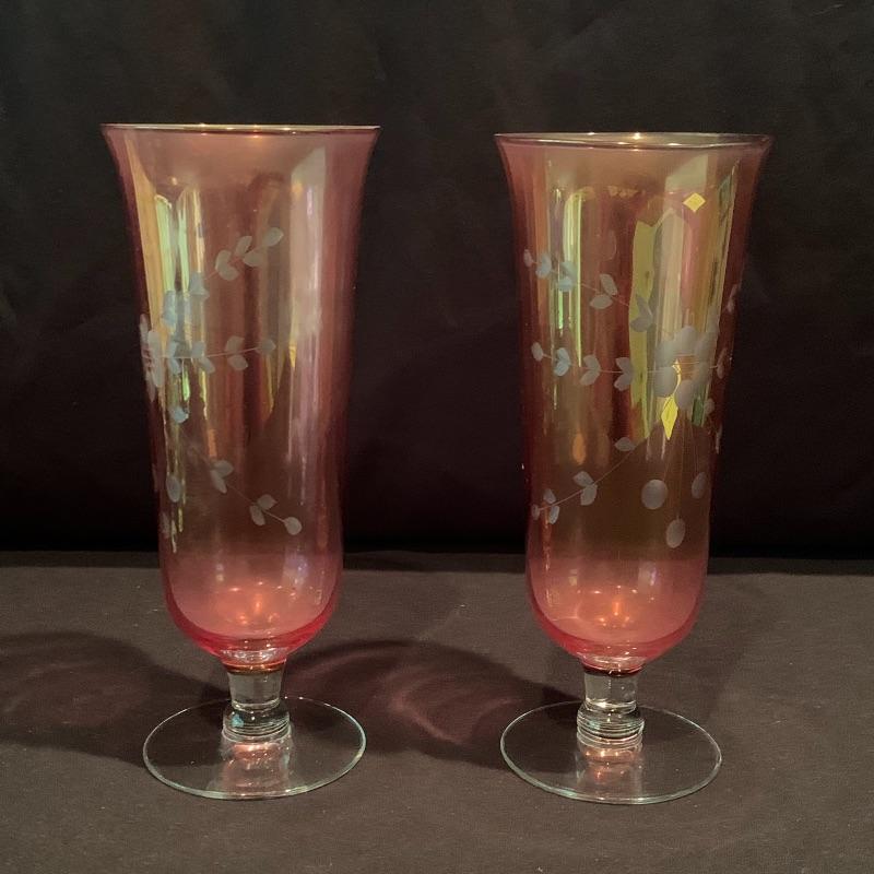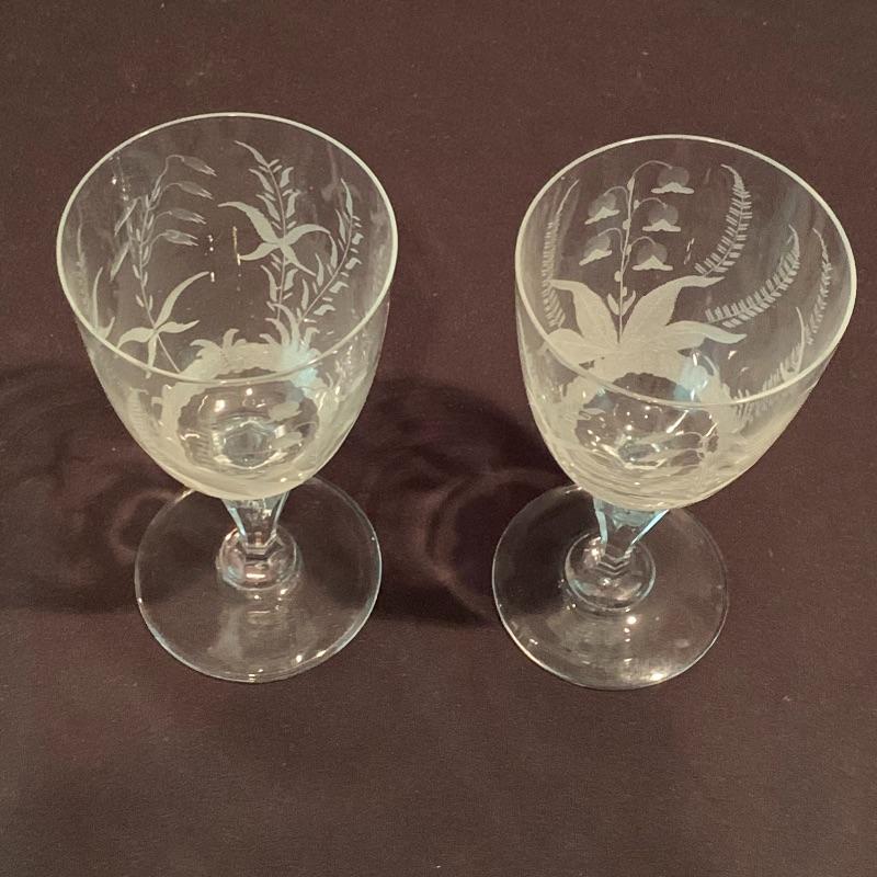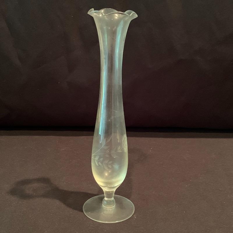 This elegant lot includes a really lovely framed piece of quilled floral art. It has a painted wooden frame that measures 12” x 12”. There is a wire attached to hang the art on your wall, as well as some history of quilling. The stand is not included. There are three delicate glass vases in this lot, all with floral etchings. Two are matching rose colored vases. The single vase has a lovely ruffled edge. All three stand at 10” tall. There are also two glass chalices, intricately etched with Lily of The Valley flowers. Also included are four small matching glasses, etched with oak leaves and acorns. Also in this lot is a crystal shaped paperweight or window ledge decoration and a hanging beaded window decoration with a crystal prism. Shipping available.
