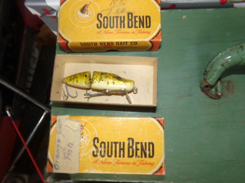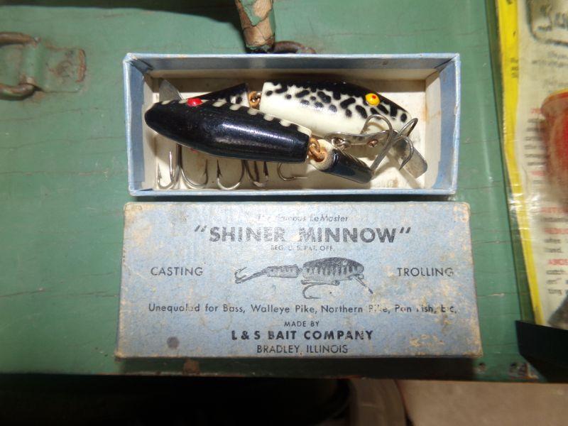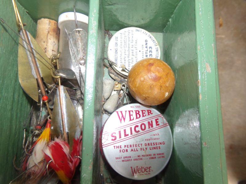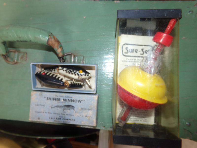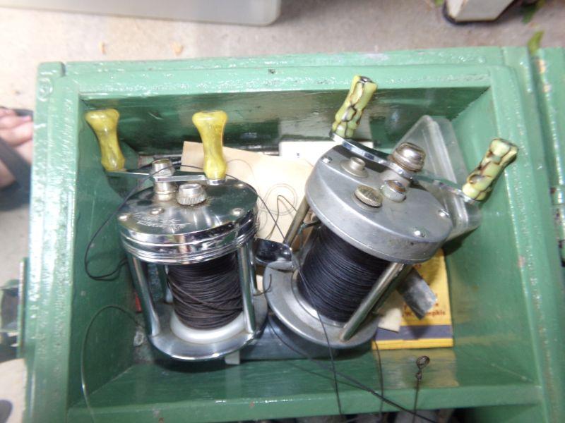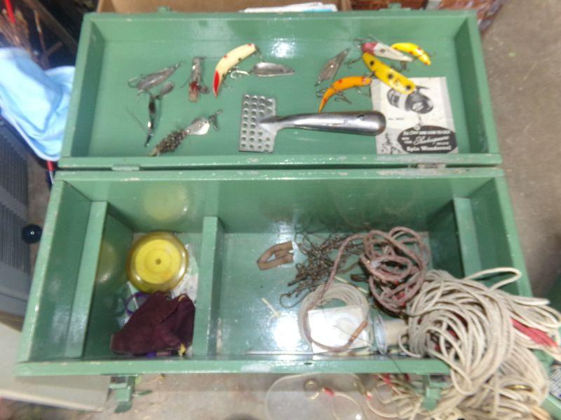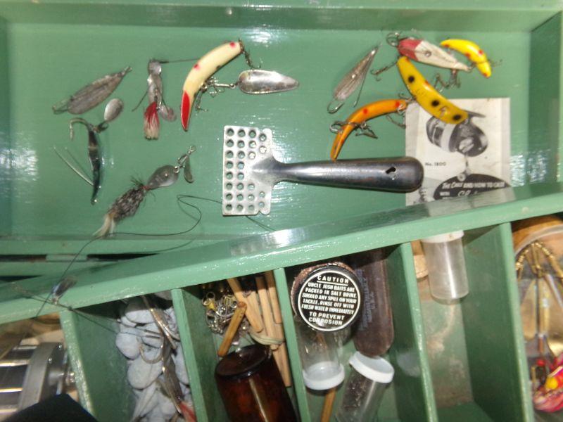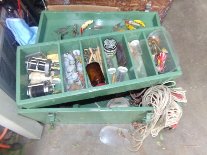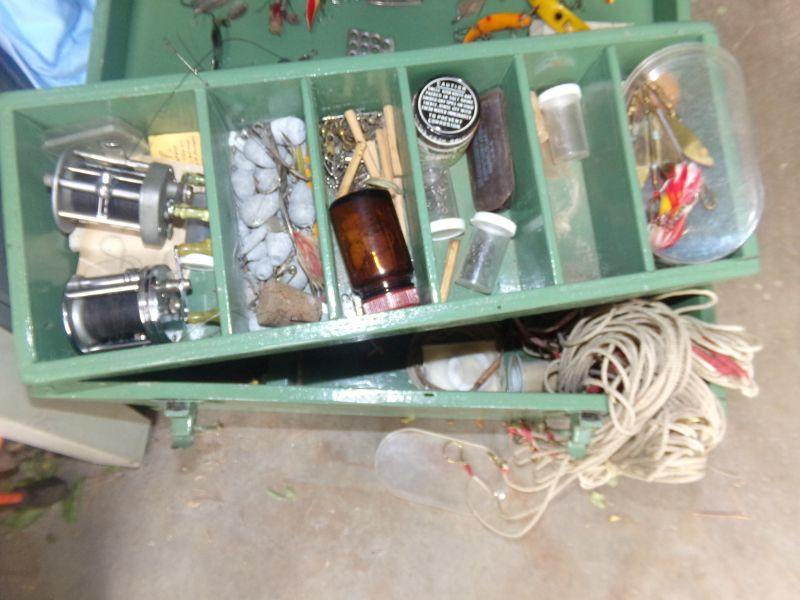VINTAGE LURES AND VARIETY OF OTHER TACKLE PLUS 2 REELS. MEASURES 20" X 8.5" X 11"