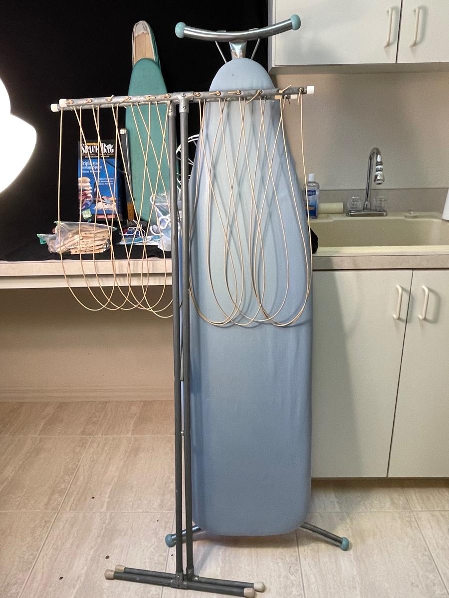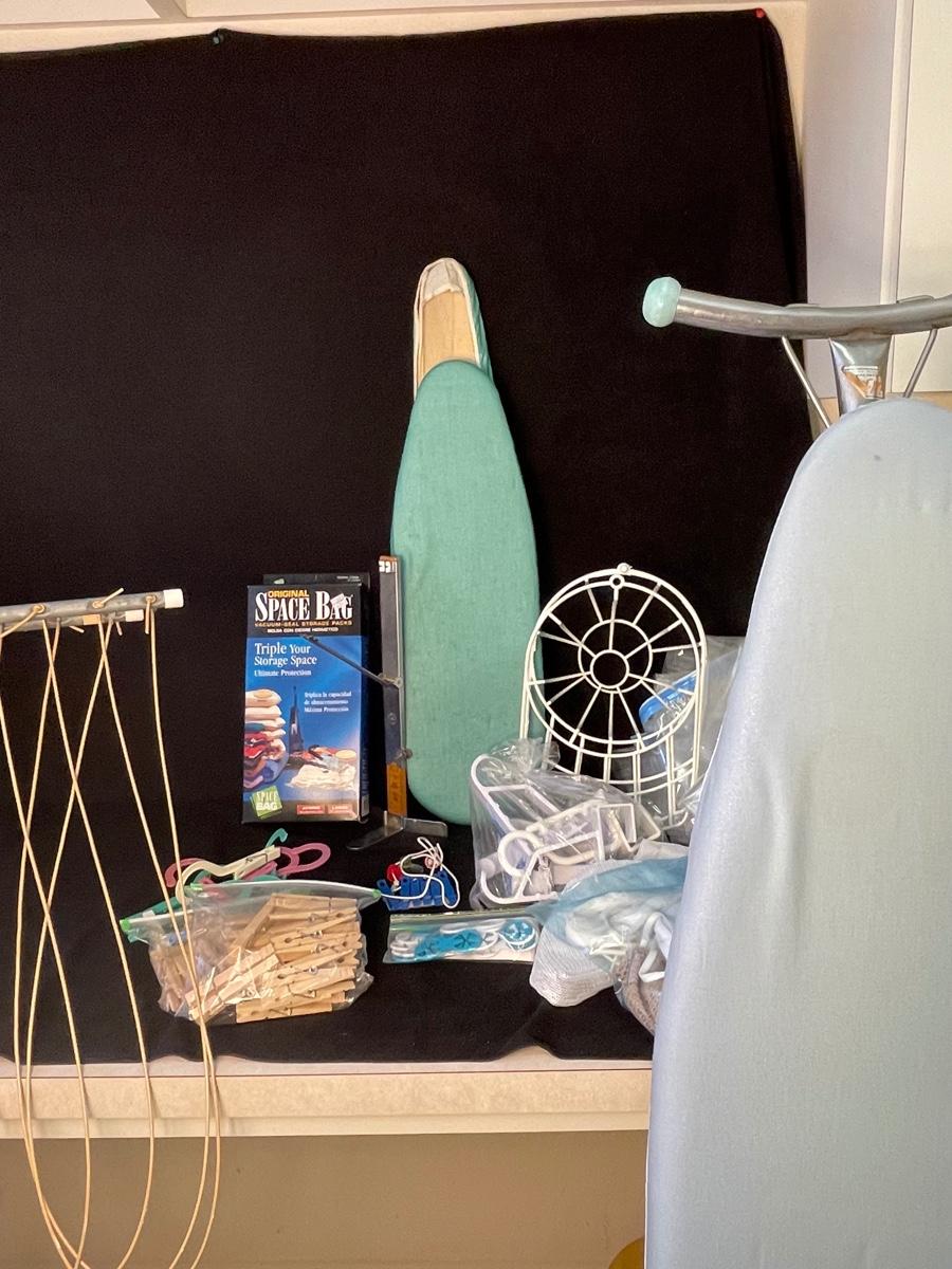 Ironing board, free-standing hanging rack, Sleeve ironing board, vintage hem marker, clothespins, hanger clothespins, sock mates, mesh lingerie bags, ball cap form, and space bags