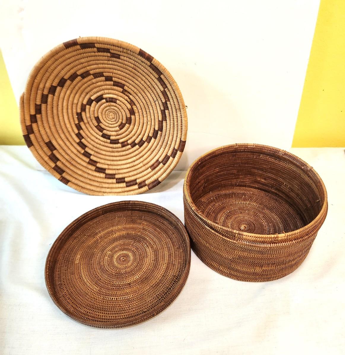 Lot of 2 nice African baskets of unknown origin - one has lid. Lidded basket is 4.5" tall and 8" across. The other is 11" across. Both in good, tightly woven condition.