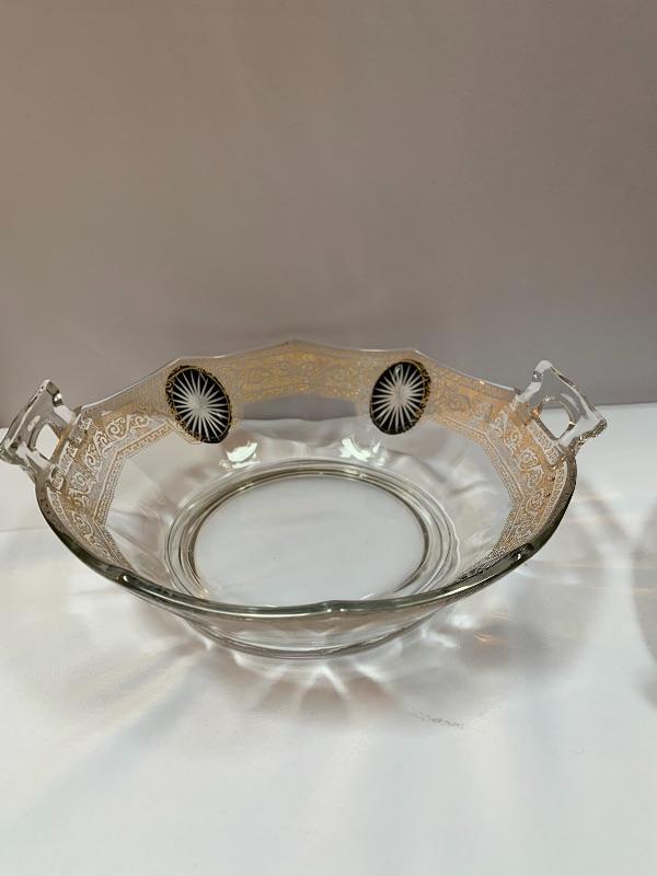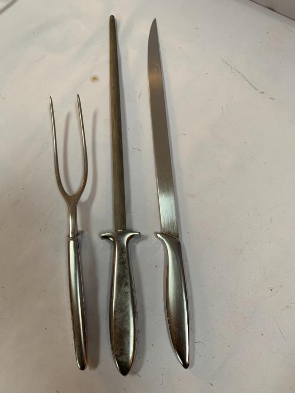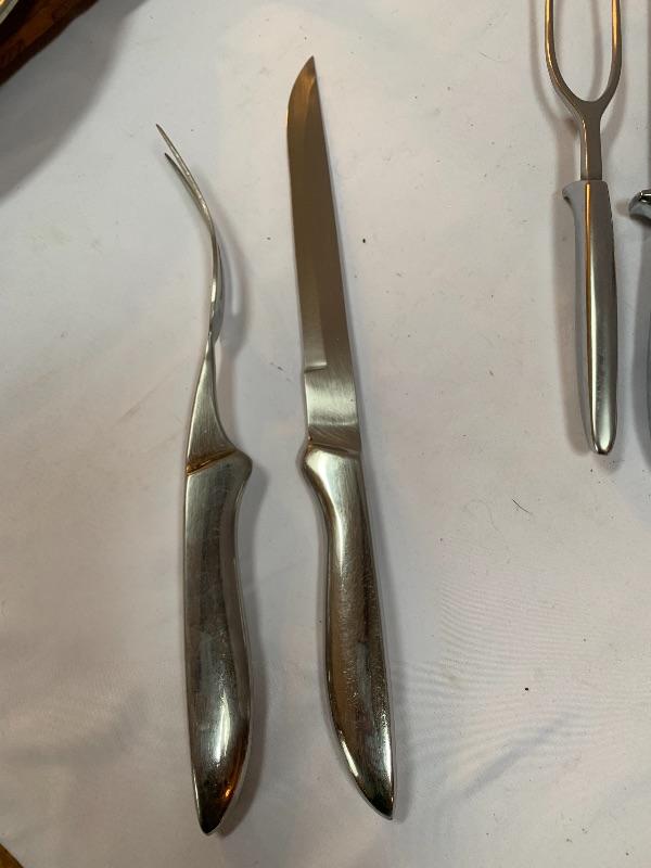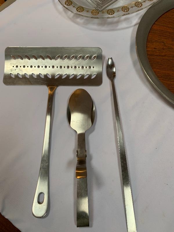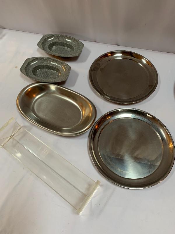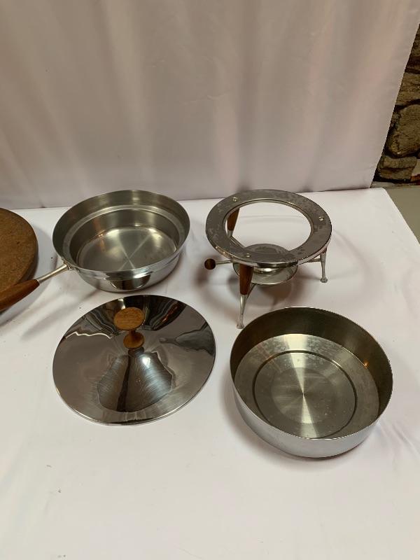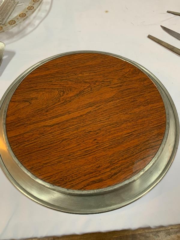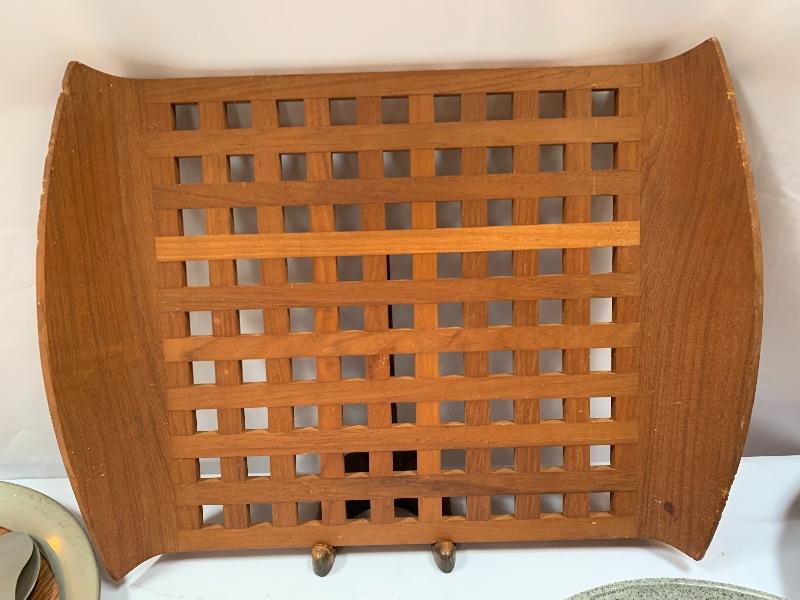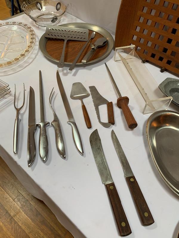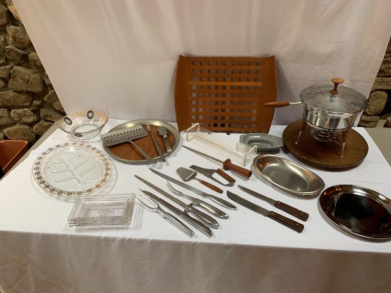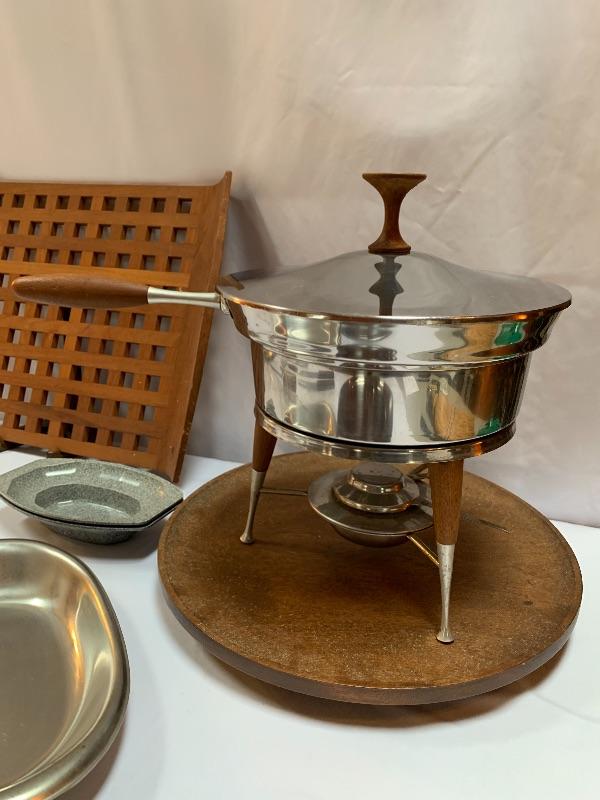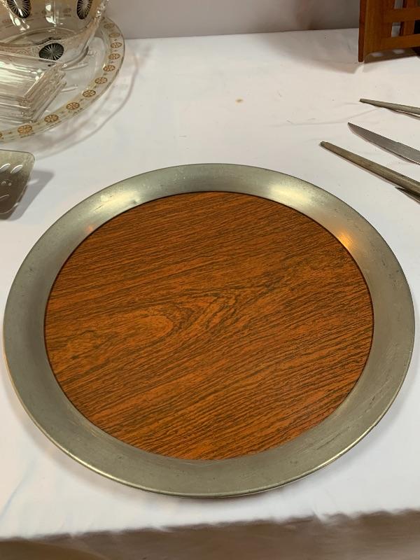 Lovely lot of MCM service pieces to include a hand turned lazy Susan, teak slotted serving tray, Glass Bake, small stainless and teak chaffing dish, stainless platters and cutlery and serving pieces to include Gerber. This lot can really get you started if you are looking to change that look to a mid century style. Slotted platter measures 18.5” x14.5” x2.5”. Grey speckled dishes are plastic by Nordic ware and angled cracker dish is plexiglass. The faux wood platter with silver rim looks like a pewter and a Formica possibly. Cannot verify (no marks). Shipping available.