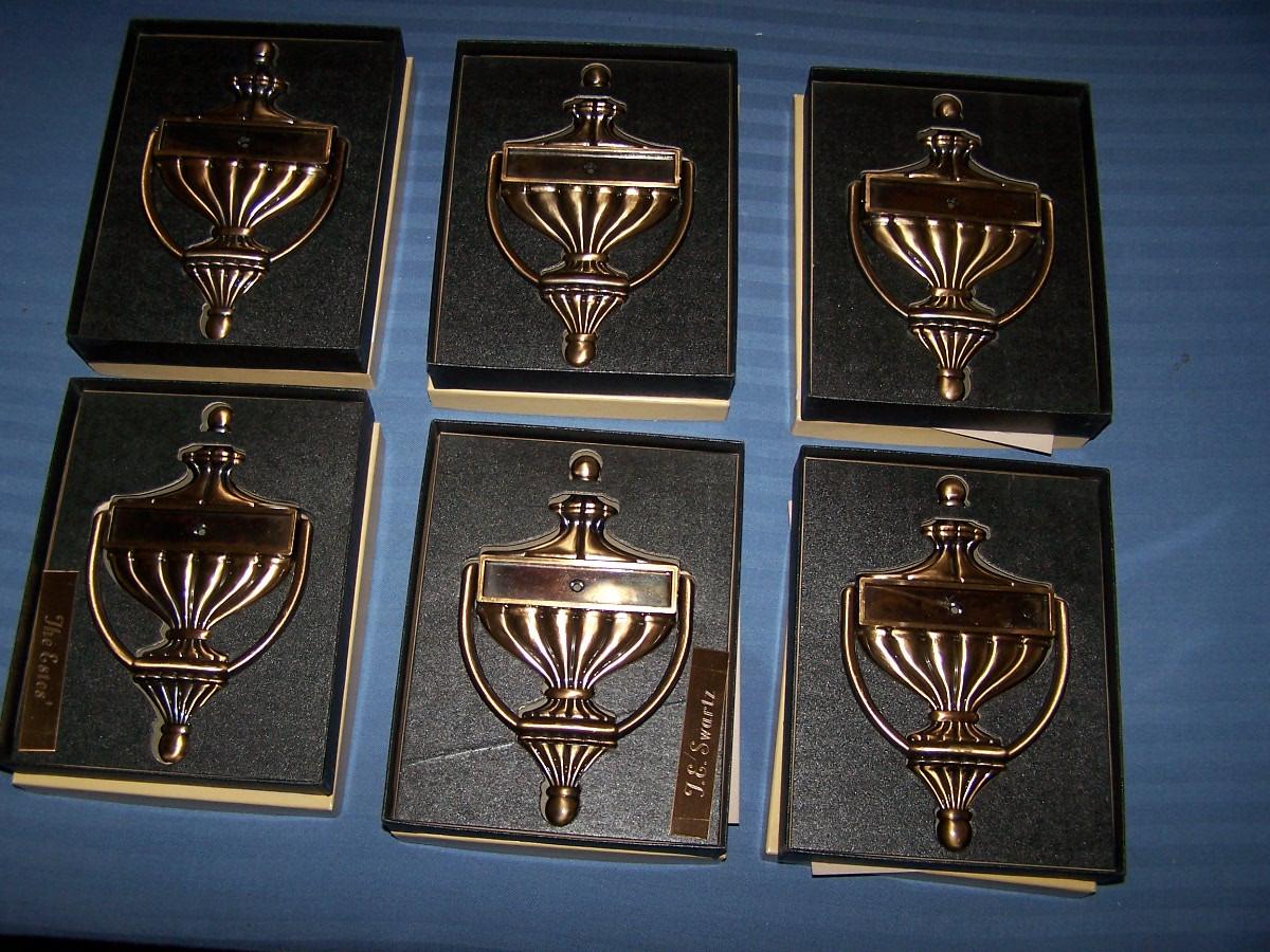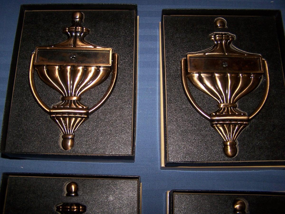 THESE ARE 6 NEW IN BOX METAL GEORGIAN DOOR KNOCKERS.... THEY ARE 7 3/8'' TALL... SLIGHT WEAR....