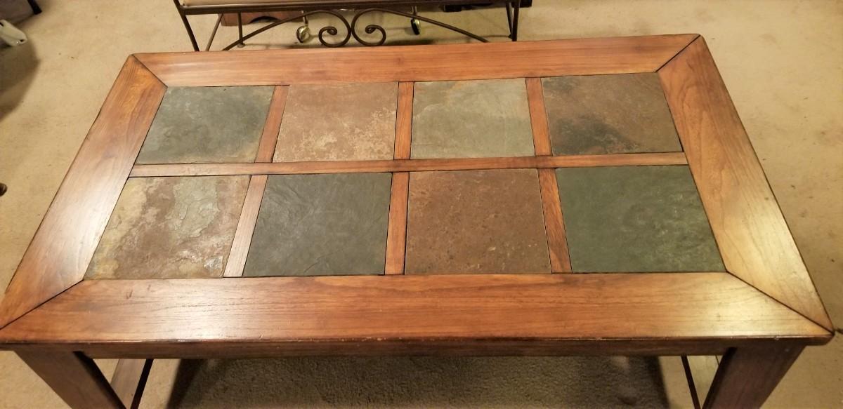 This contemporary coffee table has a great look - good neutral colors - inlaid tile on top. Measures 28" x 48", 19.5" tall. Good used condition. On wheels so it's easy to move.