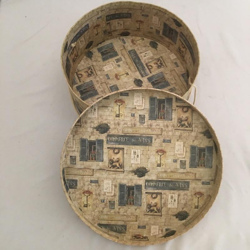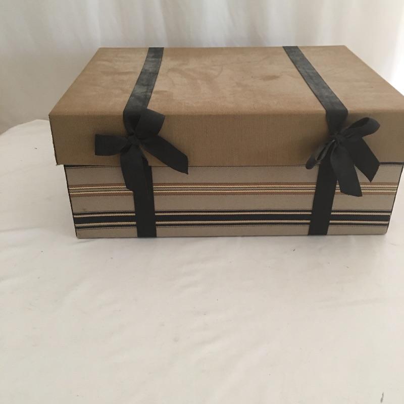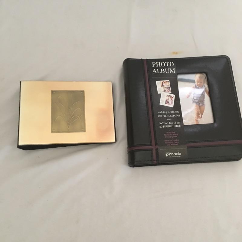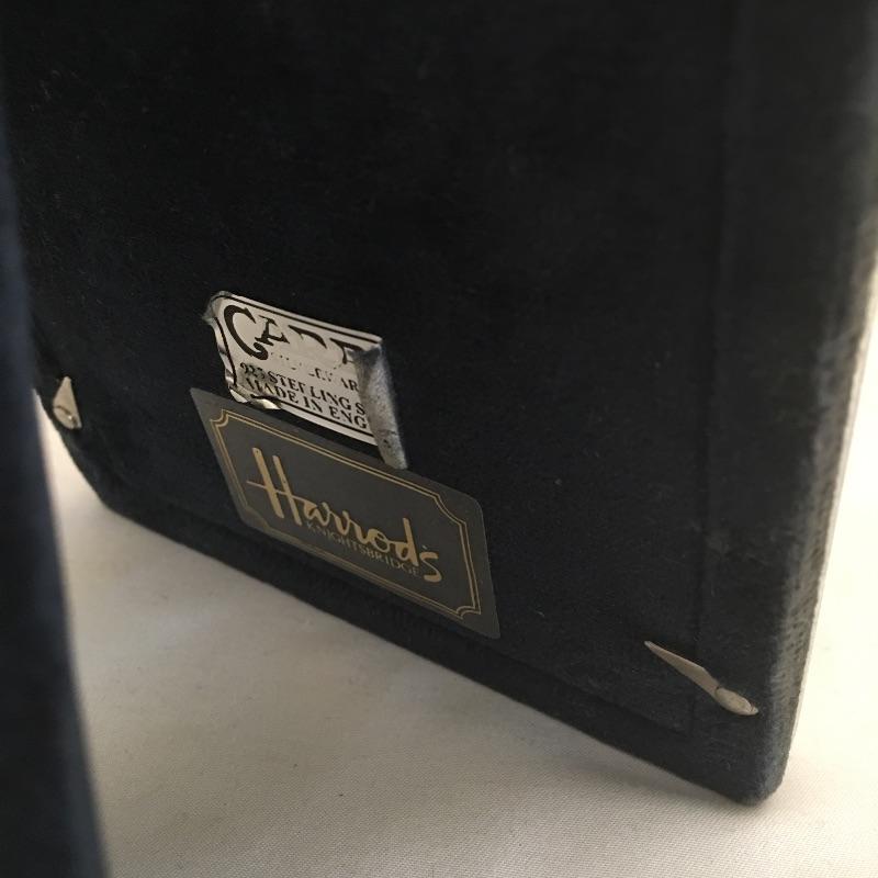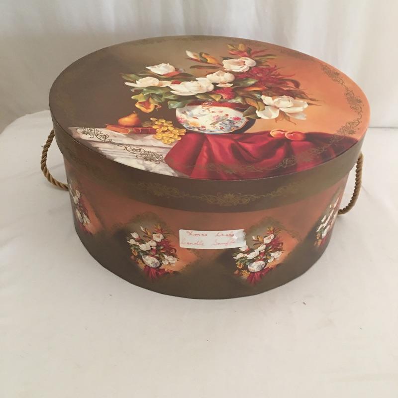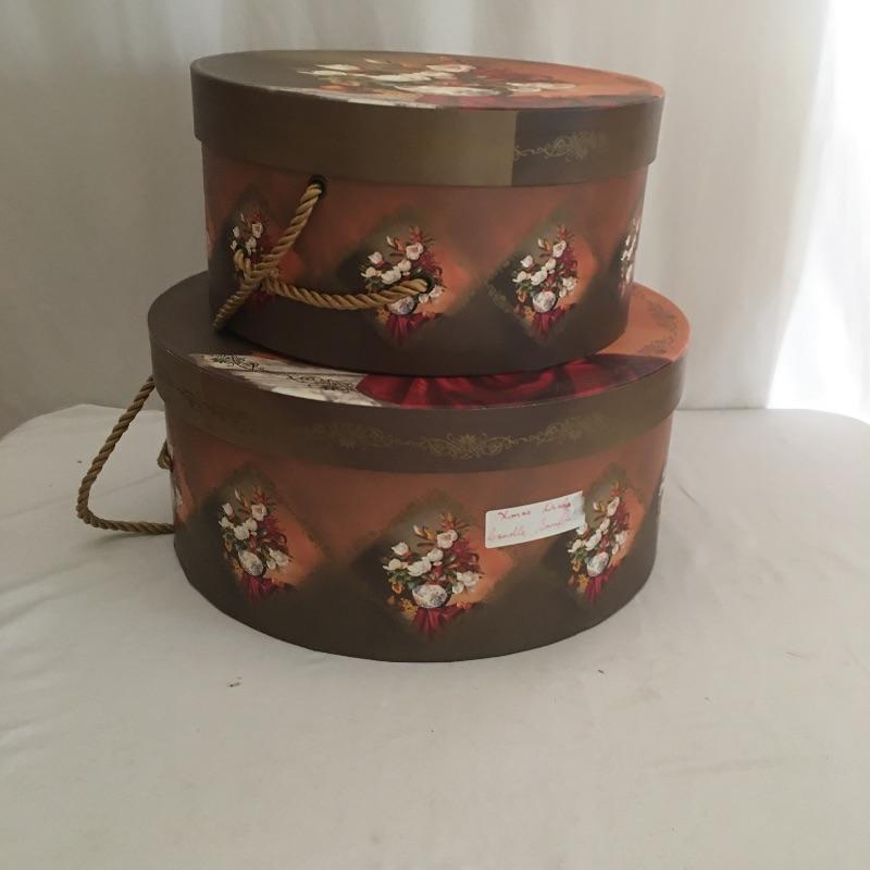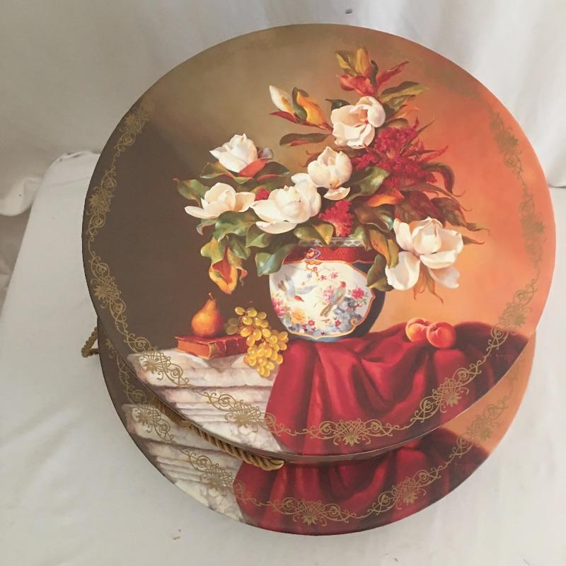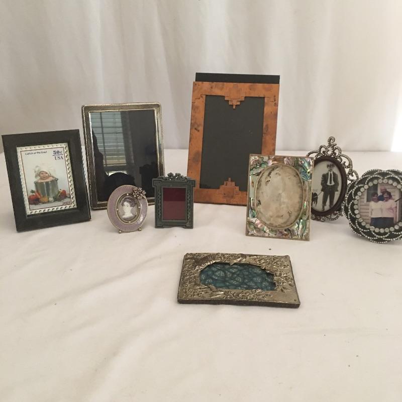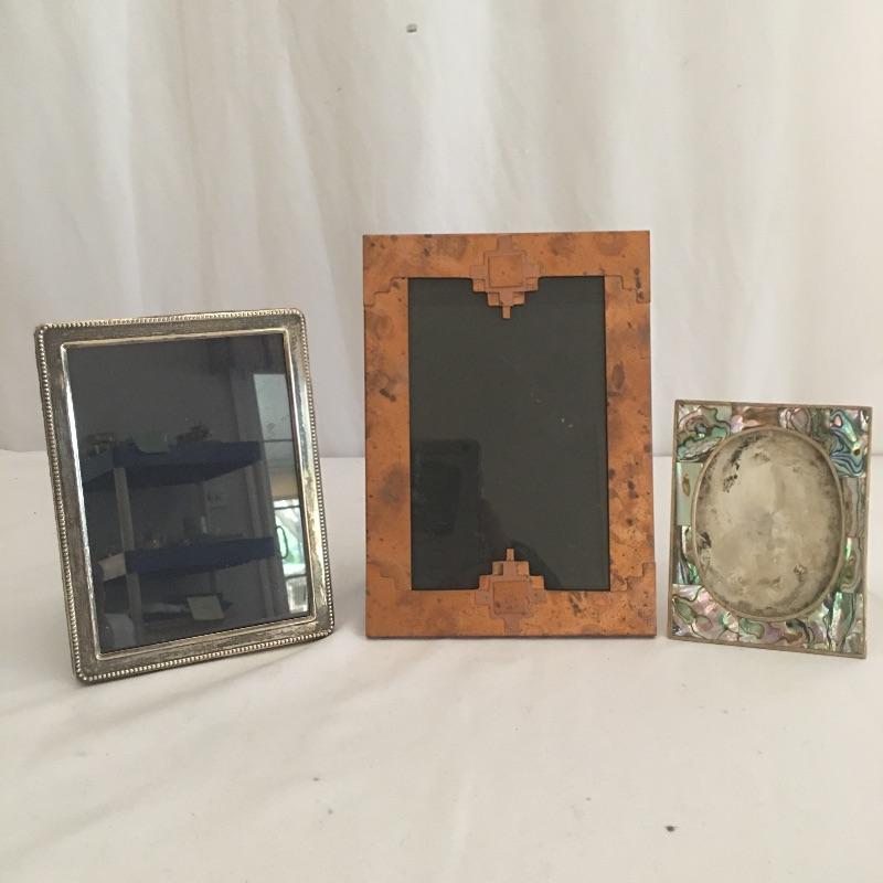 This large lot includes three round boxes, rectangular box, an assortment of picture frames in many shapes, sizes and materials including one from Harrods marked sterling silver. Largest box measures 12” x 16” x 6.75”.