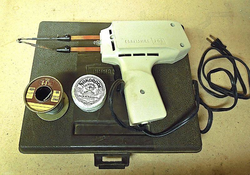 Craftsman 200 soldering gun in case with 3 extra copper tips, soldering paste and a roll of 40/60 alloy resin solder.