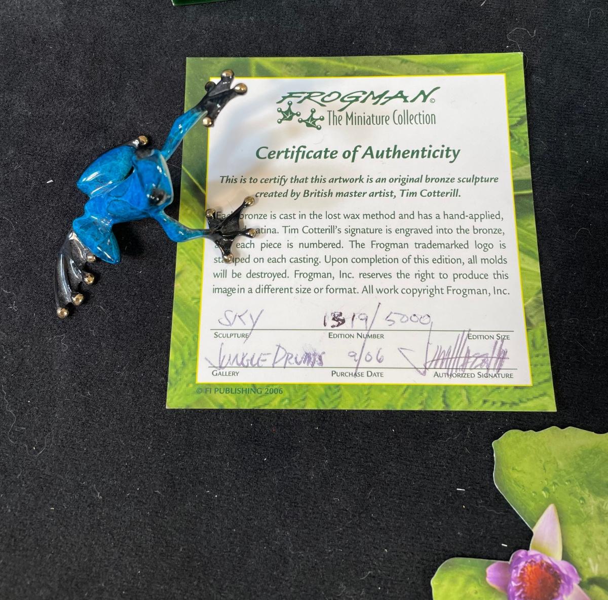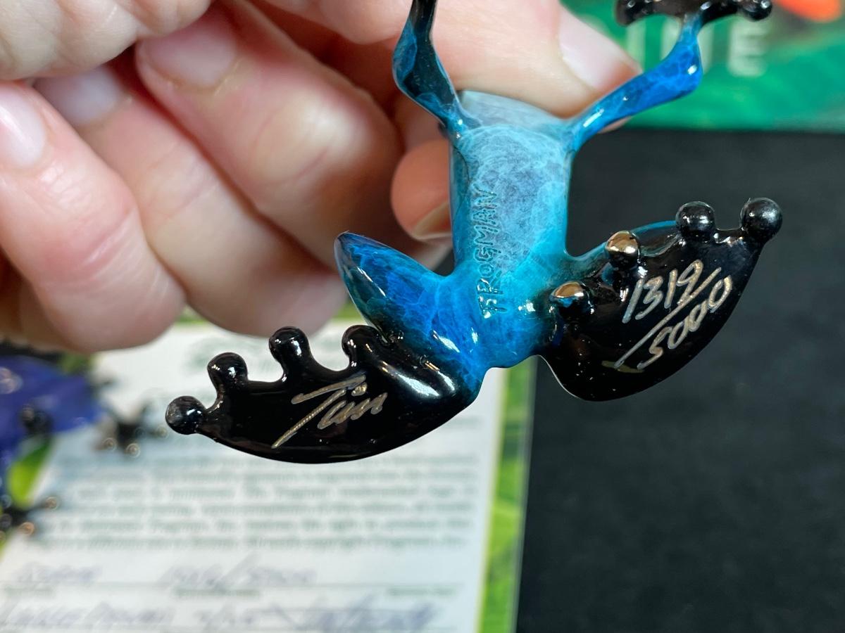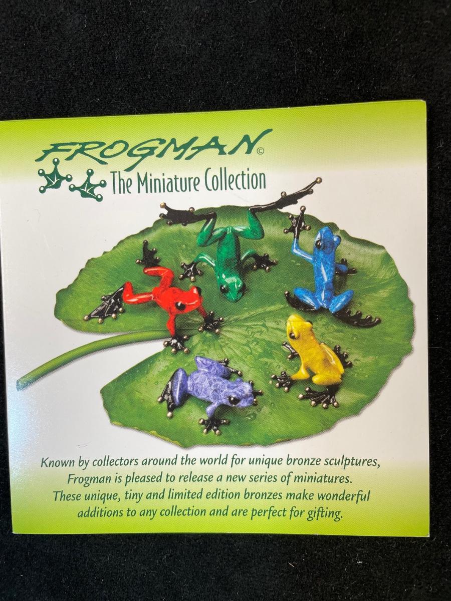 Frogman sold out piece from 2006. Signed and numbered 1319/5000 Enamel over bronze measures 2.5" X 2" X 1.5" Includes COA. Also included is a coffee table book on Costa Rica