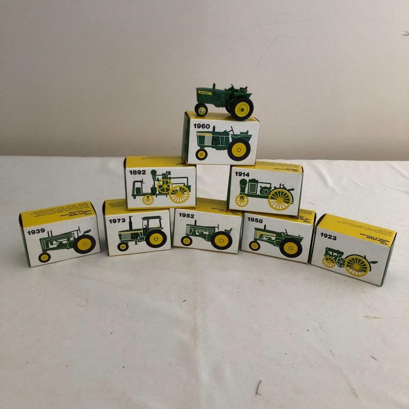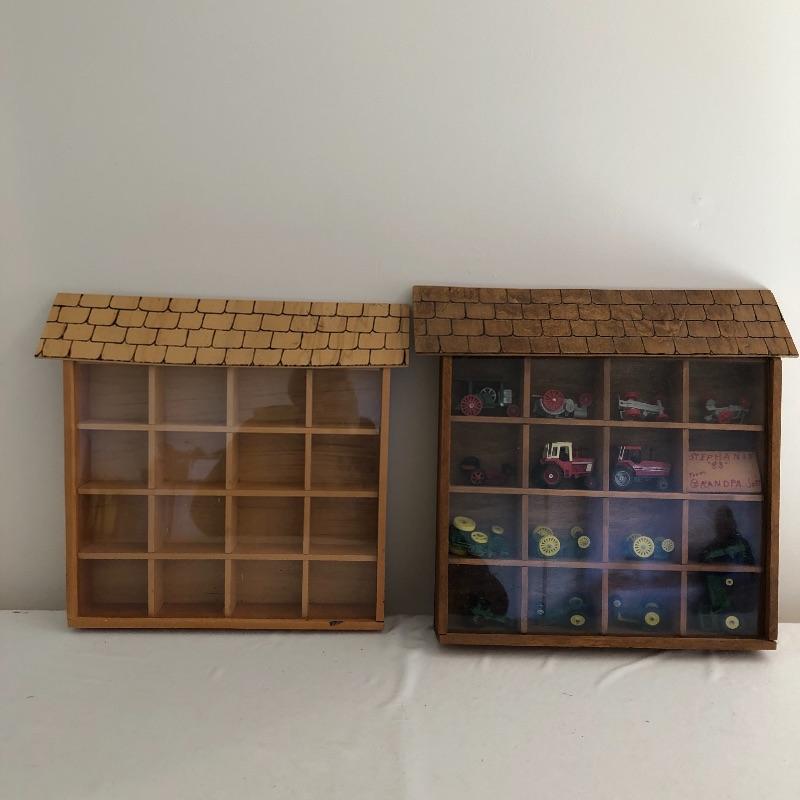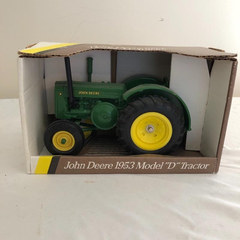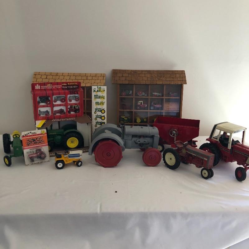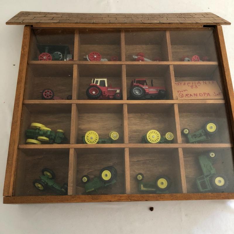 A great gift for the farmer in your family. Lot includes two boxes of eight John Deere miniature toy tractors, six International Harvester toy tractors, fully wooden (including wood wheels) Fordson tractor, two display cases for miniature tractors, 1953 John Deere and more. Fordson tractor measures 7” x 12” x 6.75”. Most are die cast metal, although we cannot confirm each piece in the shadow box. The red International tractor has a plastic roof and most appear to have plastic wheels.