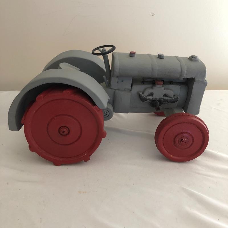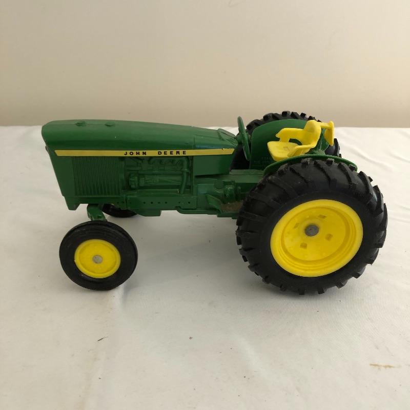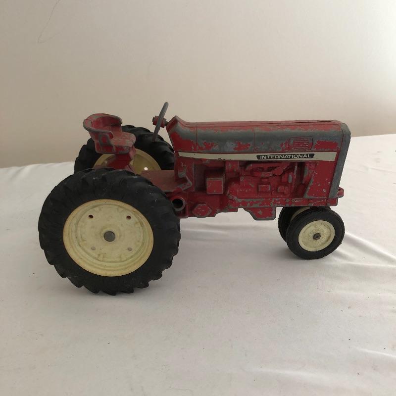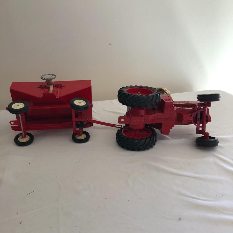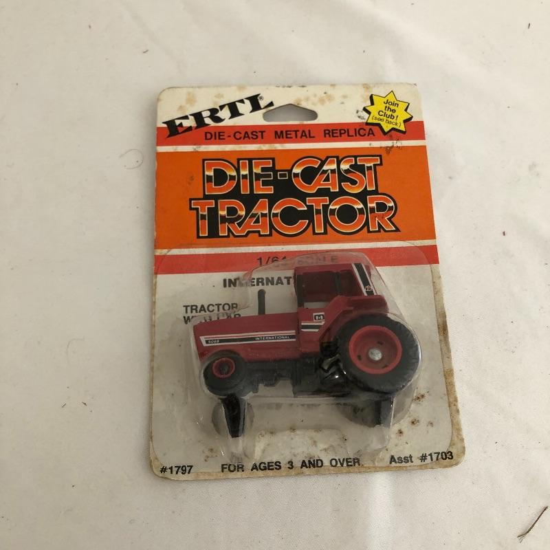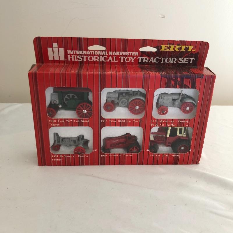 A great gift for the farmer in your family. Lot includes two boxes of eight John Deere miniature toy tractors, six International Harvester toy tractors, fully wooden (including wood wheels) Fordson tractor, two display cases for miniature tractors, 1953 John Deere and more. Fordson tractor measures 7” x 12” x 6.75”. Most are die cast metal, although we cannot confirm each piece in the shadow box. The red International tractor has a plastic roof and most appear to have plastic wheels.