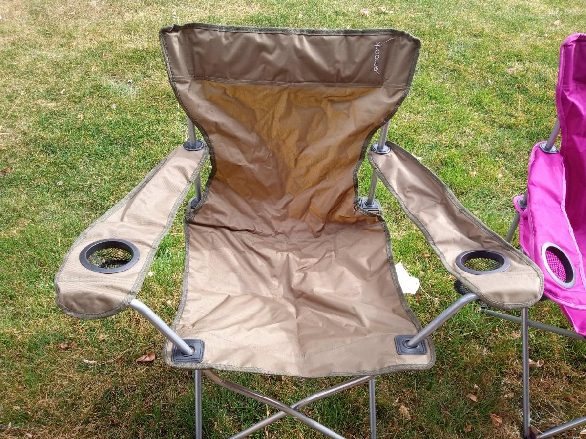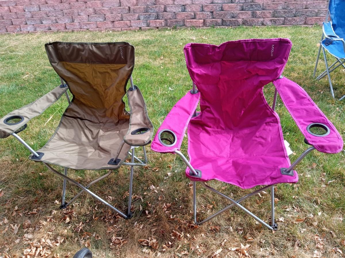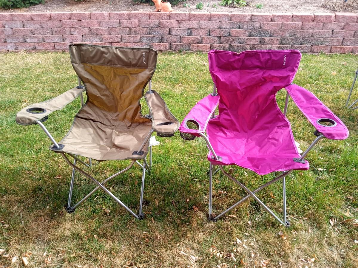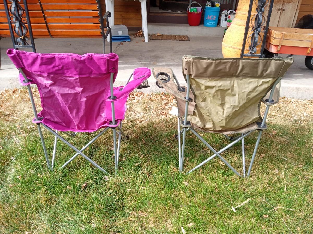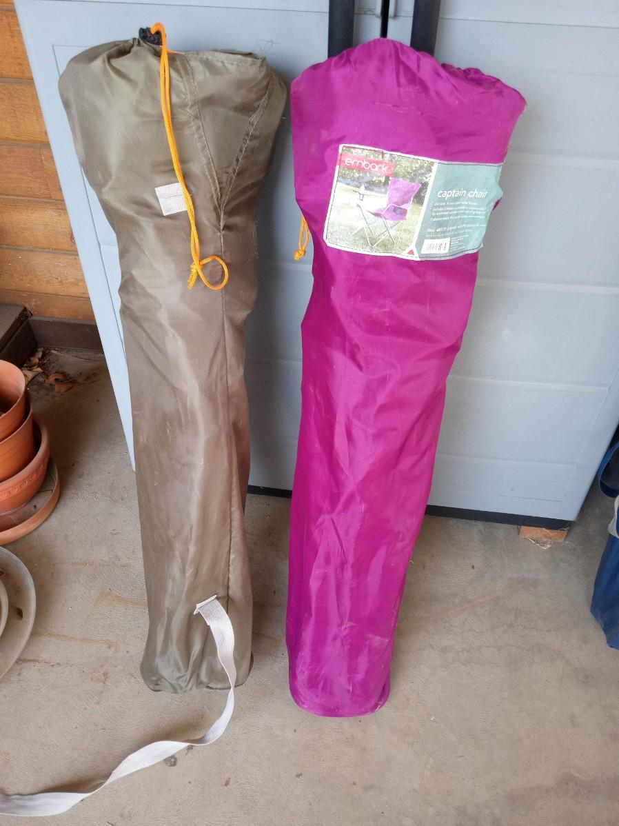 BOTH CHAIRS ARE IN VERY GOOD SHAPE BUT THE STRAP ON 1 OF THE CARRY SLEEVES IS BROKE