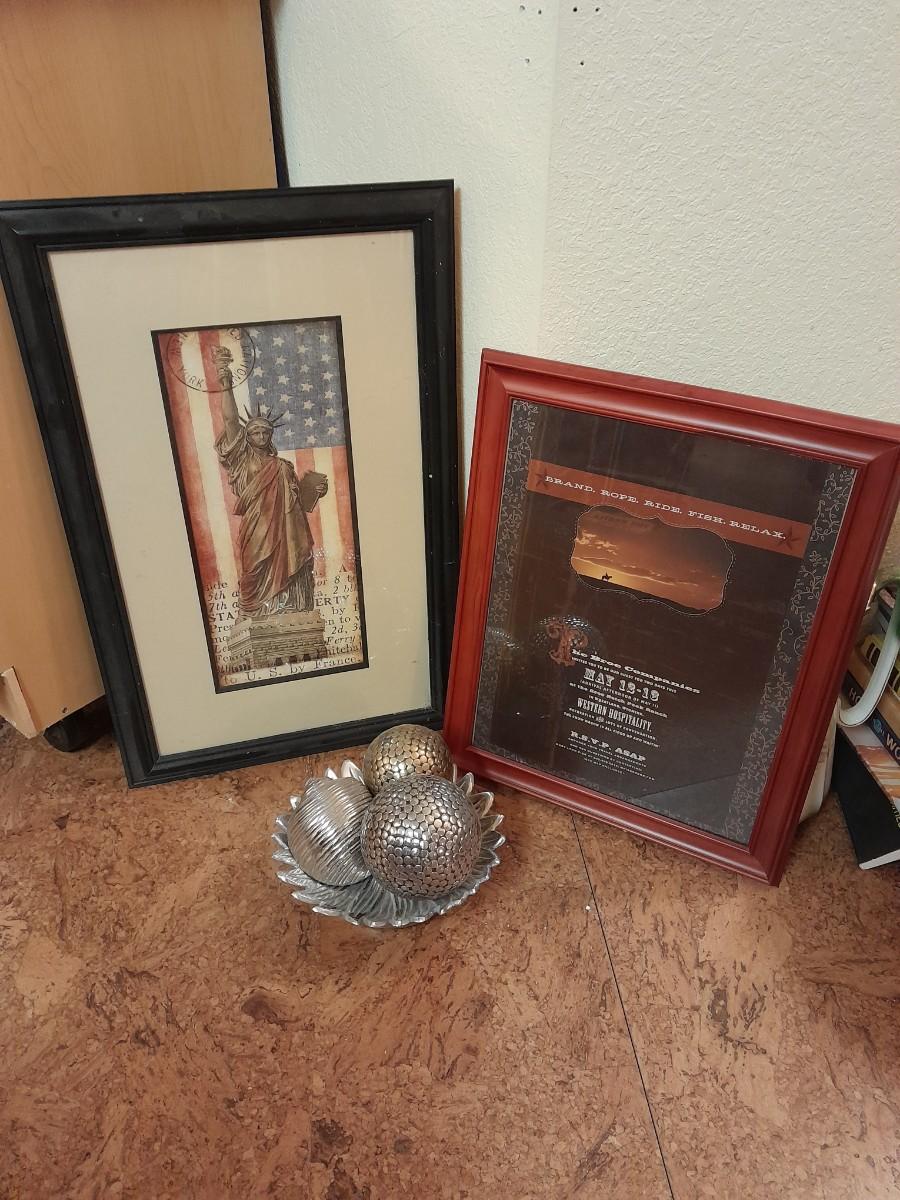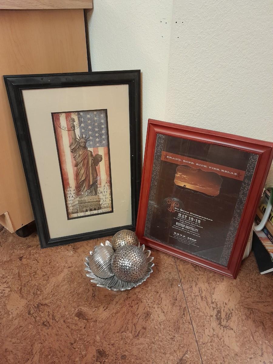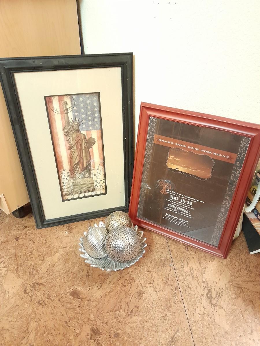 TWO FRAMED PICTURES AND THREE SHAPED BALLS IN A PLATE HOME DECOR.
