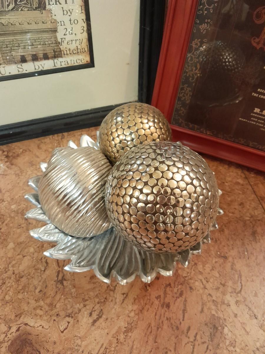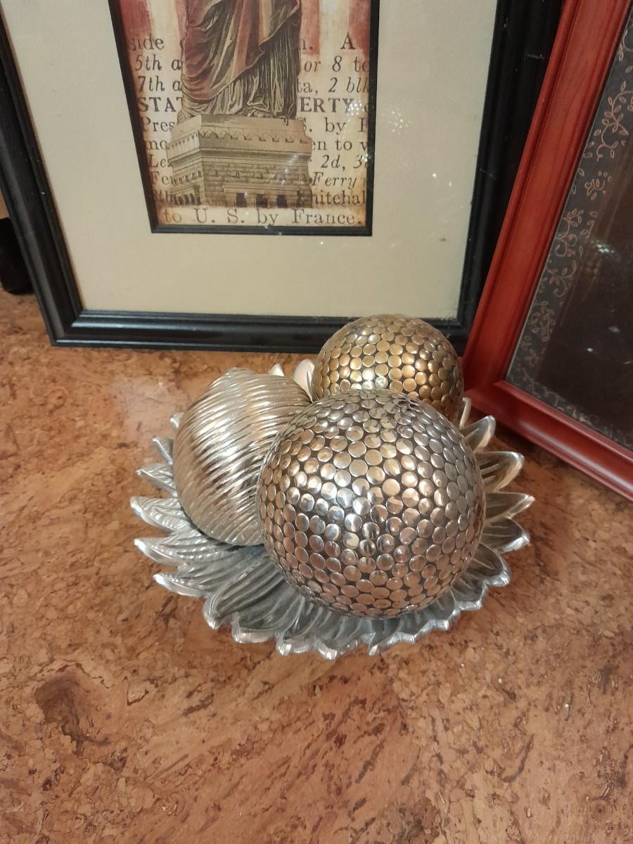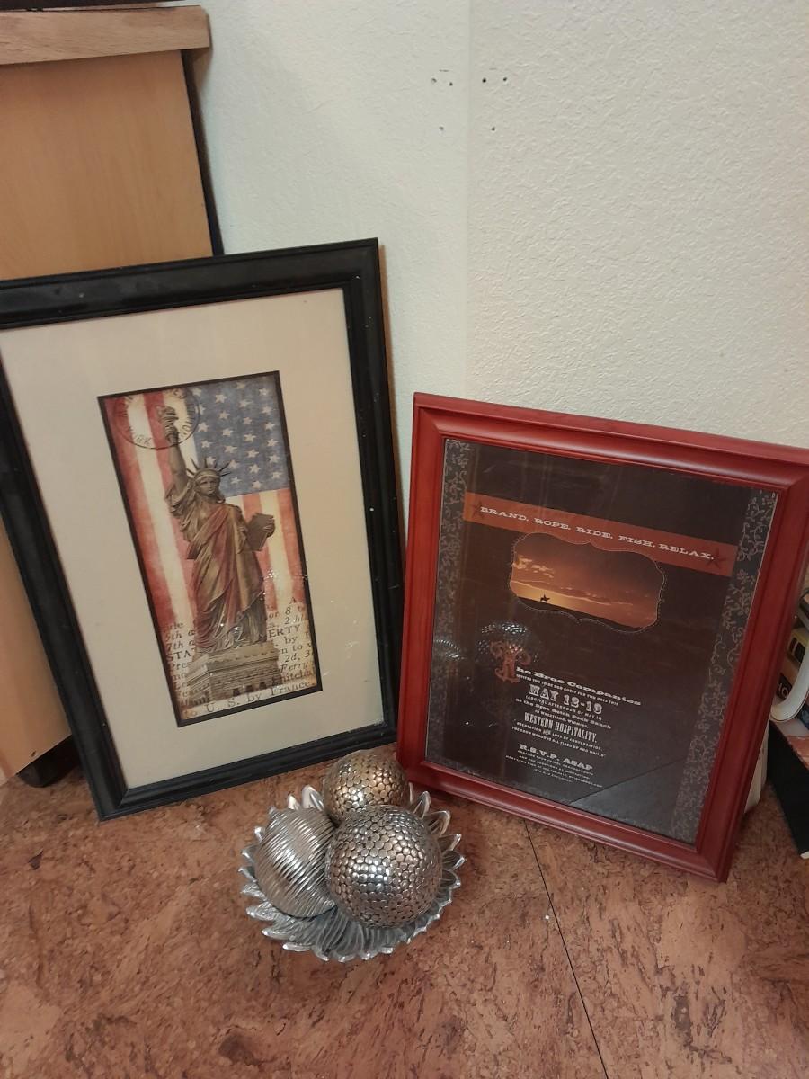 TWO FRAMED PICTURES AND THREE SHAPED BALLS IN A PLATE HOME DECOR.