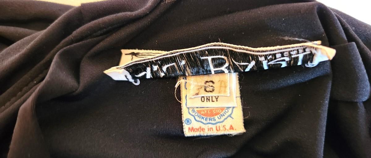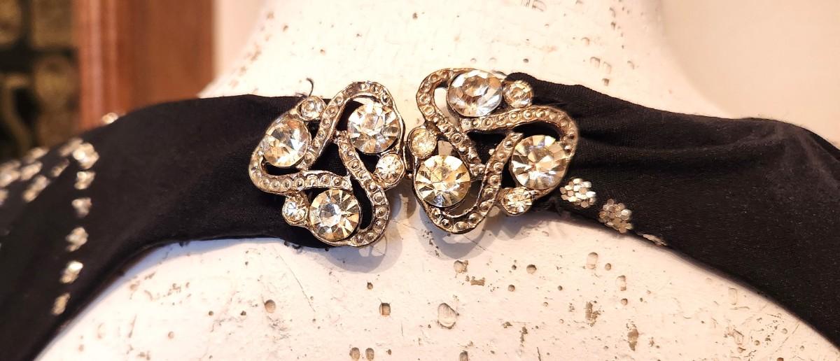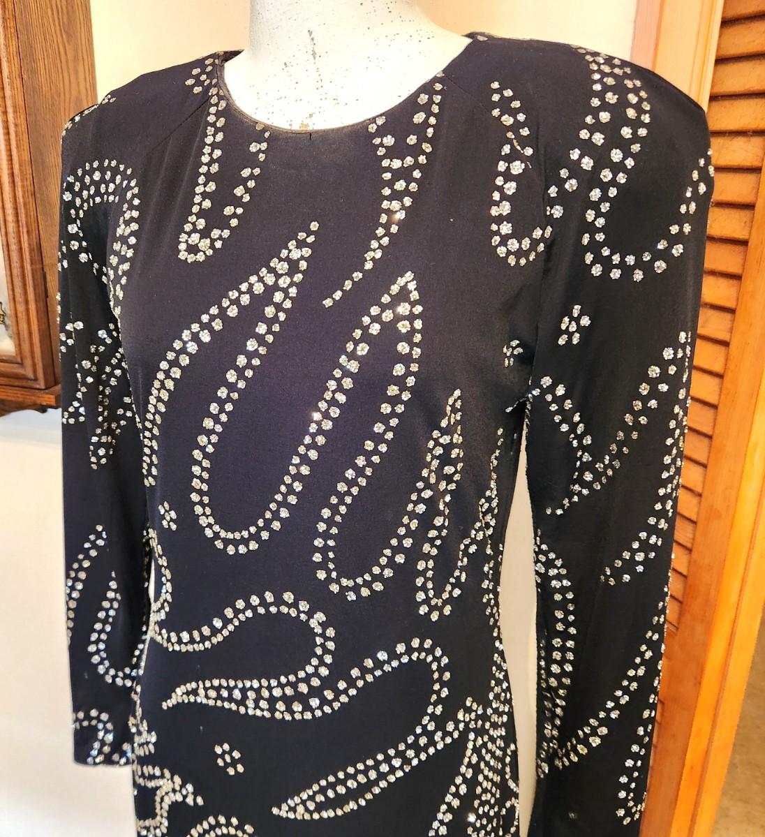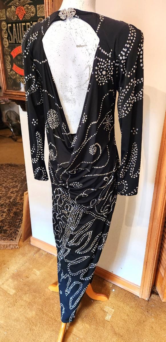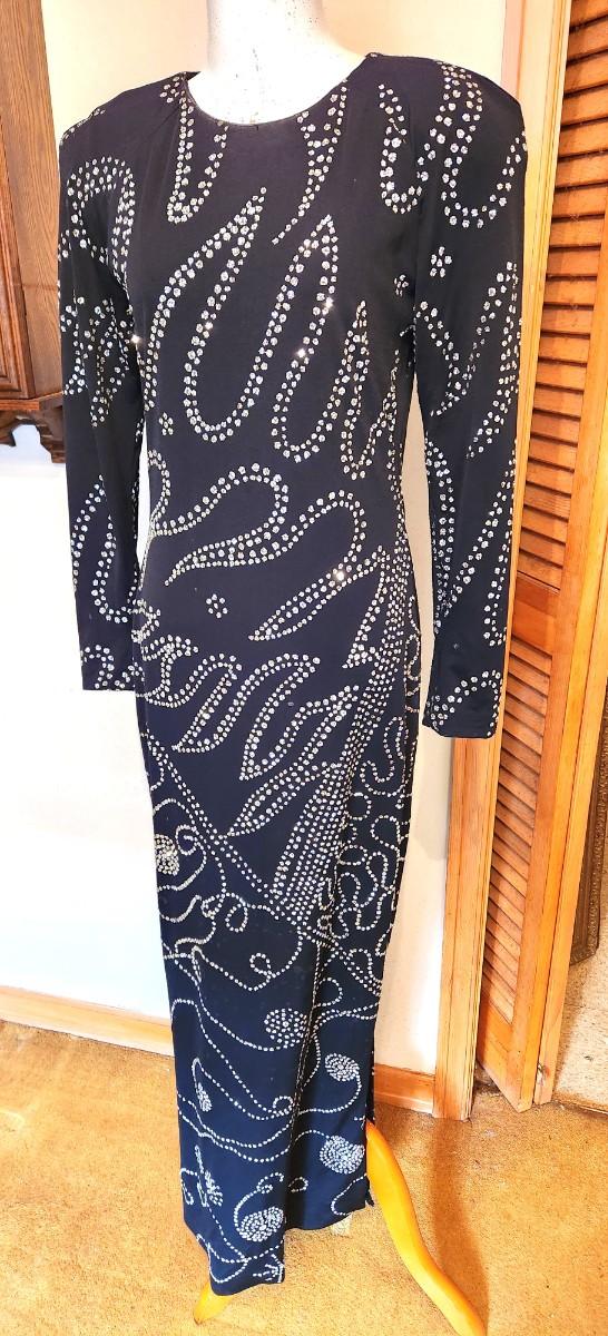 Excellent condition - Size 6 (runs small) - really a pretty vintage head-turner of an evening gown with a nice rhinestone clasp on the reverse (shown) and a drop down back. If you've got the figure for this one, it would be a show stopper!!! Label says A J Bari.