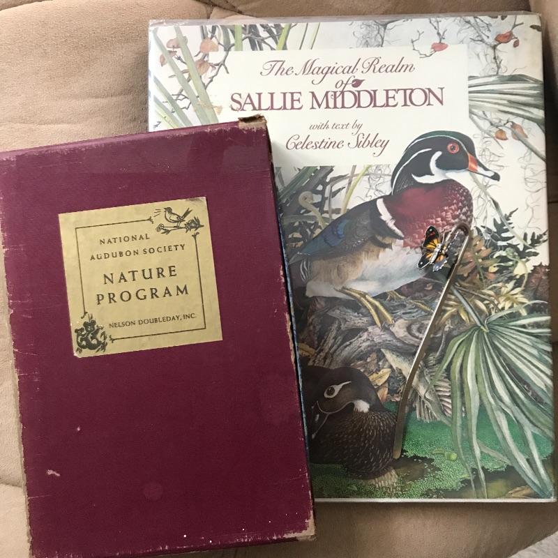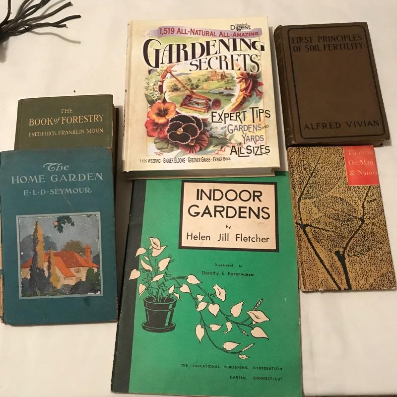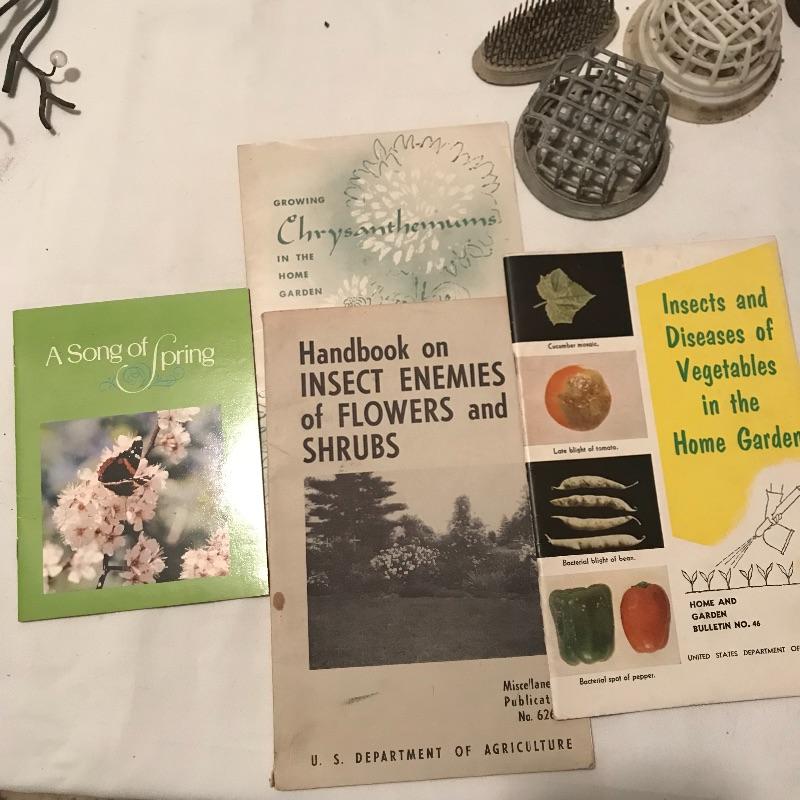 Turn your thumb green this year! Eleven vintage botanical themed books and pamphlets along with a metal branch candle holder, three metal and one white plastic flower frogs. Books vary from Thoreau’s On Man & Nature to 1,519 All Natural All Amazing Gardening Secrets and a case of Nature Program booklets from the Audubon Society. See photos. No shipping.