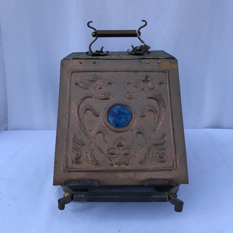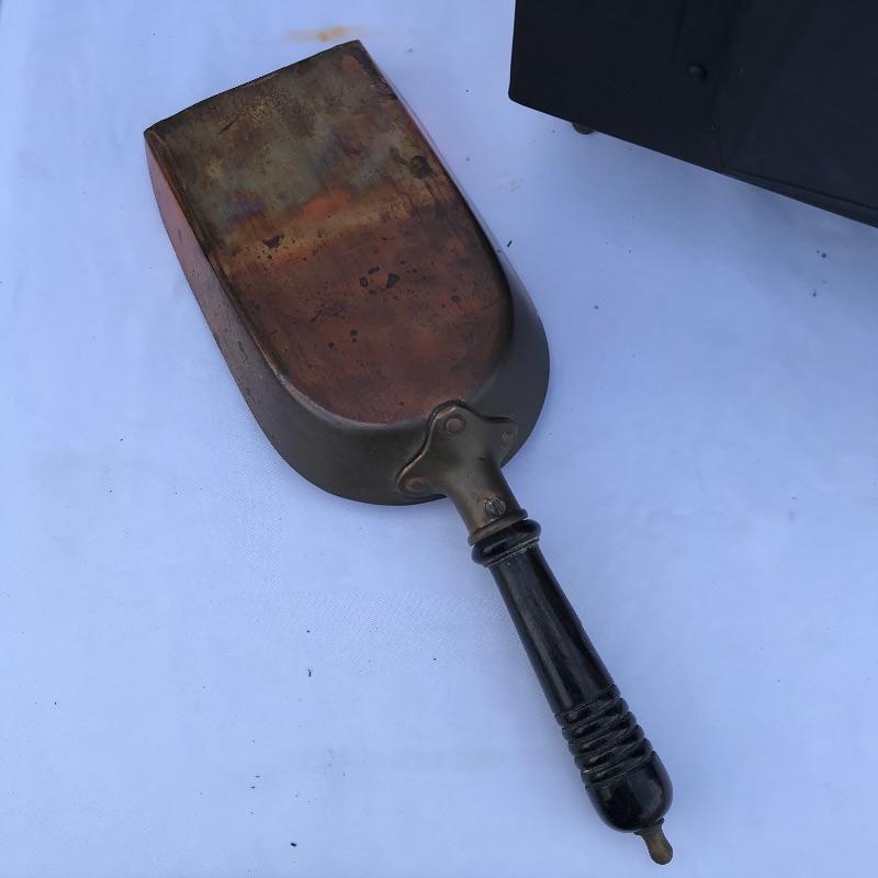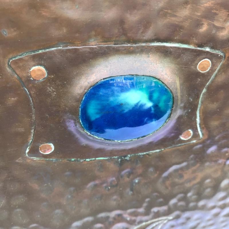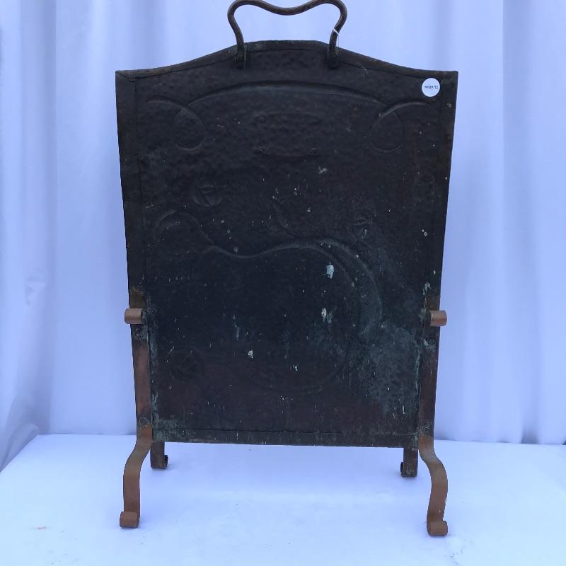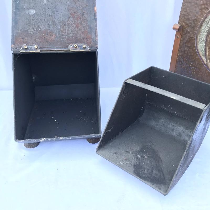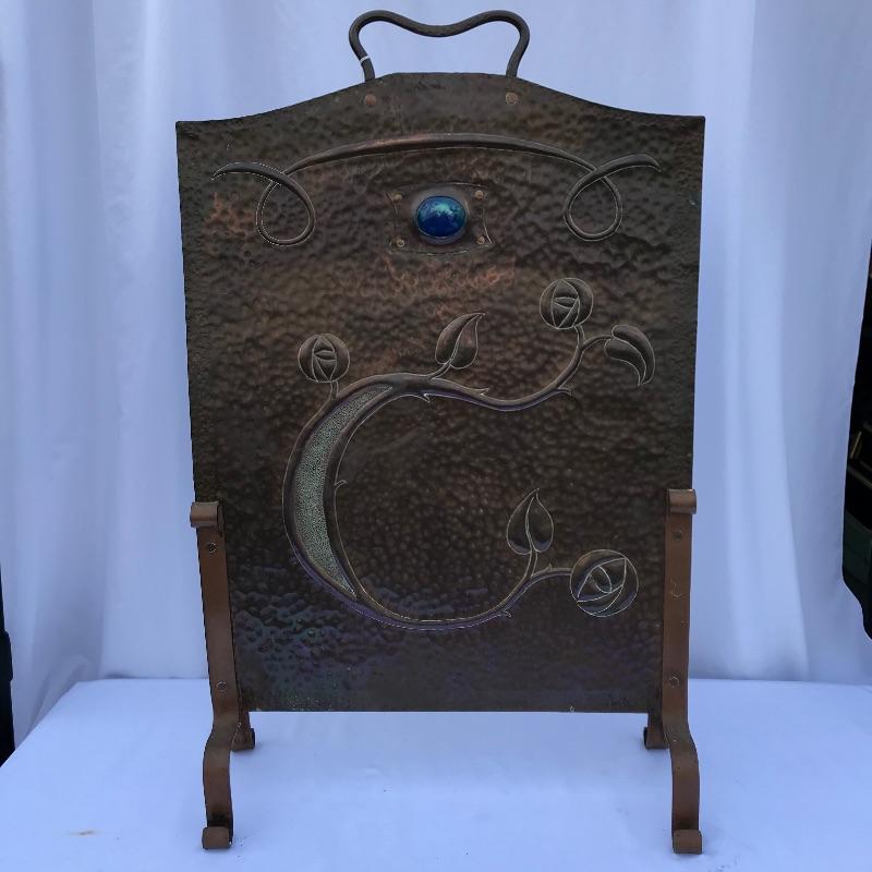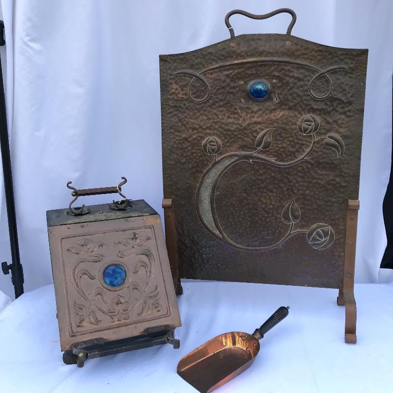 Gorgeous vintage hand hammered copper fireplace set featuring screen, coal caddy and shovel. Both coal caddy and screen have a bold blue enamel centerpiece in excellent condition. The brightly copper colored shovel has a wooden handle. Check out the hammering and detail in the screen with the famous English Glasgow Rose motif! Executor gave us the info on these pieces so they are not verified. Screen measures approximately 19” x 30.5”, coal caddy measures approximately 10.75” x 17.25” x 15.5”. See photos.