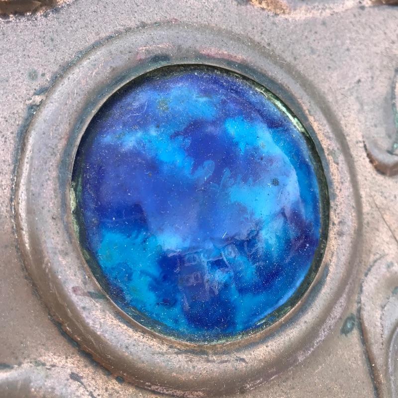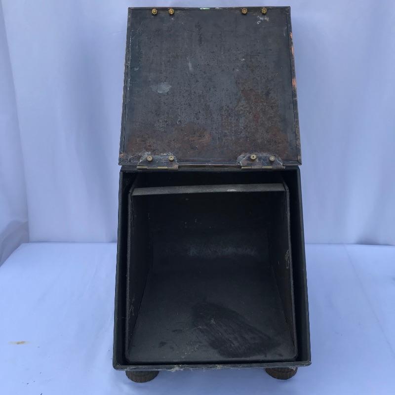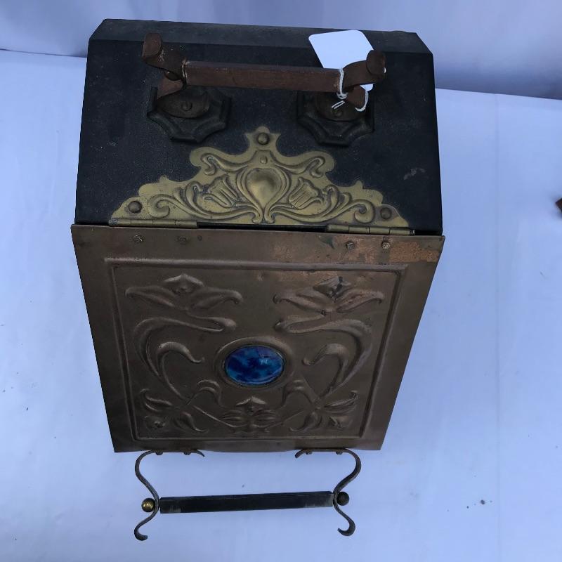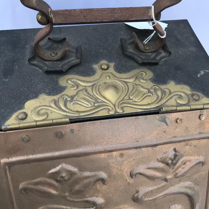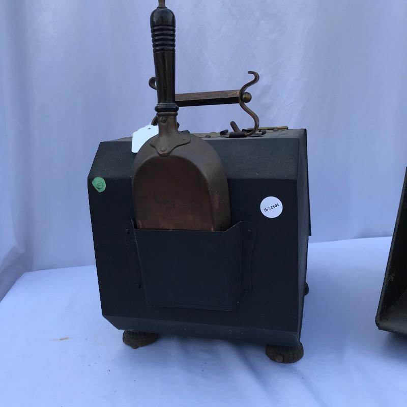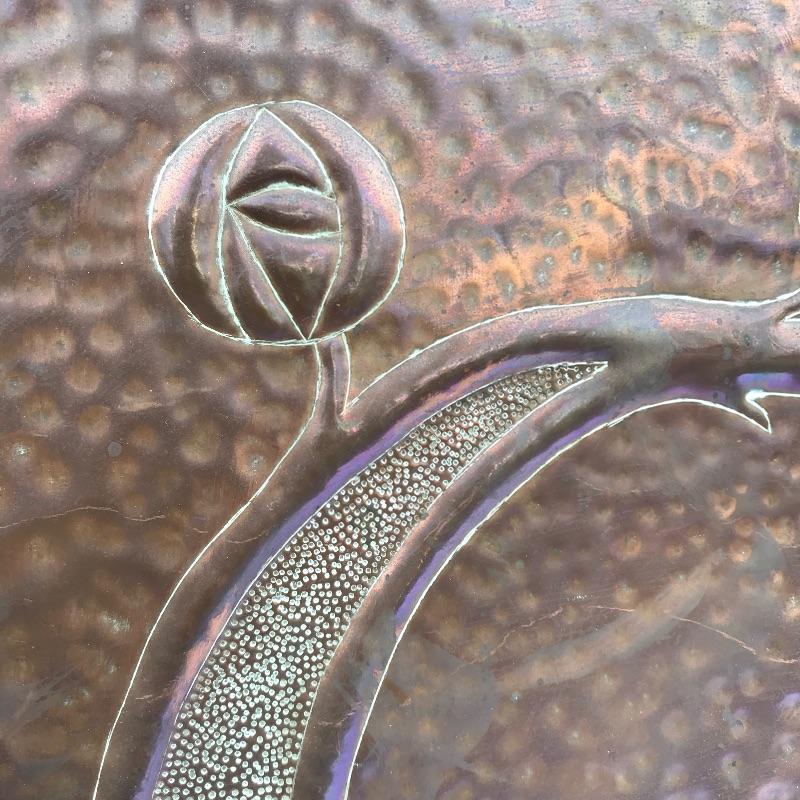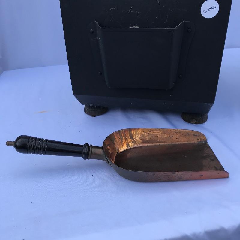 Gorgeous vintage hand hammered copper fireplace set featuring screen, coal caddy and shovel. Both coal caddy and screen have a bold blue enamel centerpiece in excellent condition. The brightly copper colored shovel has a wooden handle. Check out the hammering and detail in the screen with the famous English Glasgow Rose motif! Executor gave us the info on these pieces so they are not verified. Screen measures approximately 19” x 30.5”, coal caddy measures approximately 10.75” x 17.25” x 15.5”. See photos.