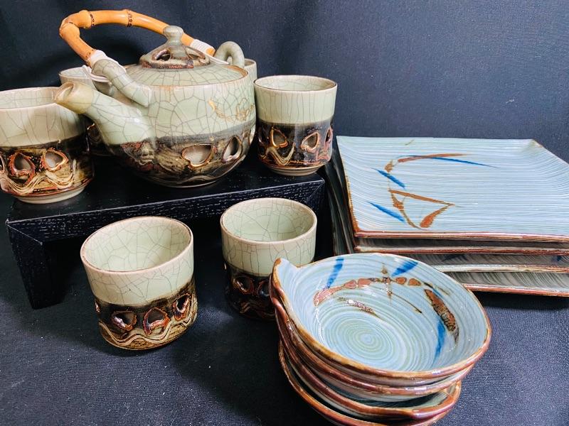 Vintage Japanese Somayaki tea set that includes teapot & six mugs, and four vintage square Japanese sushi plates with matching soy & wasabi dipping bowls. Please see pictures for sizing/condition. MHW Please see all pictures for content of the lot, condition of the lot, and measurements if taken. Pictures are the best representation of the items listed and items are untested unless indicated in description. Thank you for looking and have fun bidding!