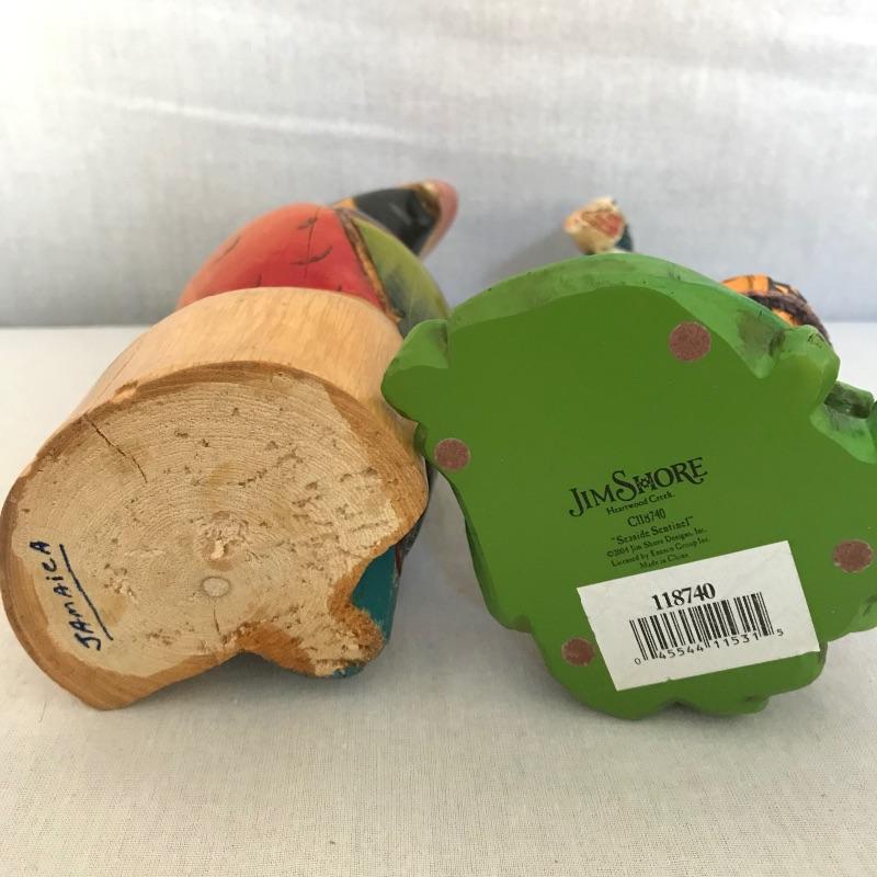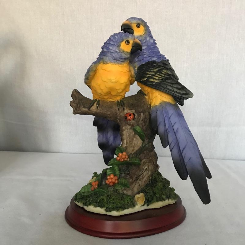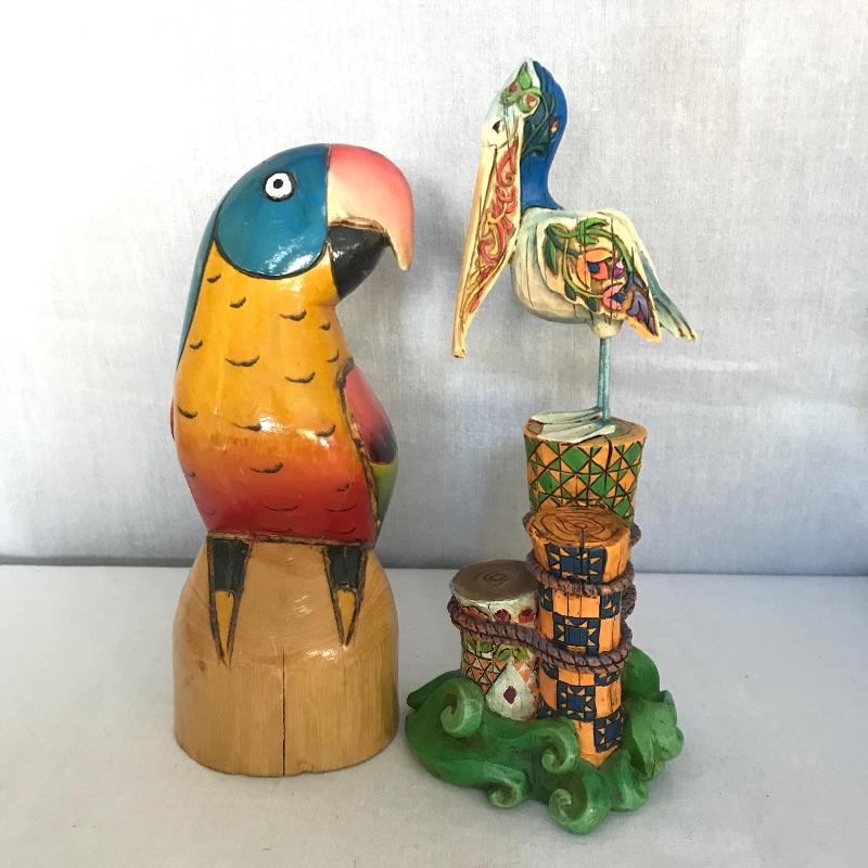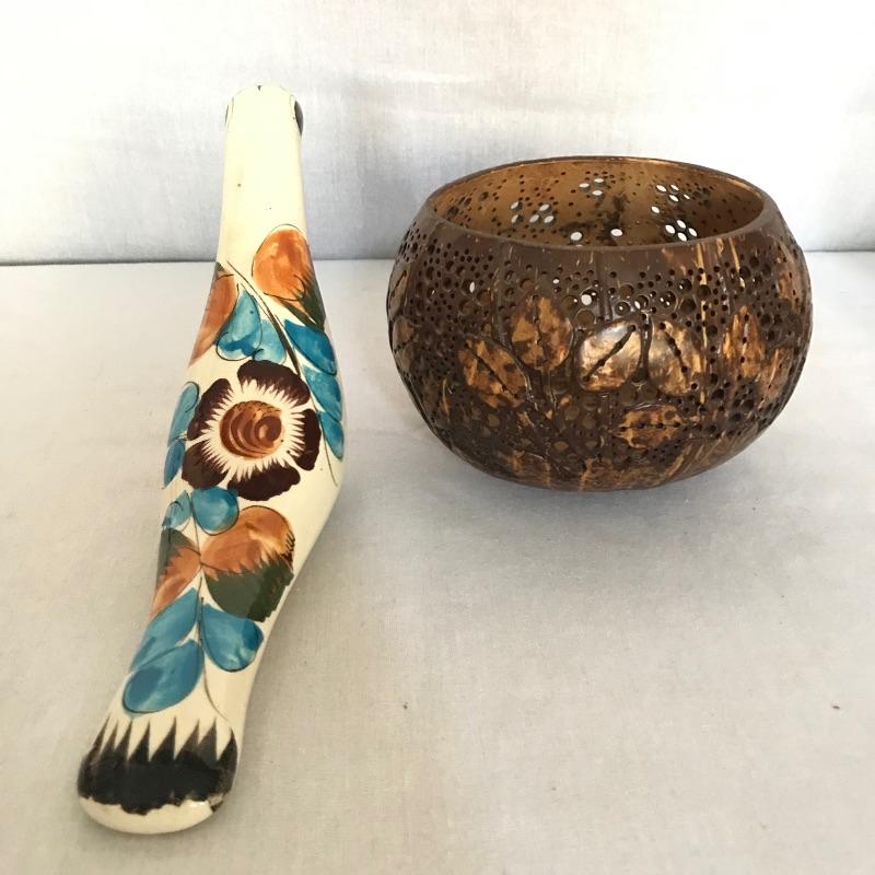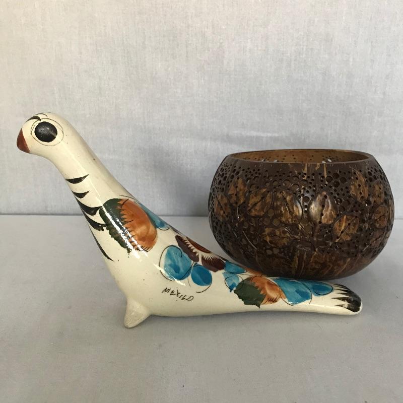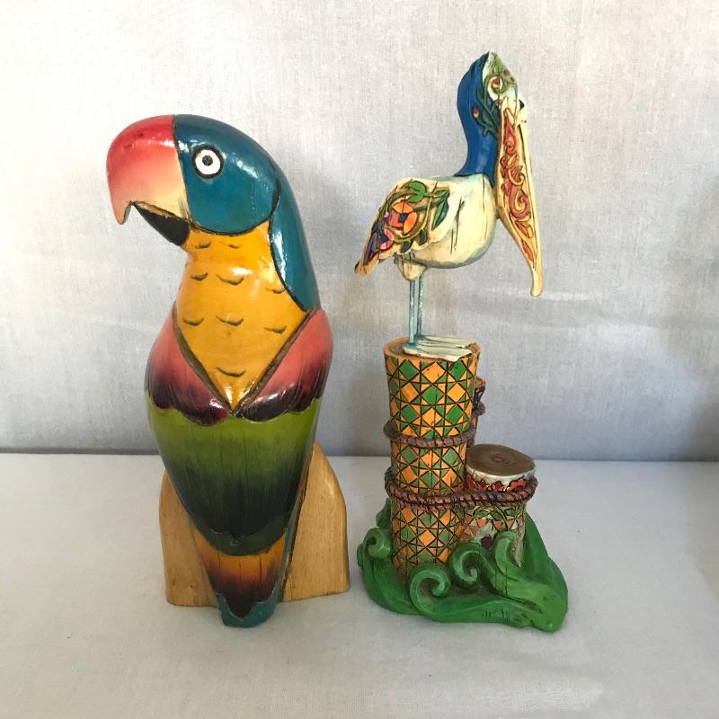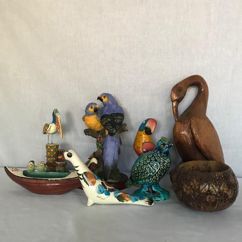 Fun filled colorful collection of tropical birds from across the world. A lightweight parrot and heavy wooden bird made in Jamaica. Other bright birds created in China, Italy, Japan and Mexico. The bright blue bird has a chip on the underside of its tail. Lot also includes a carved coconut shell perfect for a votive candle. The Montefiori pair is attached to its wooden base. See photos, no shipping.