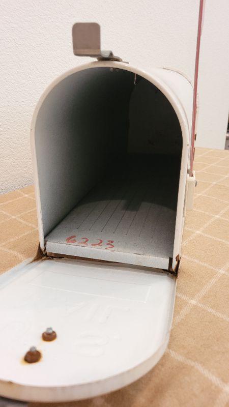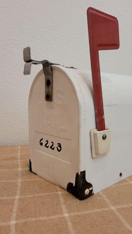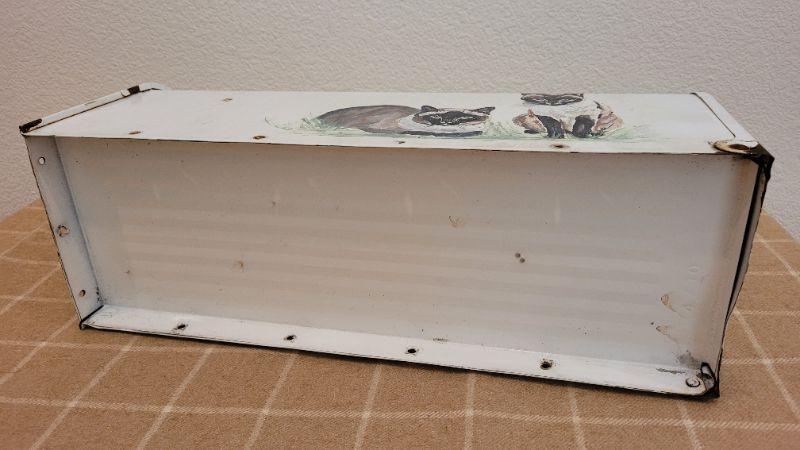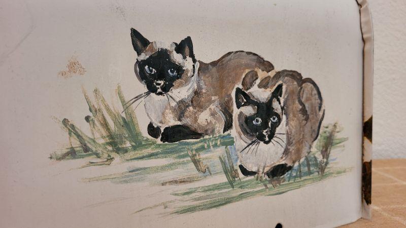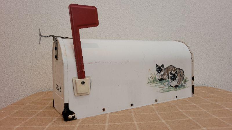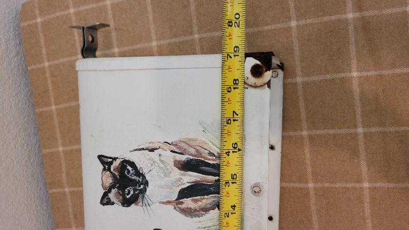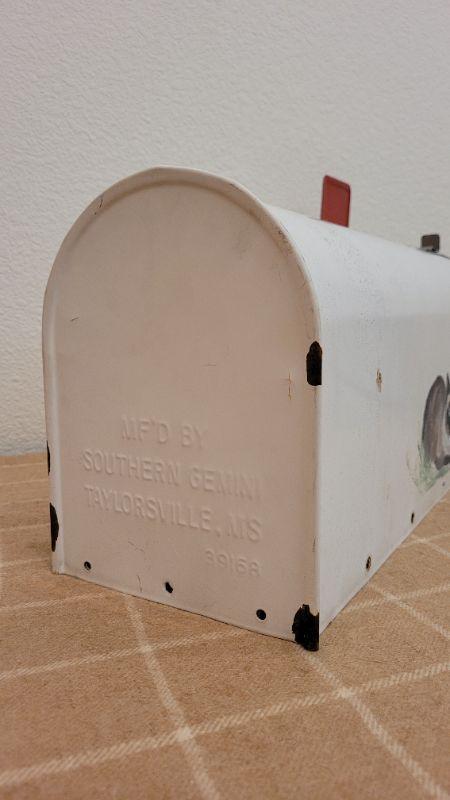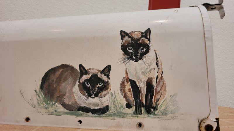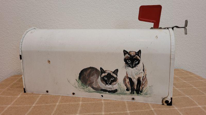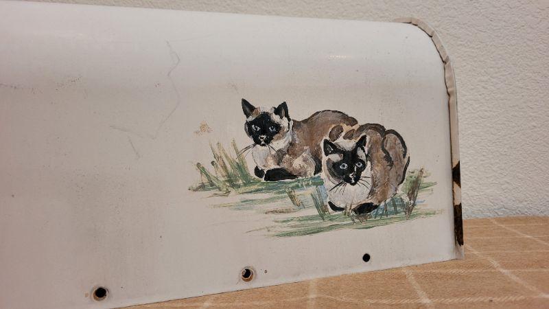 Lot 226: Vintage White SOUTHERN GEMINI Metal Mailbox w/ Handpainted Cat Accent Art