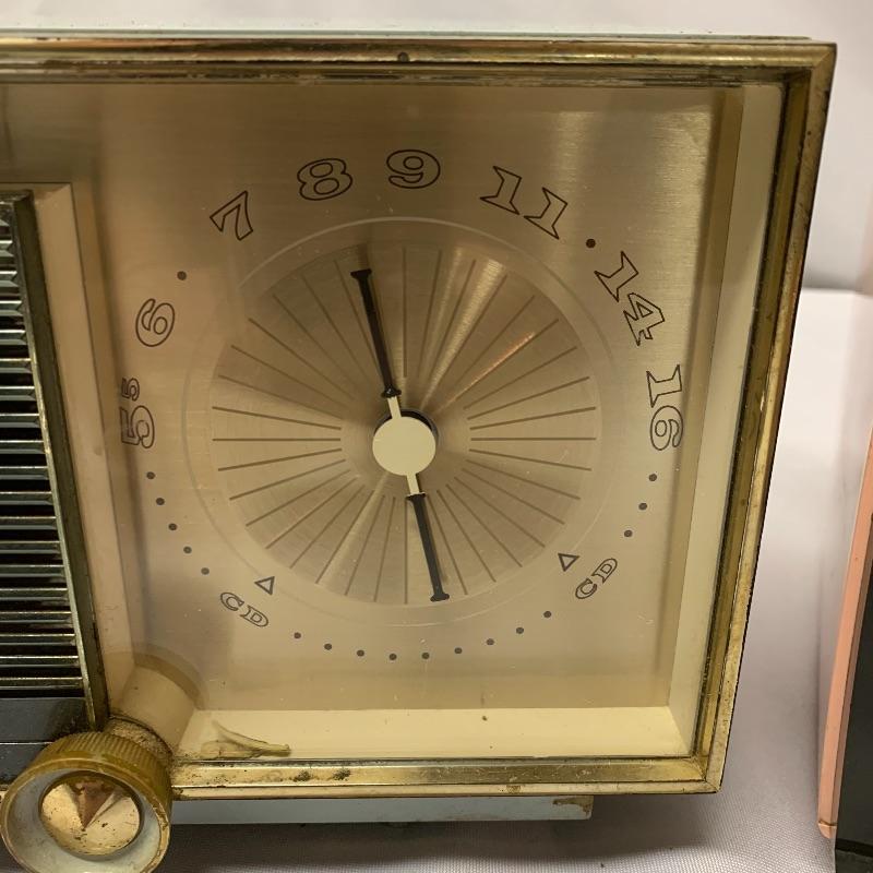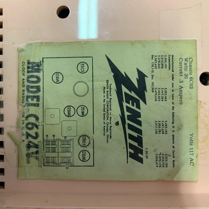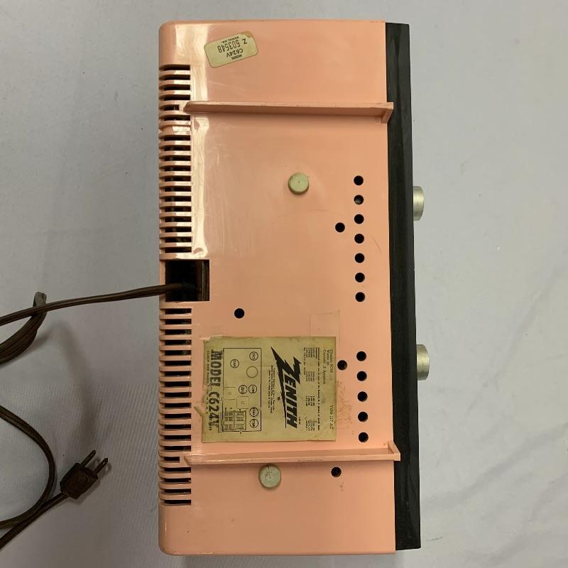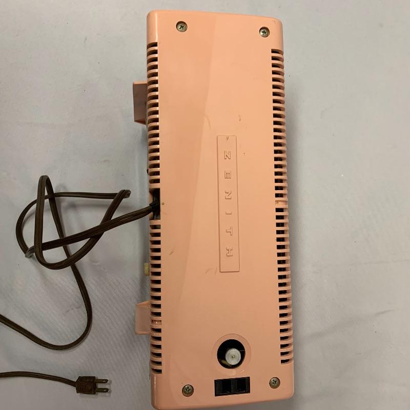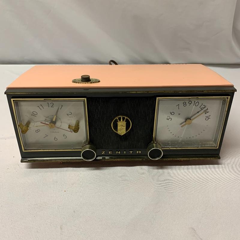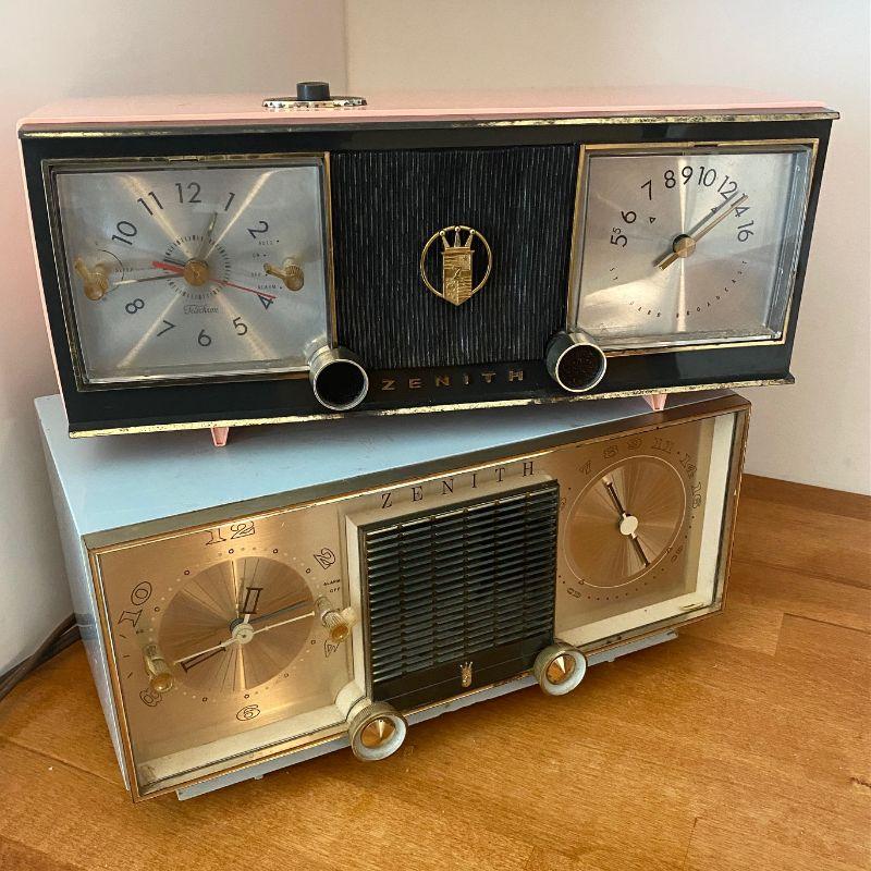 Two Zenith clock radios. The blue unit is a Zenith model L516B and powered on when tested. The clock on the right is a model C624V and powered on when tested. This unit is a beautiful pink color.
