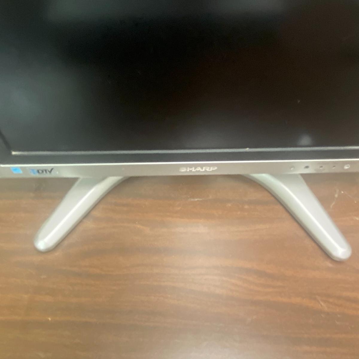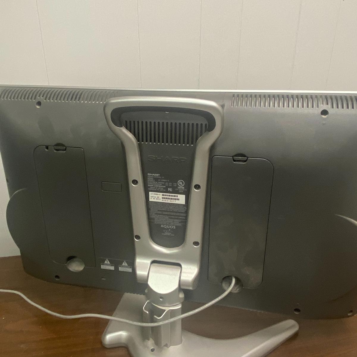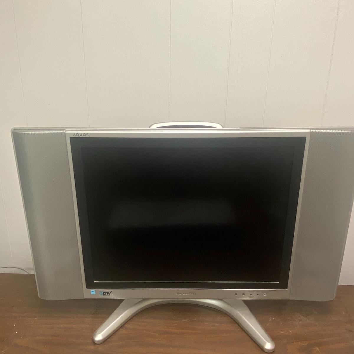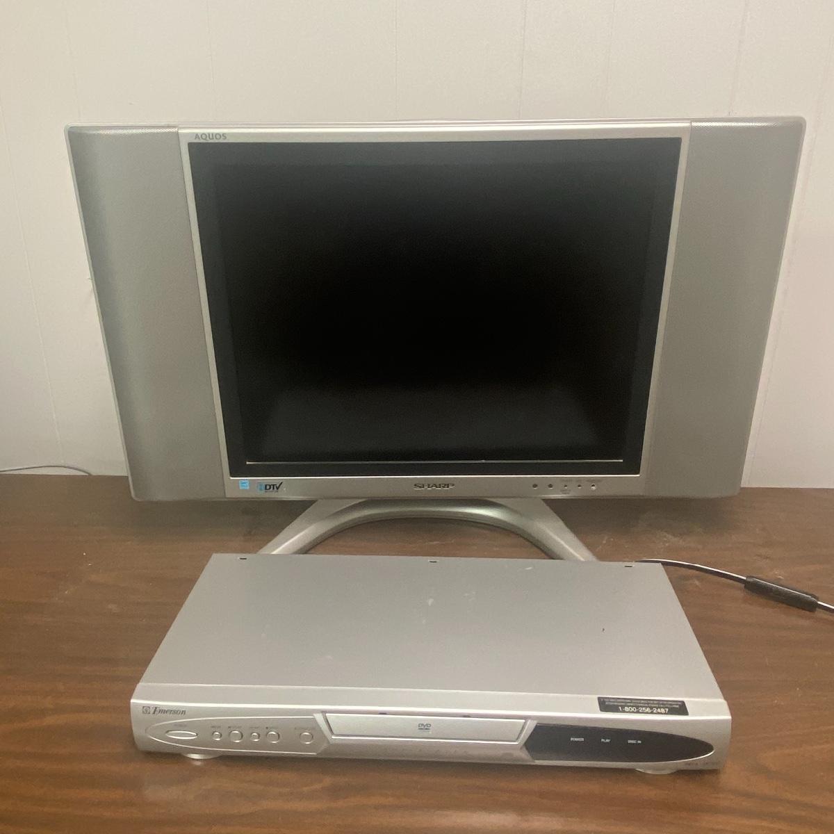 Lot includes 20 inch sharp TV. TV has speakers on either side of the screen and a curved silver base. Lot also includes Emerson DVD player and TV powered on when tested. Remotes included to each of these electronic devices. See photos for details. Local pick up only.