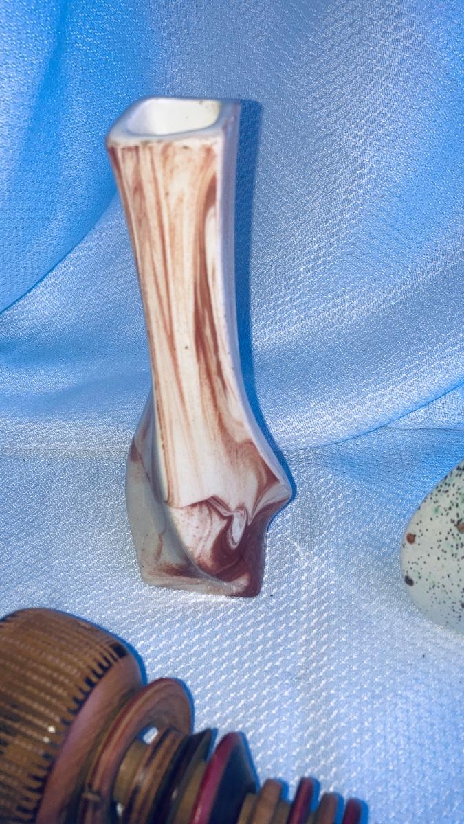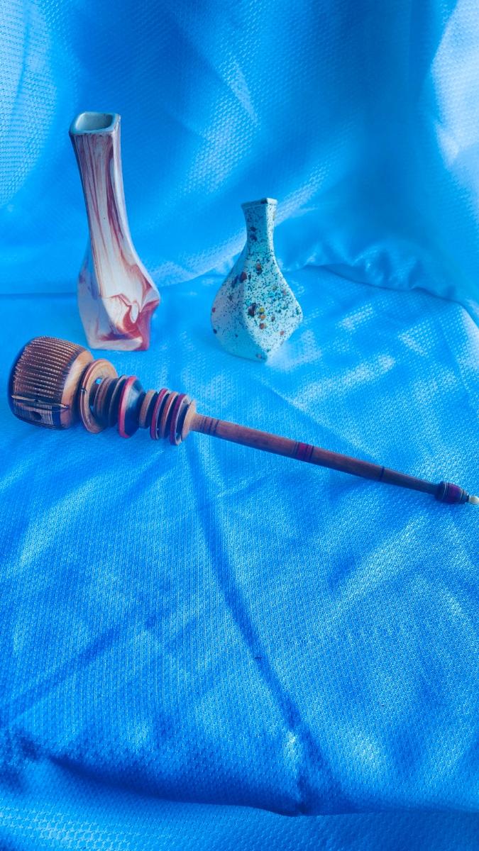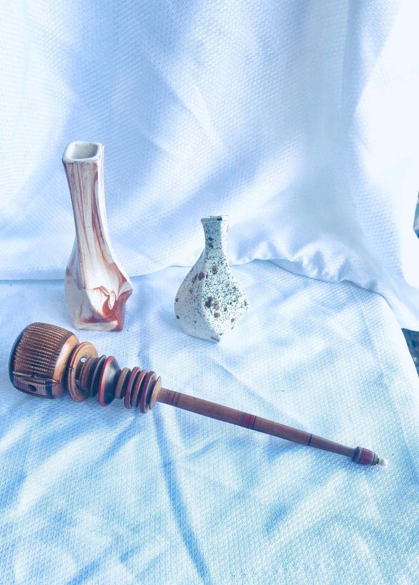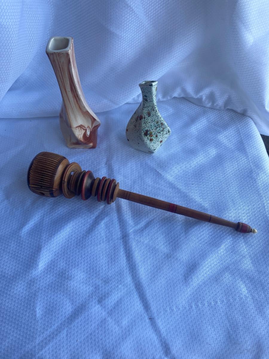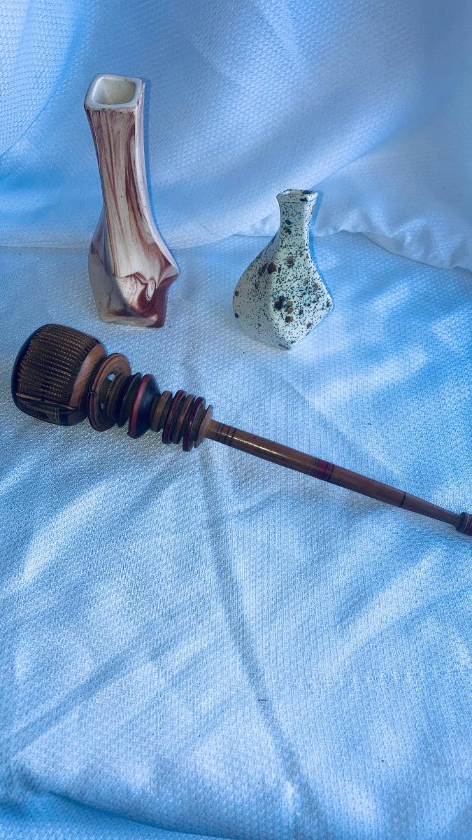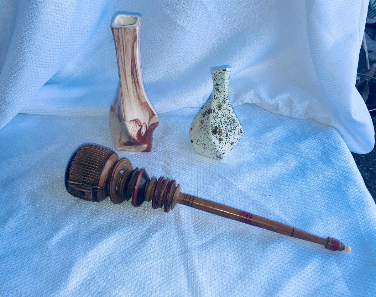 LOT 226 VINTAGE CARVED WOOD MEXICAN MOLINILLO WHISK, AND TWO MCM BUD VASE’S