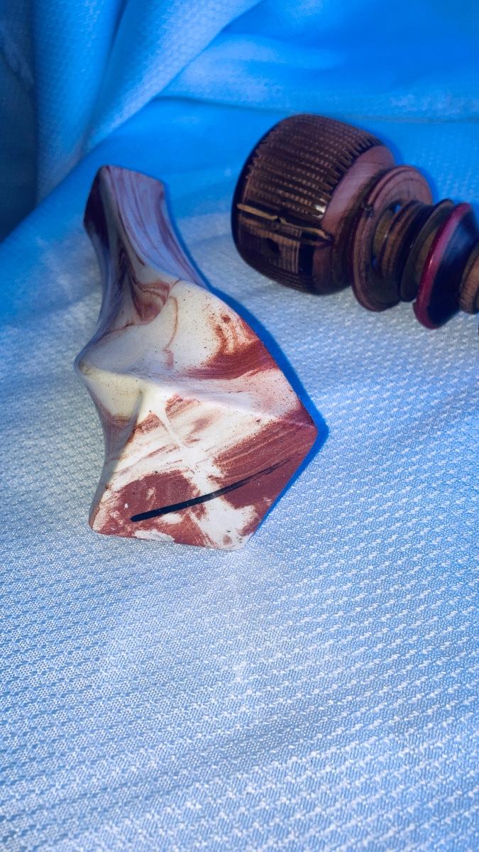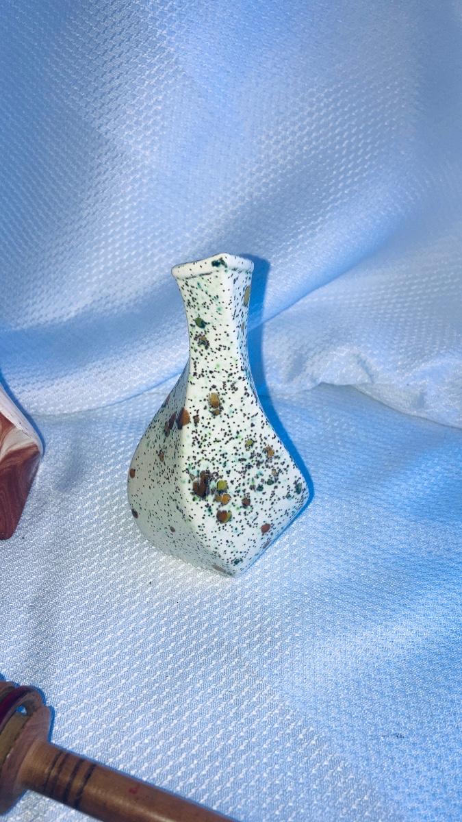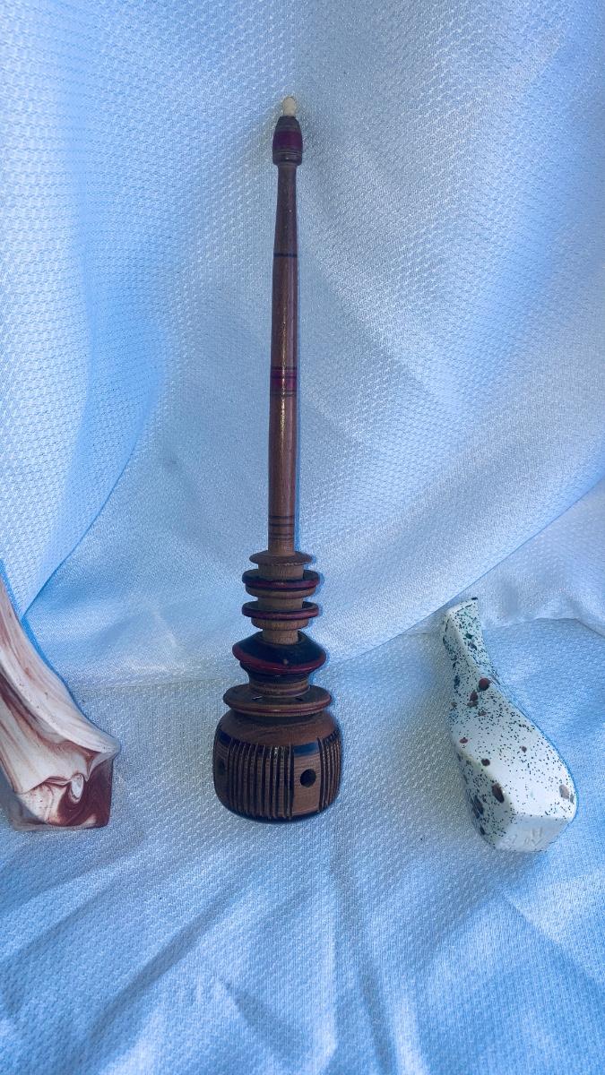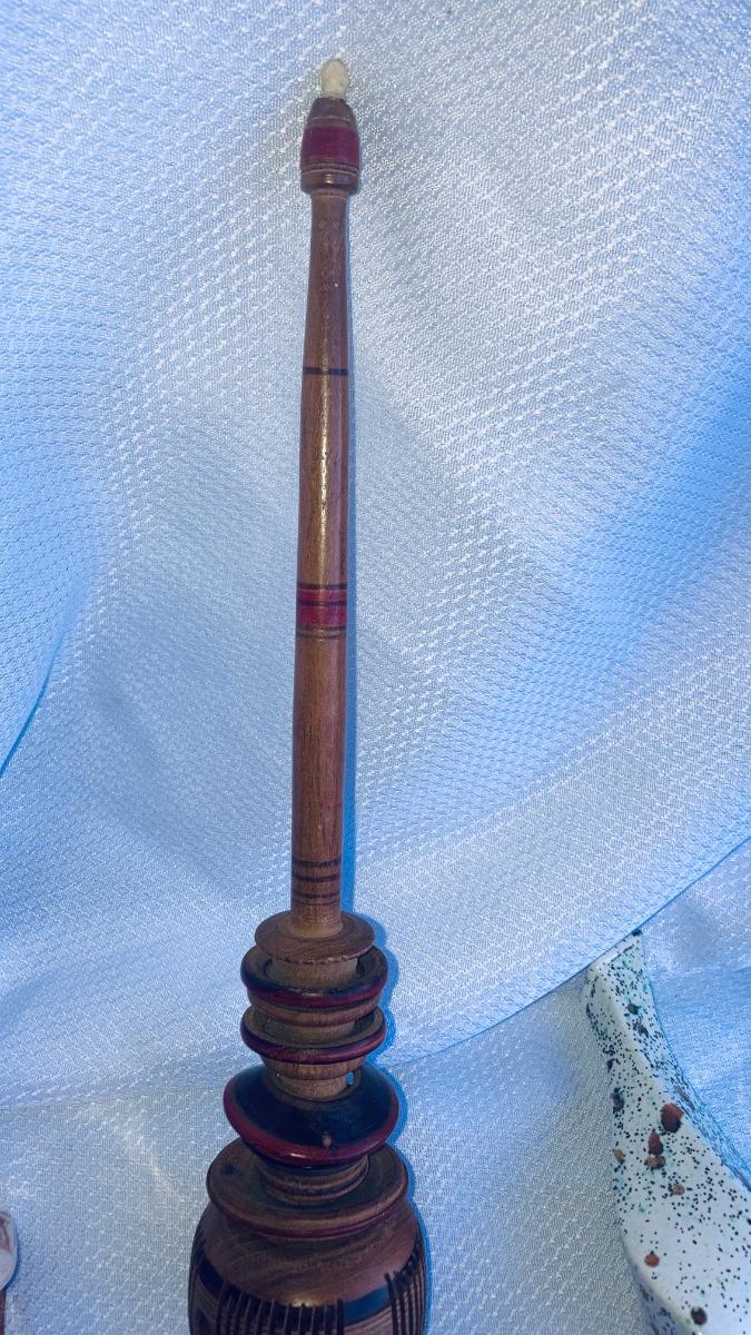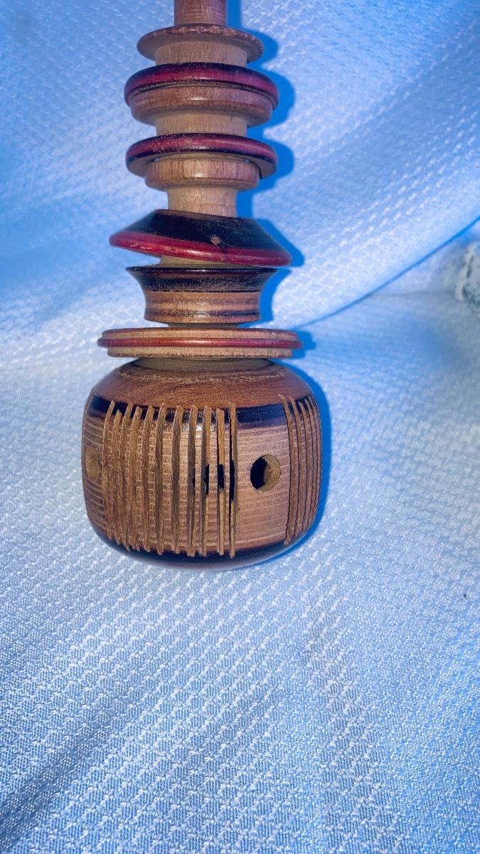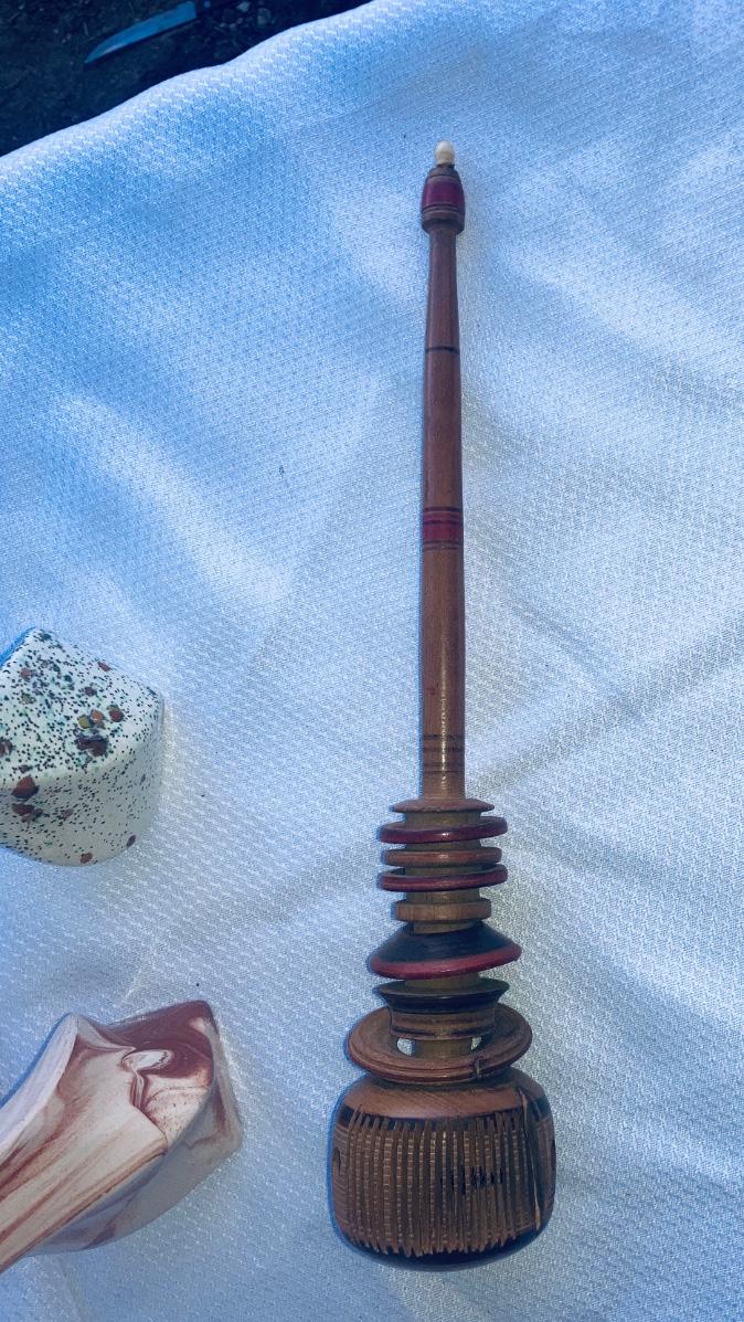LOT 226 VINTAGE CARVED WOOD MEXICAN MOLINILLO WHISK, AND TWO MCM BUD VASE’S