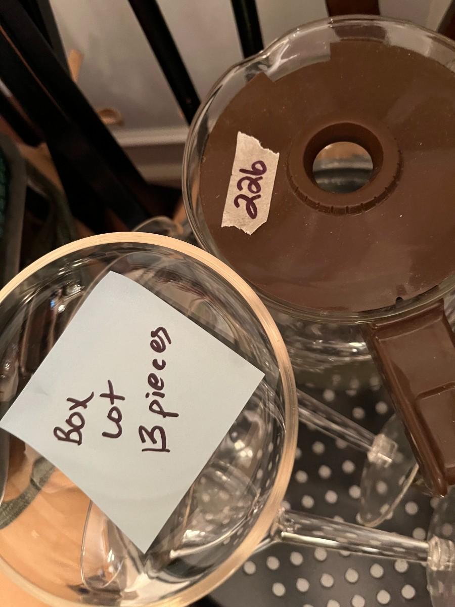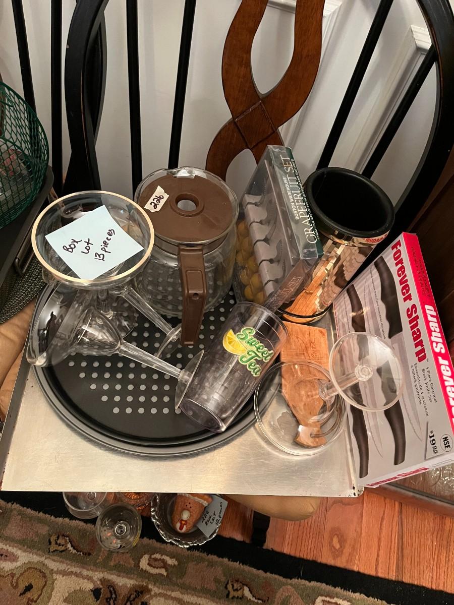 Box Lot Knives Pans Plastic Cups Coffee Pot - Lot 226