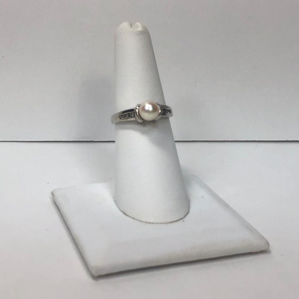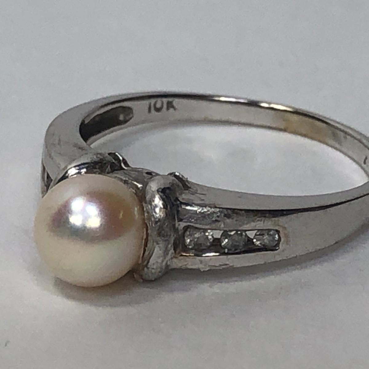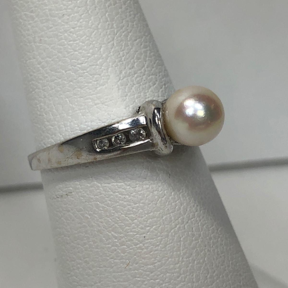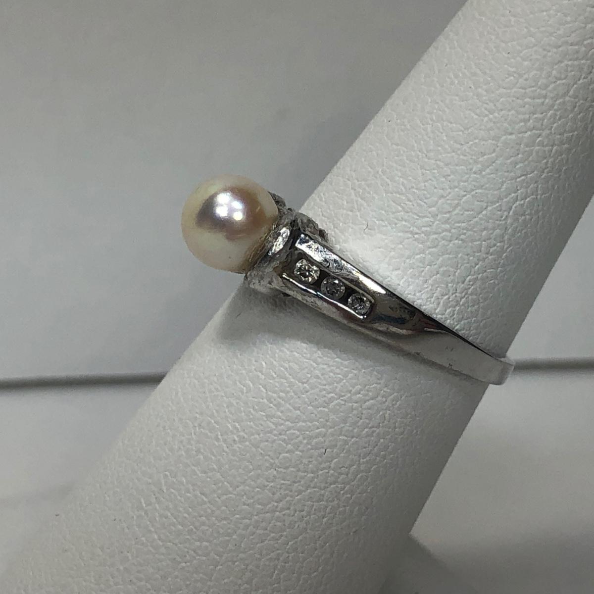 LOT 226: 10K White Gold Ring w/ Pearl & Diamond Chips - Size 7 - 2.5 gtw