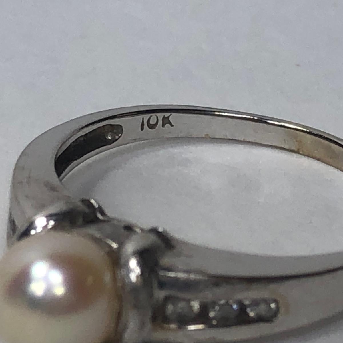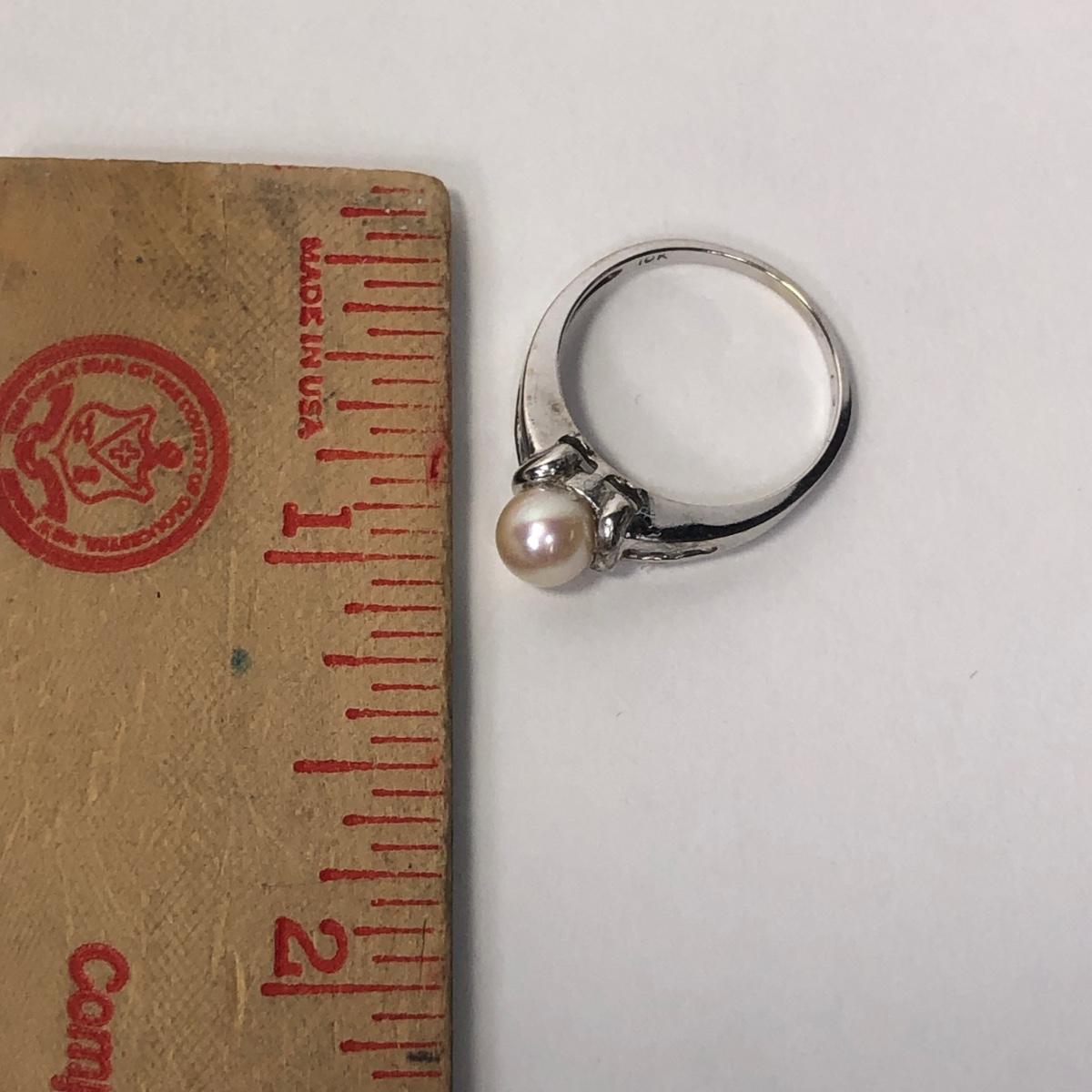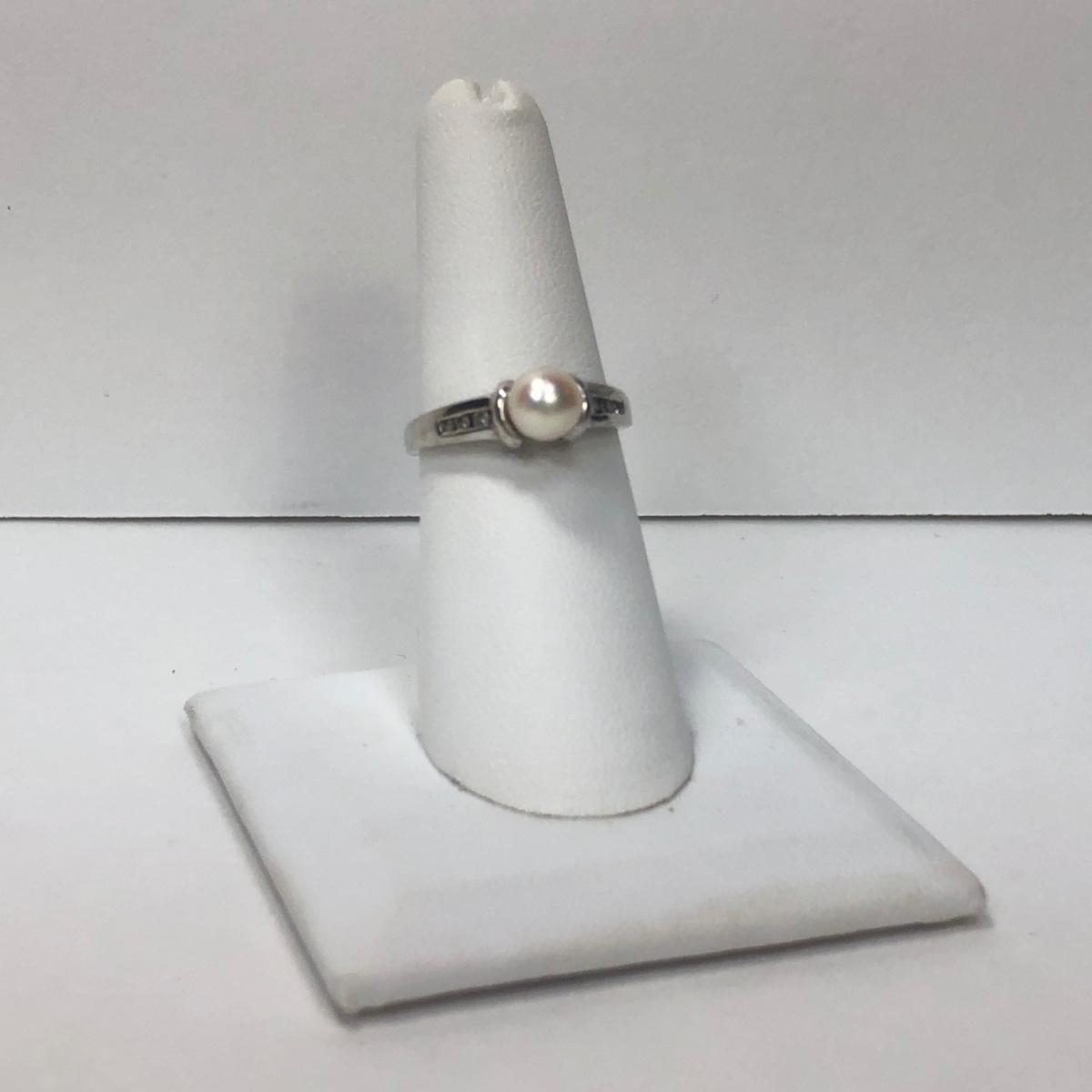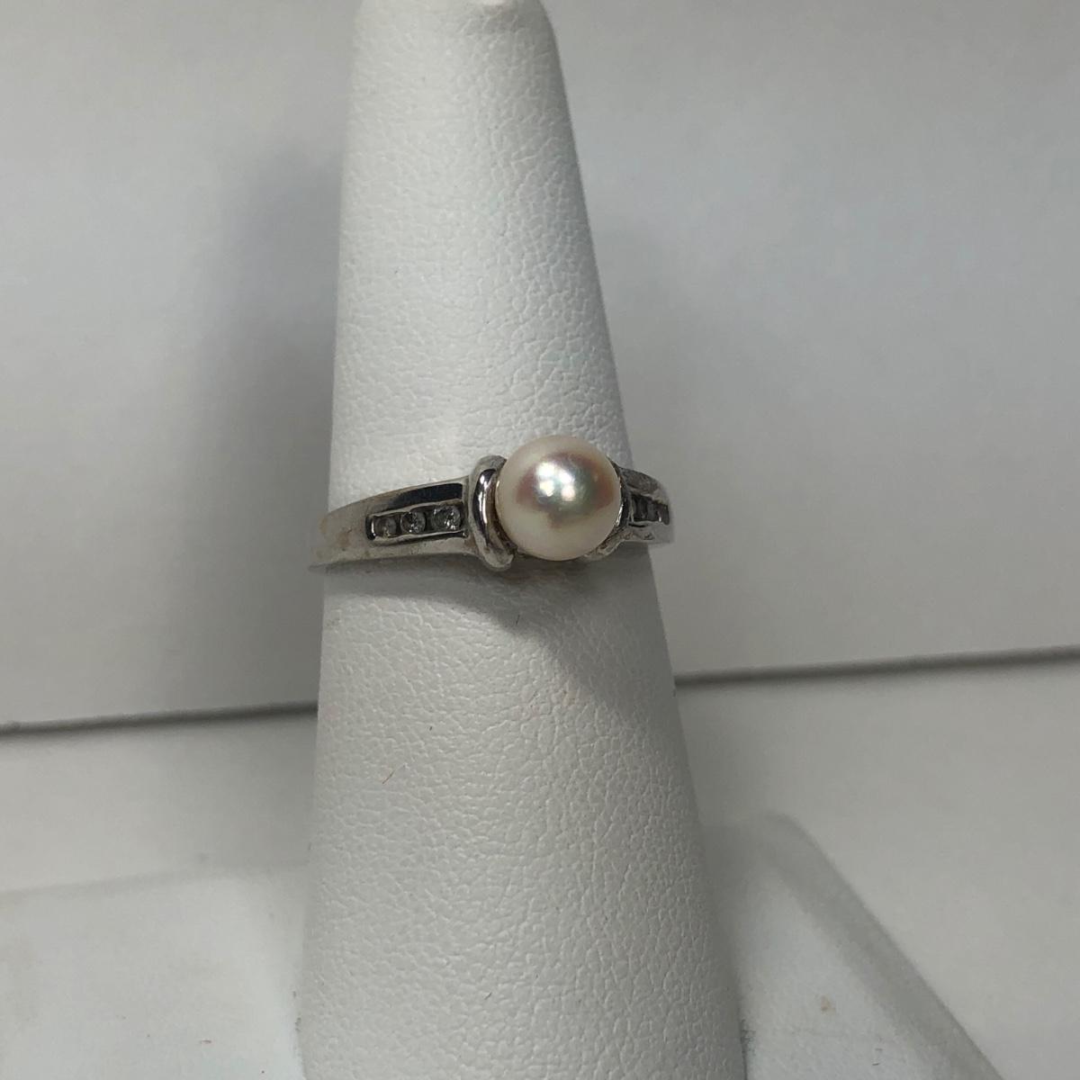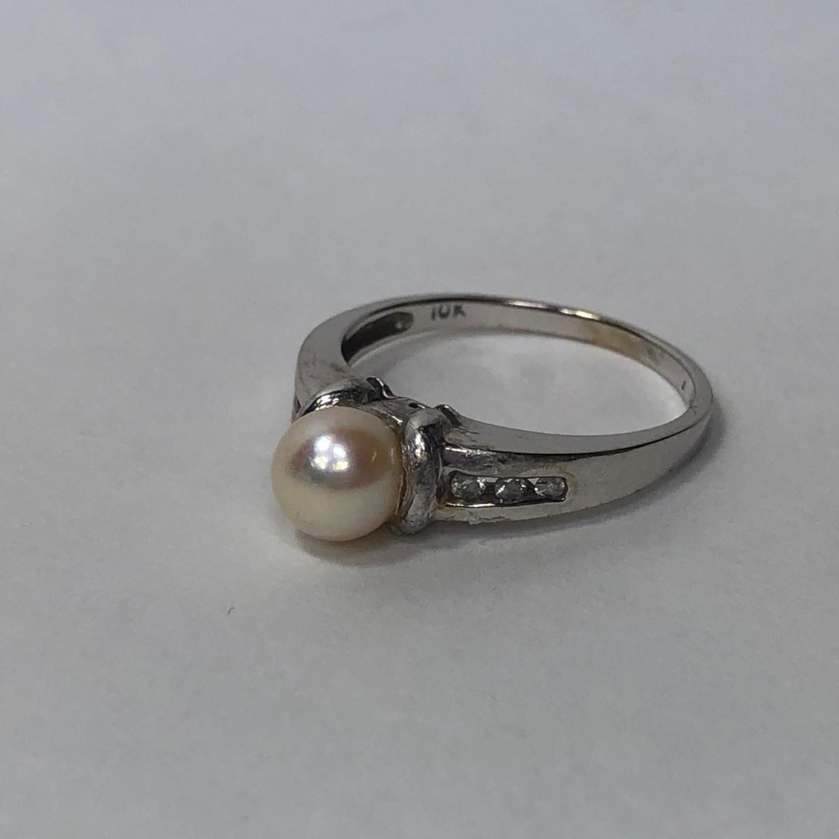 LOT 226: 10K White Gold Ring w/ Pearl & Diamond Chips - Size 7 - 2.5 gtw