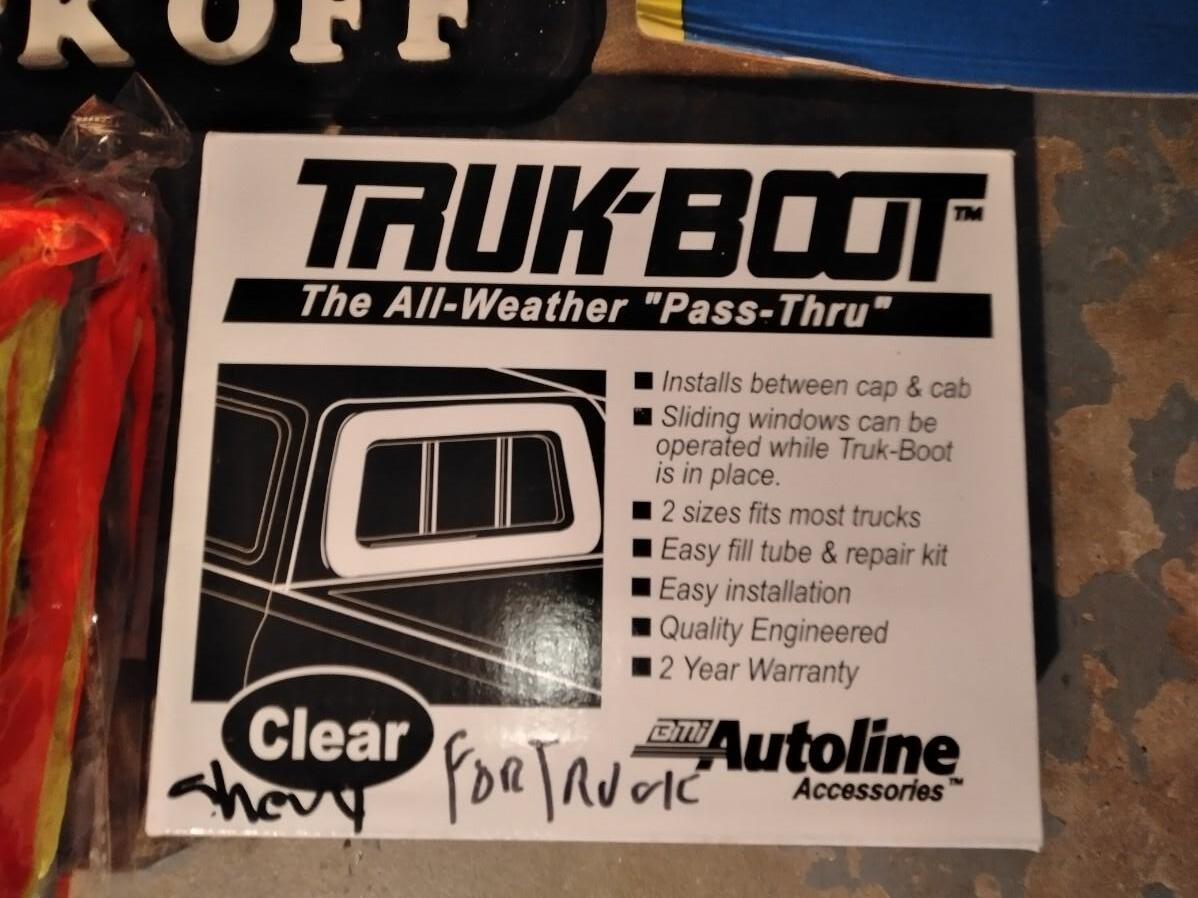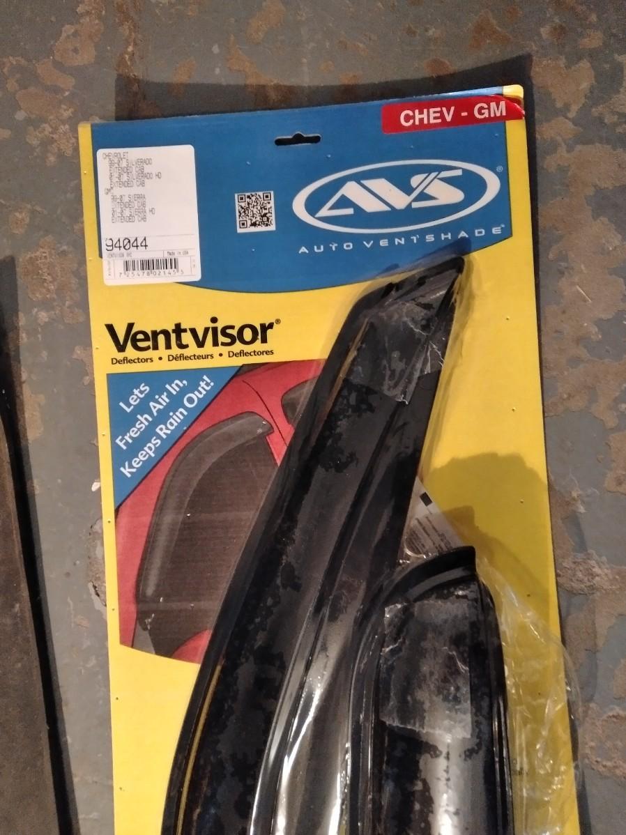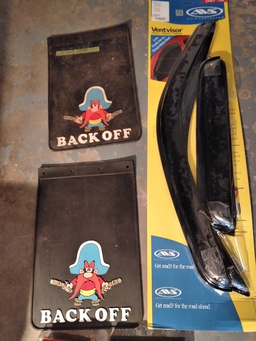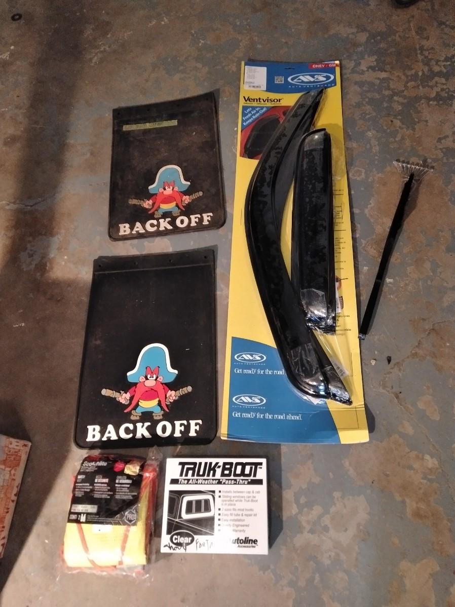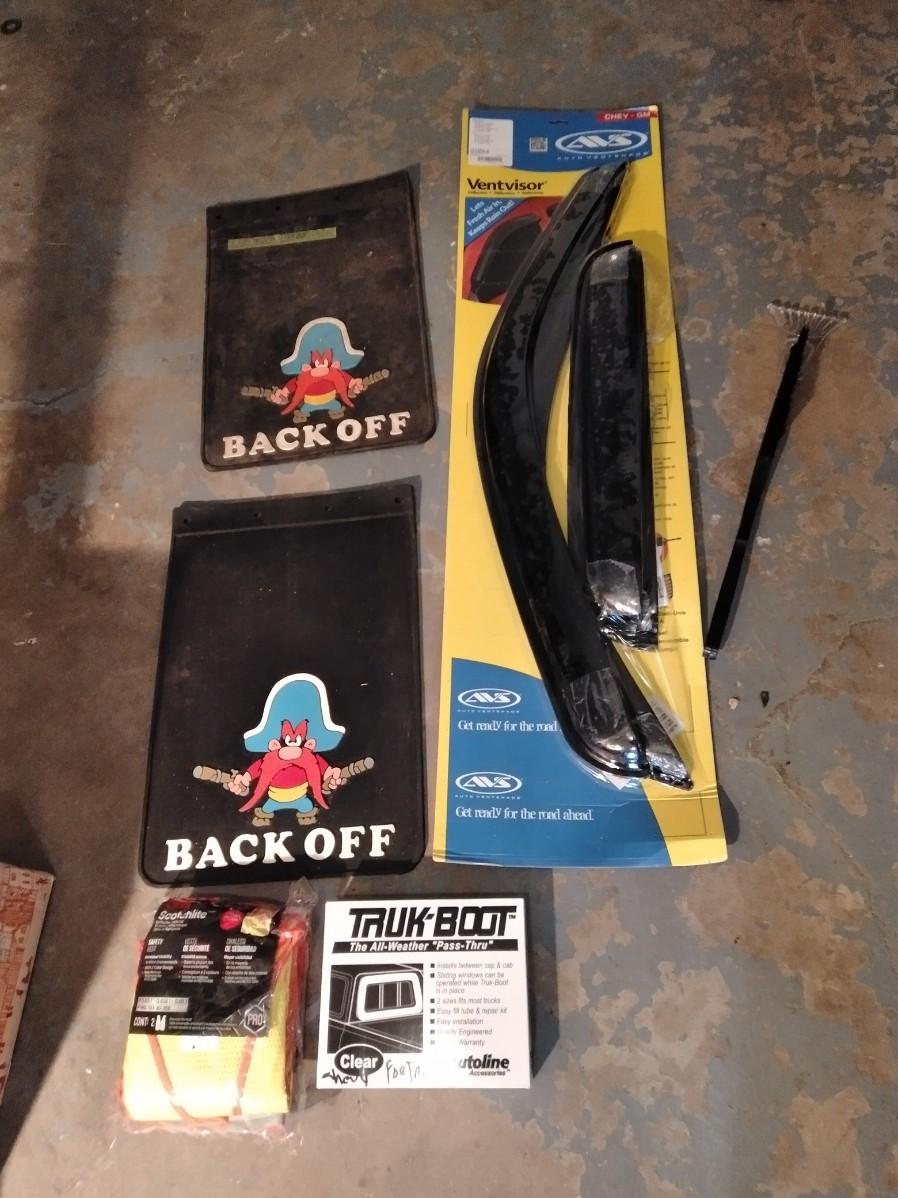BACK OFF MUD FLAPS, BRAND NEW VENTVISION VISORS FOR 99-07 SILVERADO EXTENDED CAB OR 99-07 SIERRA EXTENDED CAB, TRUK-BOOT SLIDING WINDOW BOOT, BRAND NEW SAFTY VEST, AND WINDOW SCRAPER.