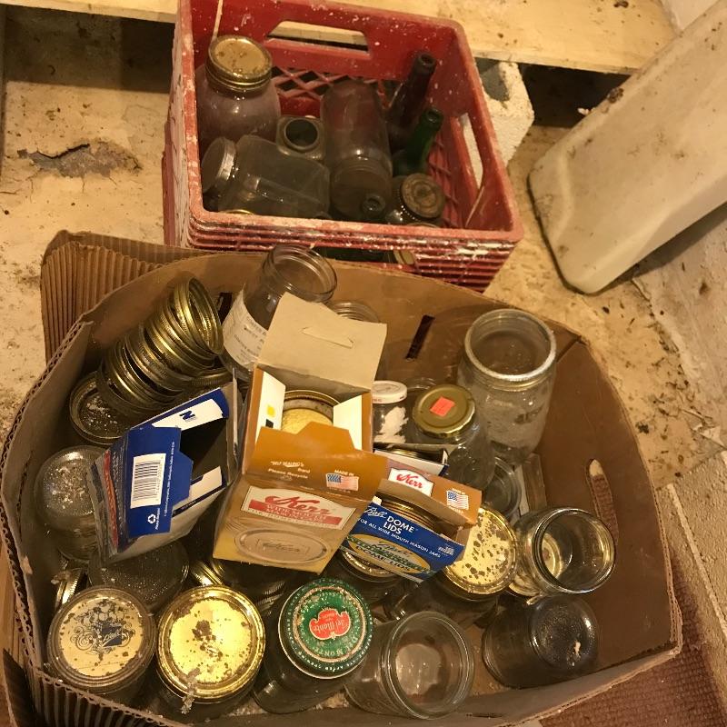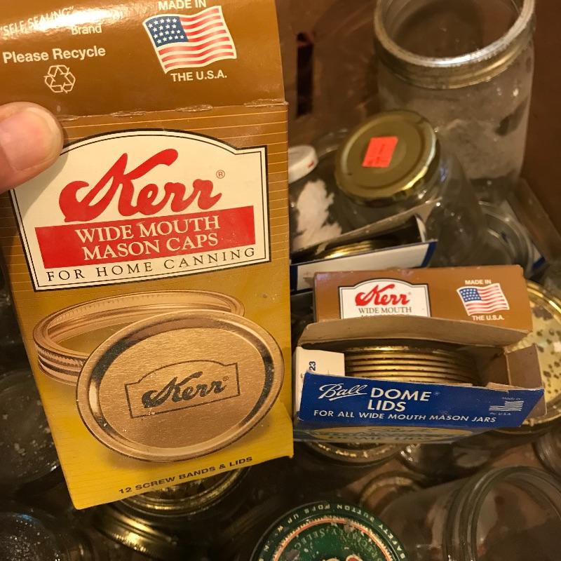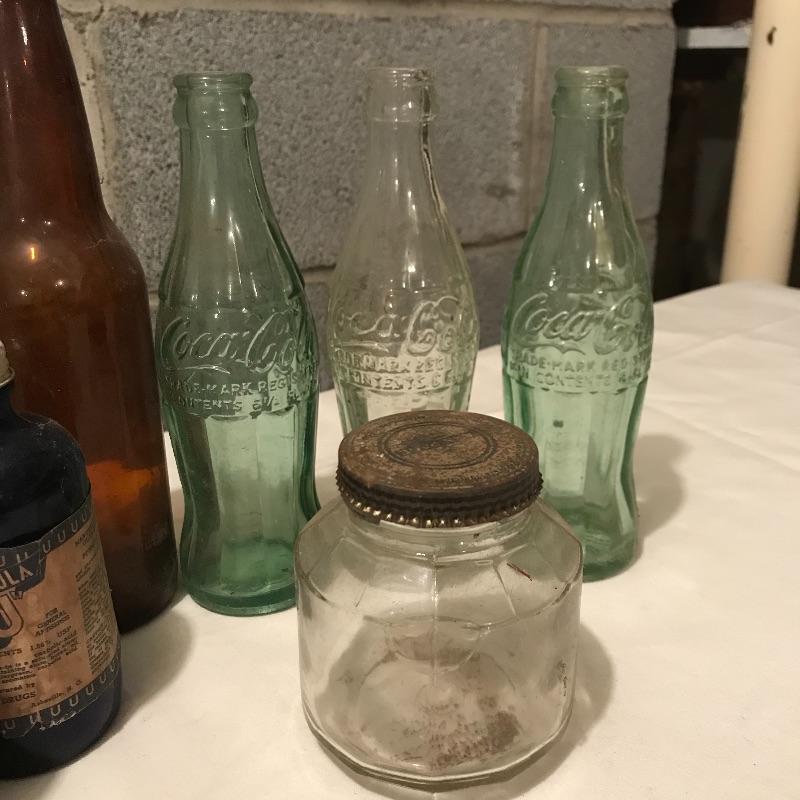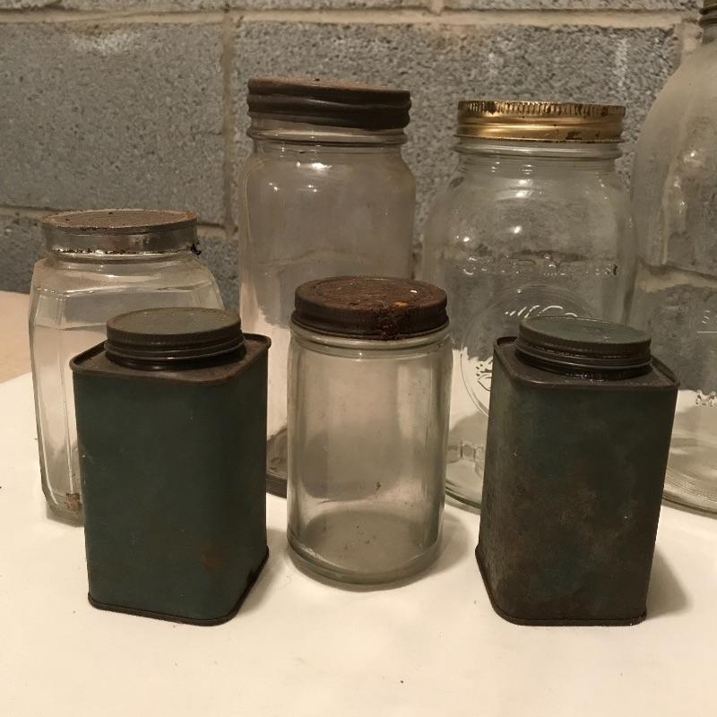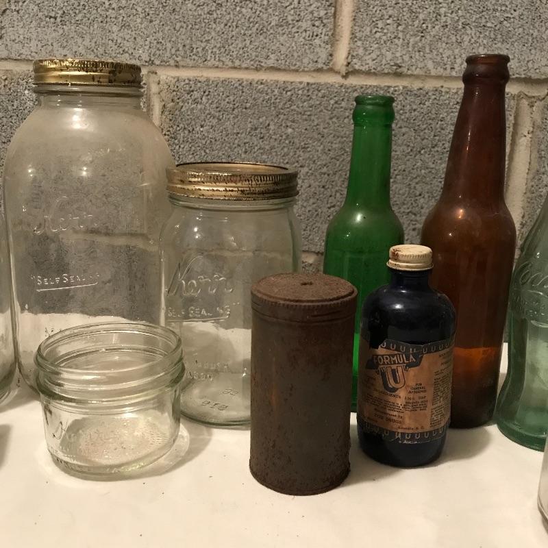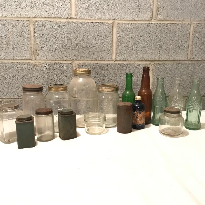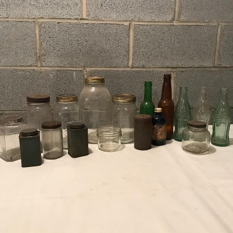 Fun collection including three vintage glass Coca-Cola bottles. Lot also includes medicinal bottles, tin canisters, colored bottles and more! This lot has a large collection of mostly canning jars with extra open boxes of Kerr and Ball lids. Bottles need to be cleaned, but collection would be perfect for decor, crafts or resale! No shipping.
