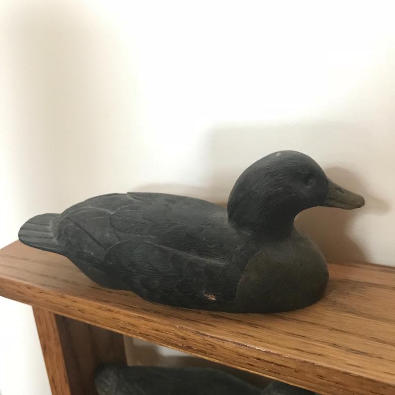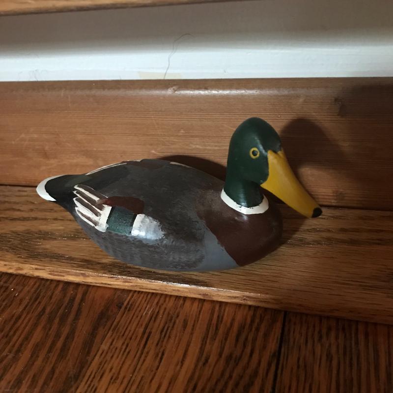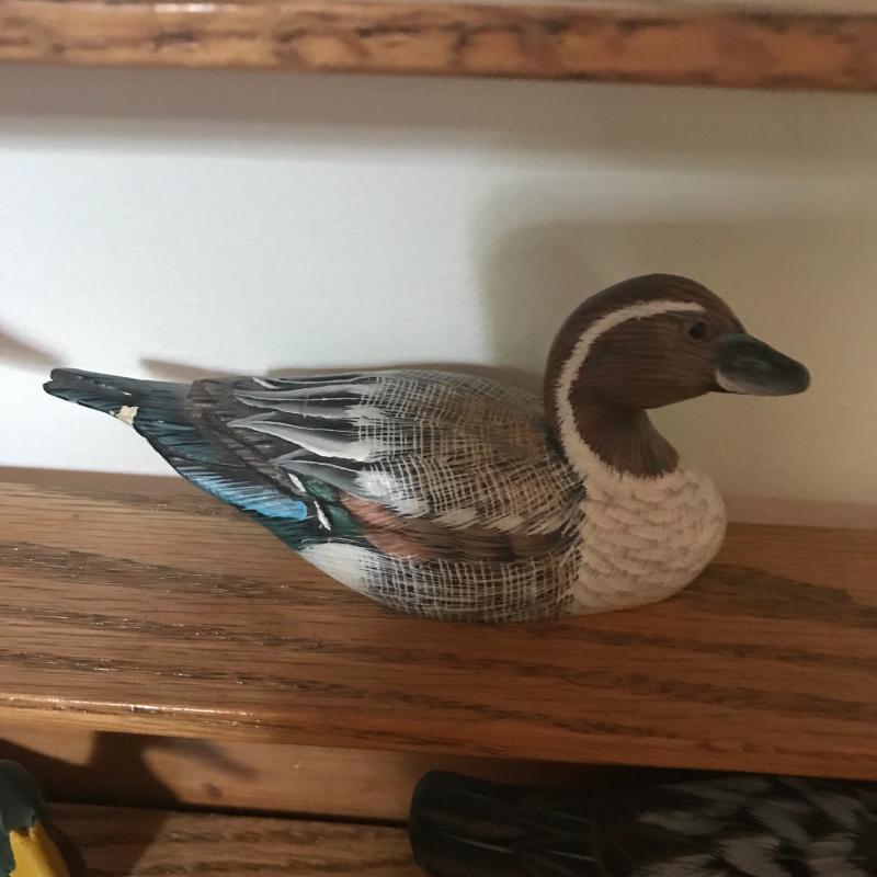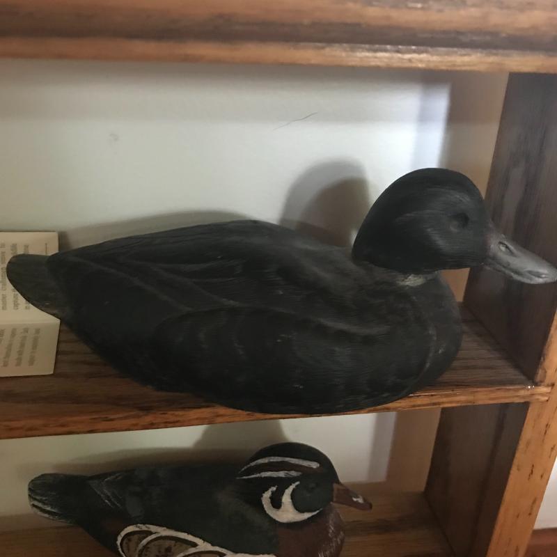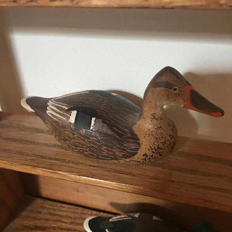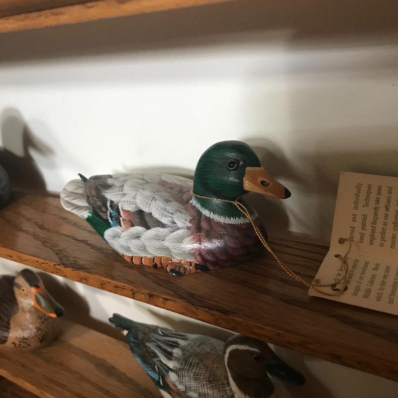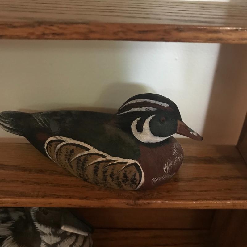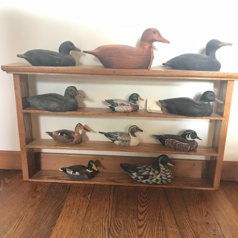 11 small carved ducks, some signed some not. See pix for details. Shelf measures 22” x3” x12.5” and 3 smaller shelves are each 2” deep. Largest natural wood duck measures 9” long. Lot is available for shipping or local pick up in Horseshoe, NC.