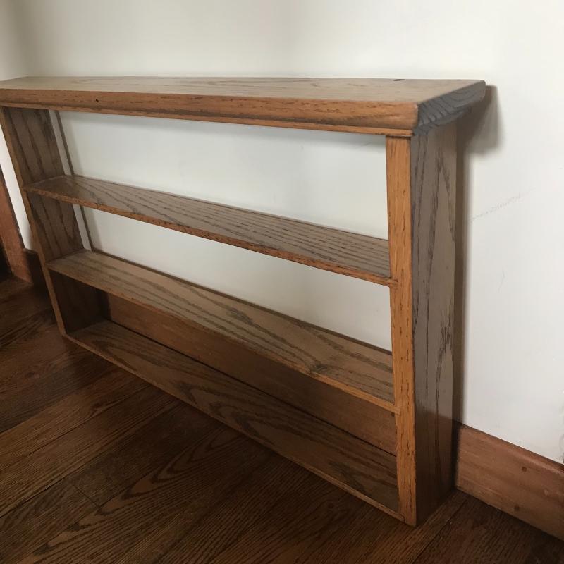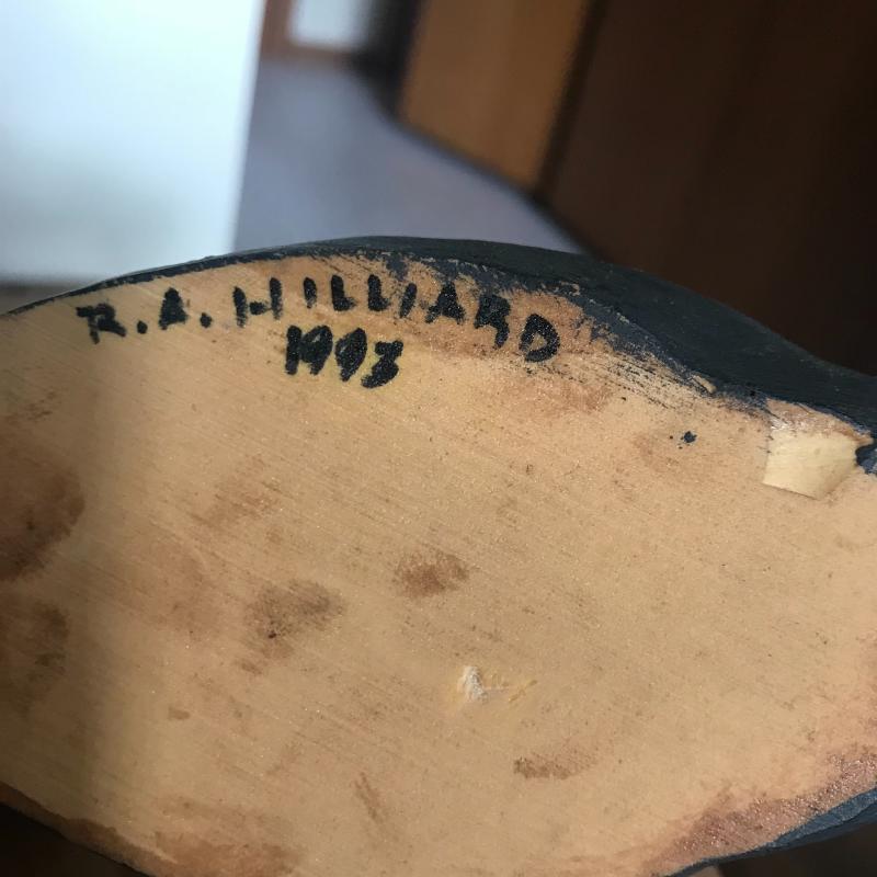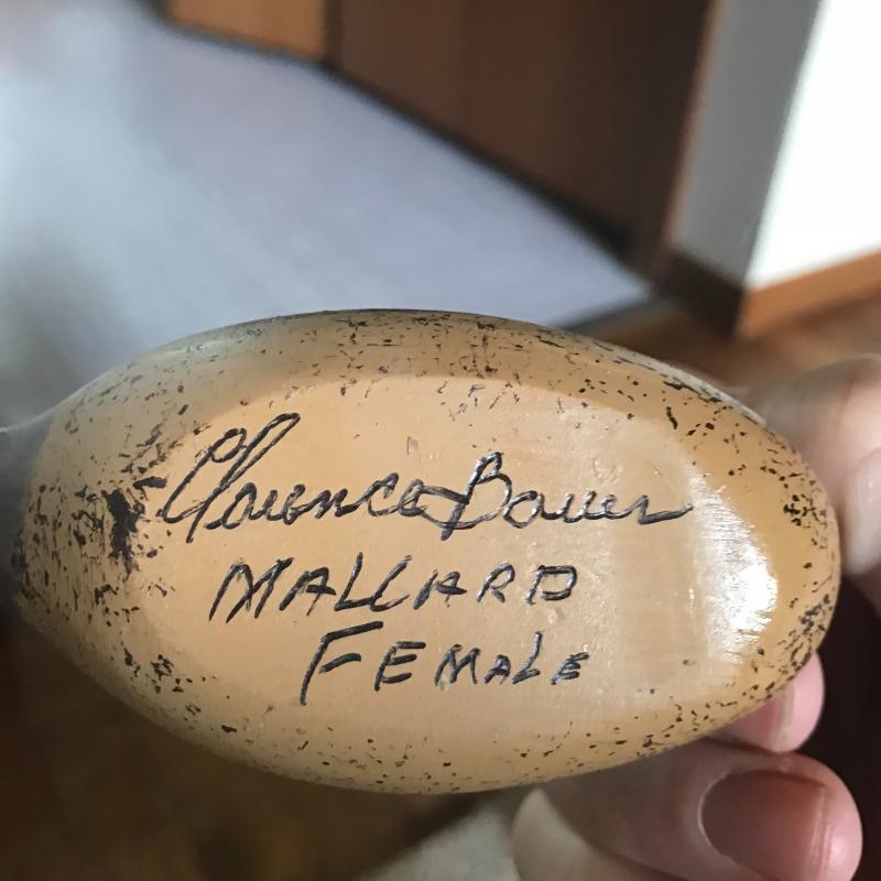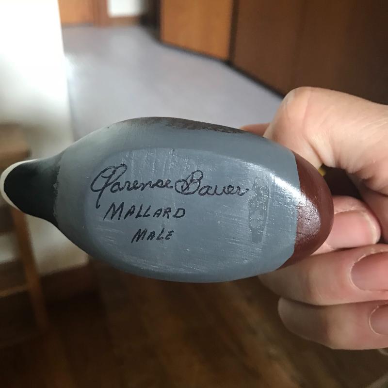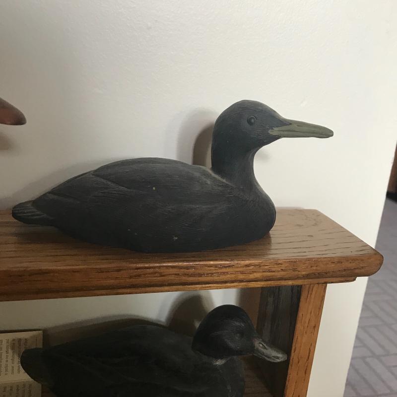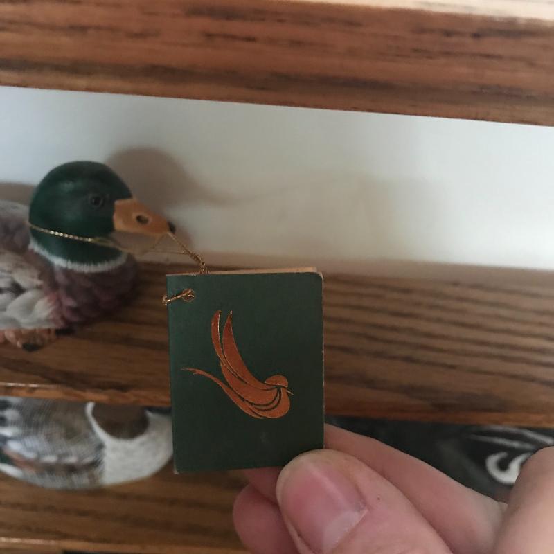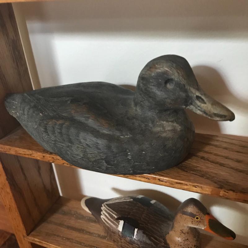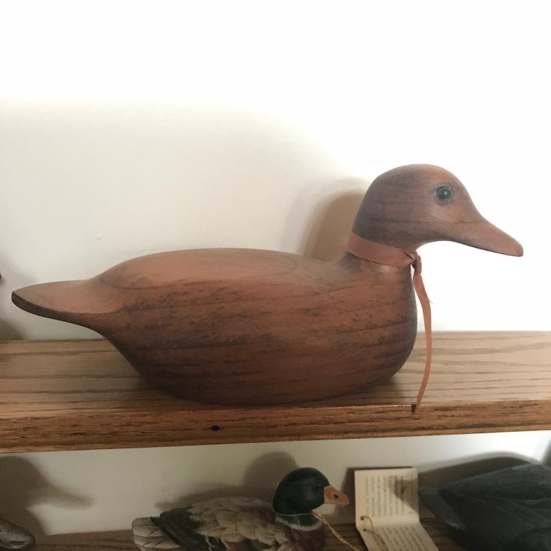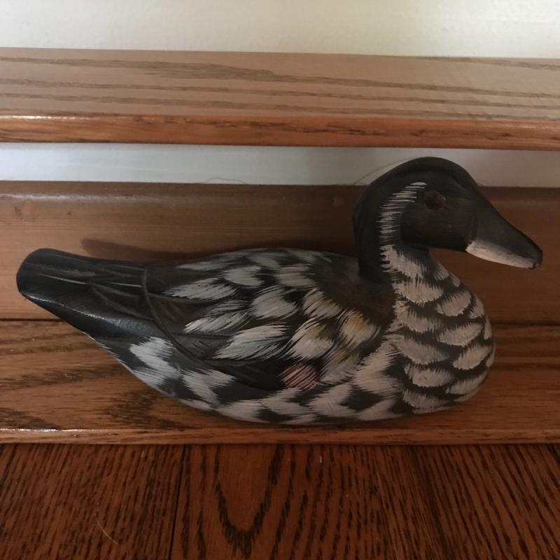 11 small carved ducks, some signed some not. See pix for details. Shelf measures 22” x3” x12.5” and 3 smaller shelves are each 2” deep. Largest natural wood duck measures 9” long. Lot is available for shipping or local pick up in Horseshoe, NC.