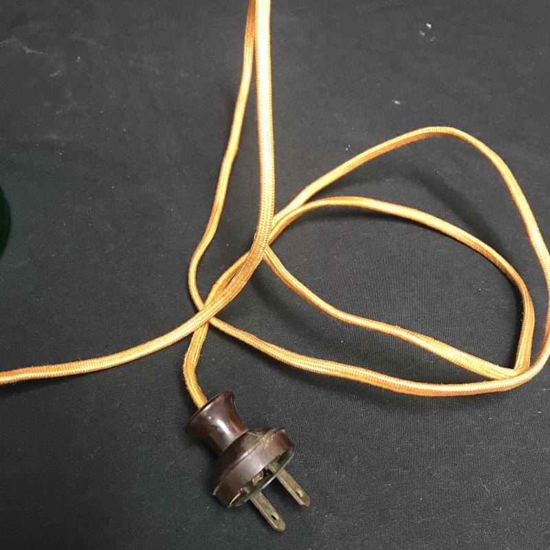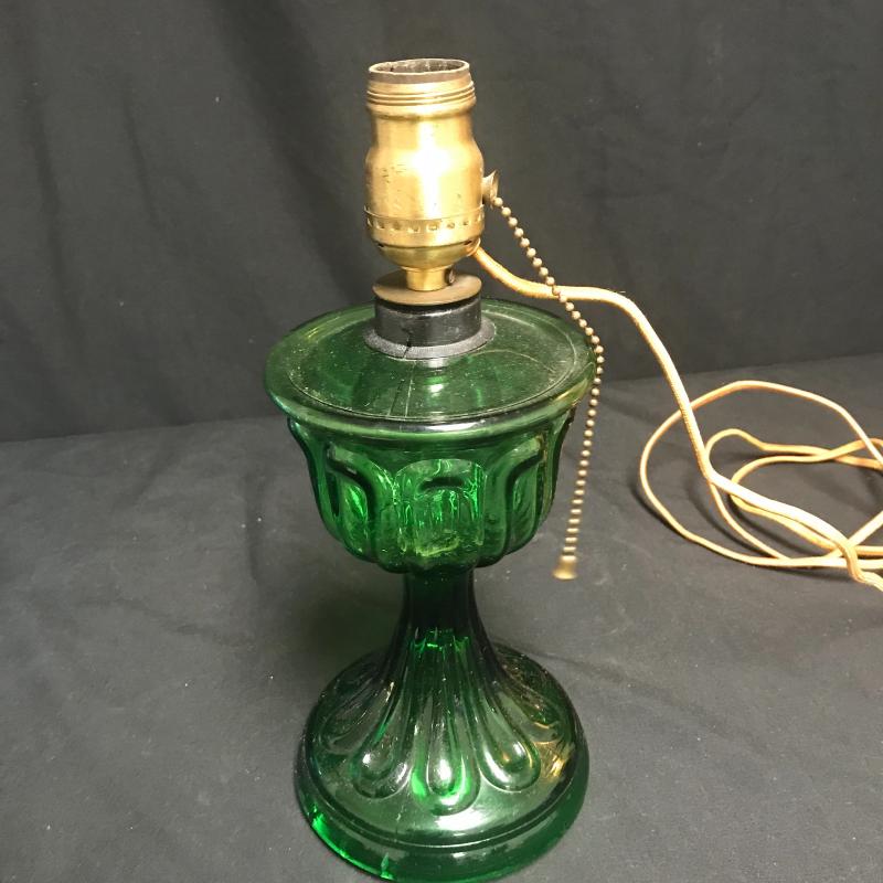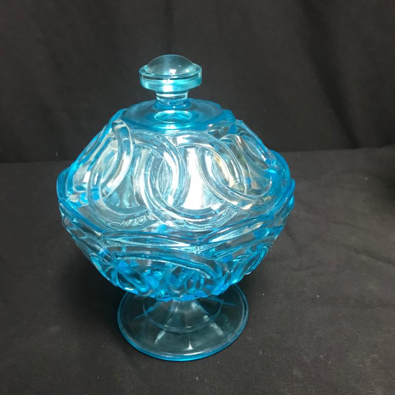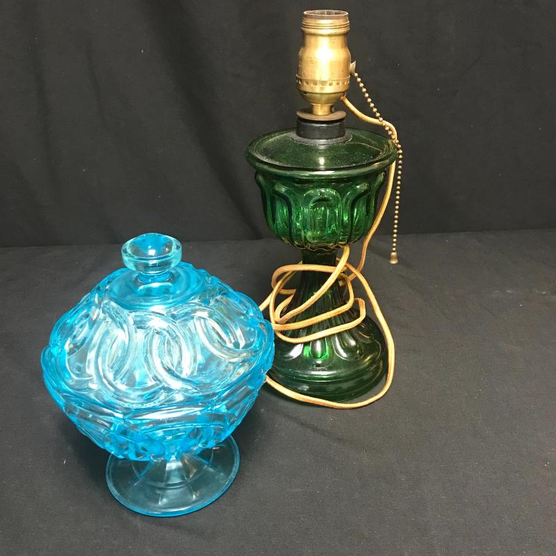 Green glass pull chain lamp with good cord, stands 12” tall. Blue glass footed candy dish with lid has beautiful circle design. Shipping available.