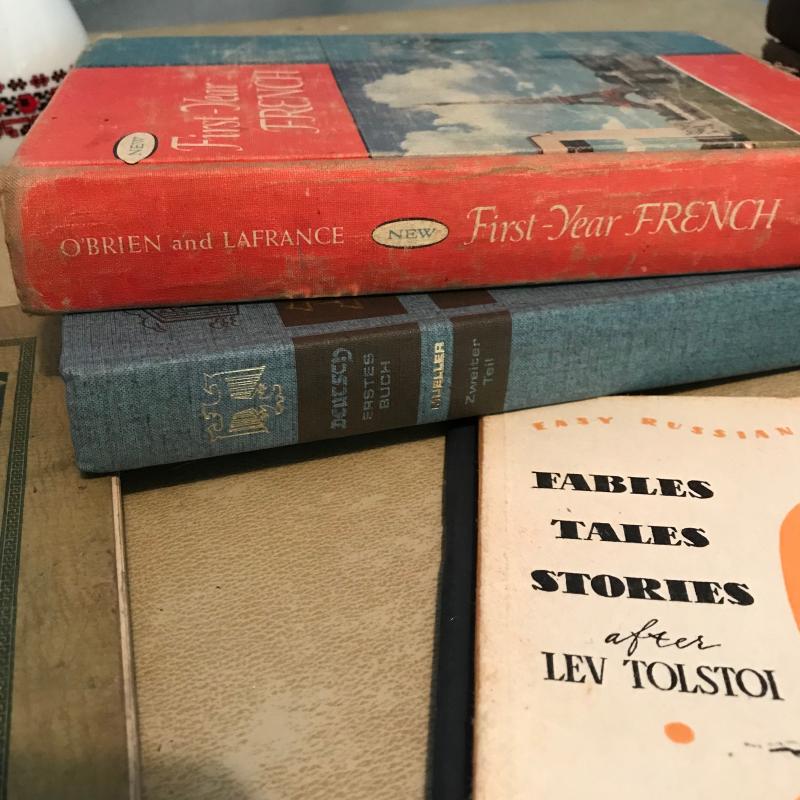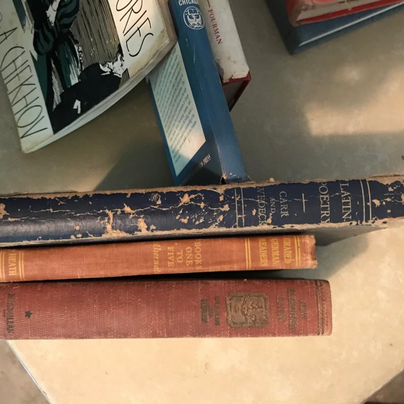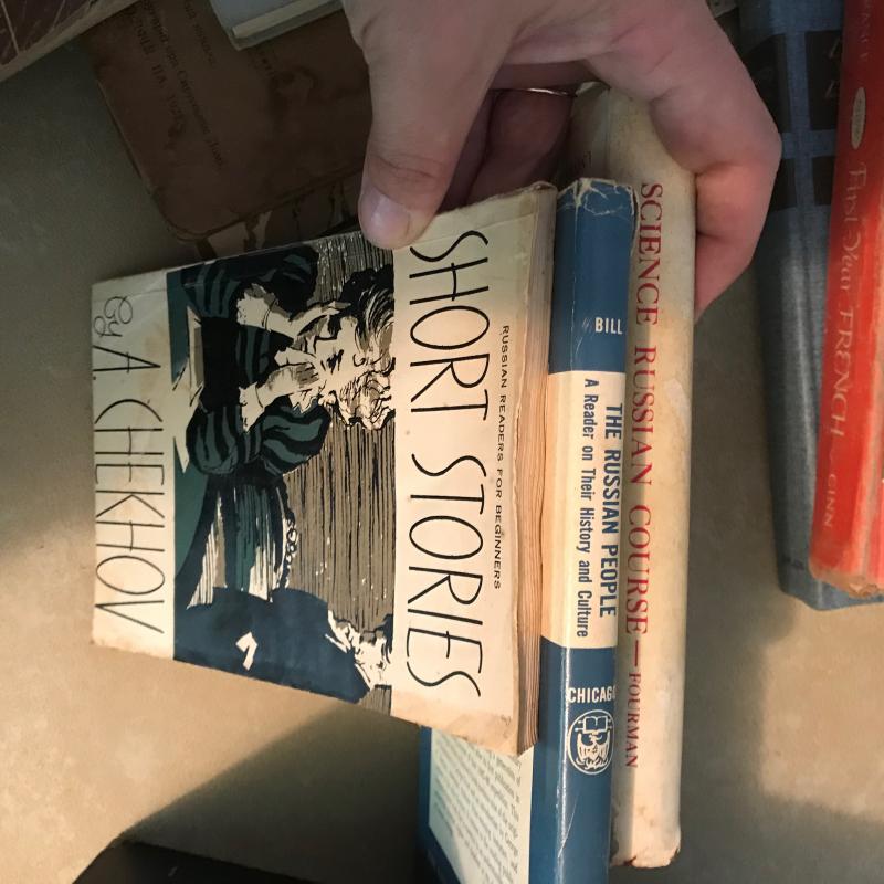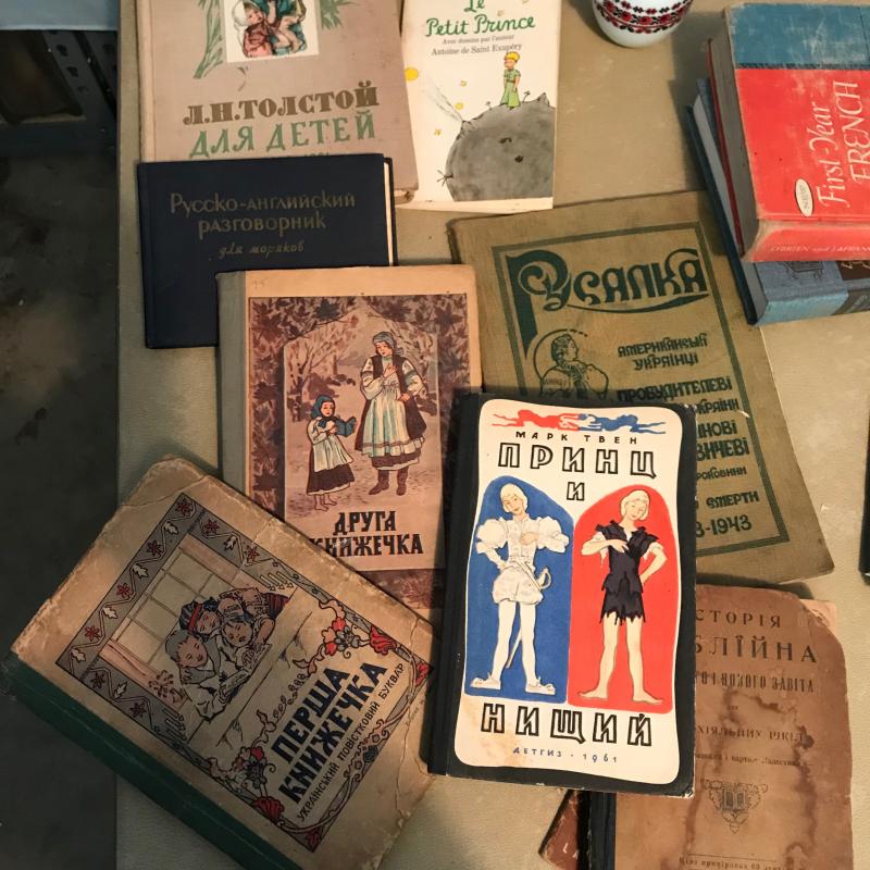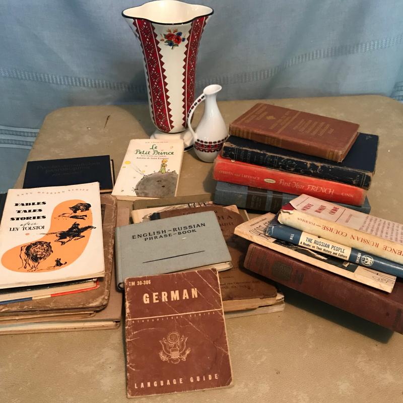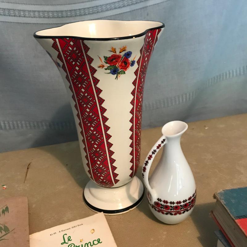 Books in Russian, French and Latin. Also includes Ukrainian Ceramics with unique red and black design. Largest vase is 6”d x 10”h. Shipping or local pick up.