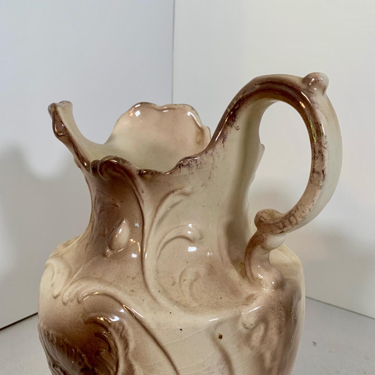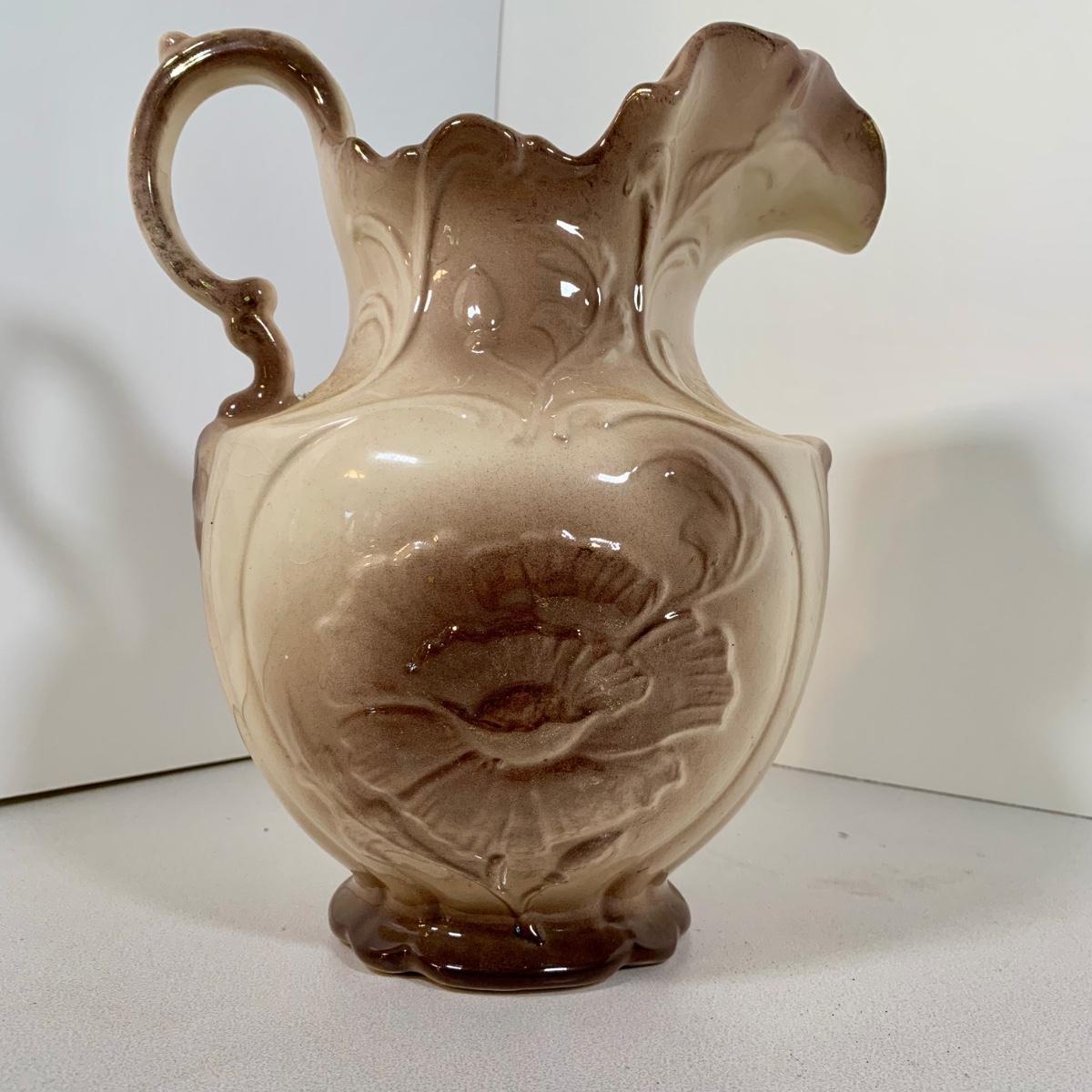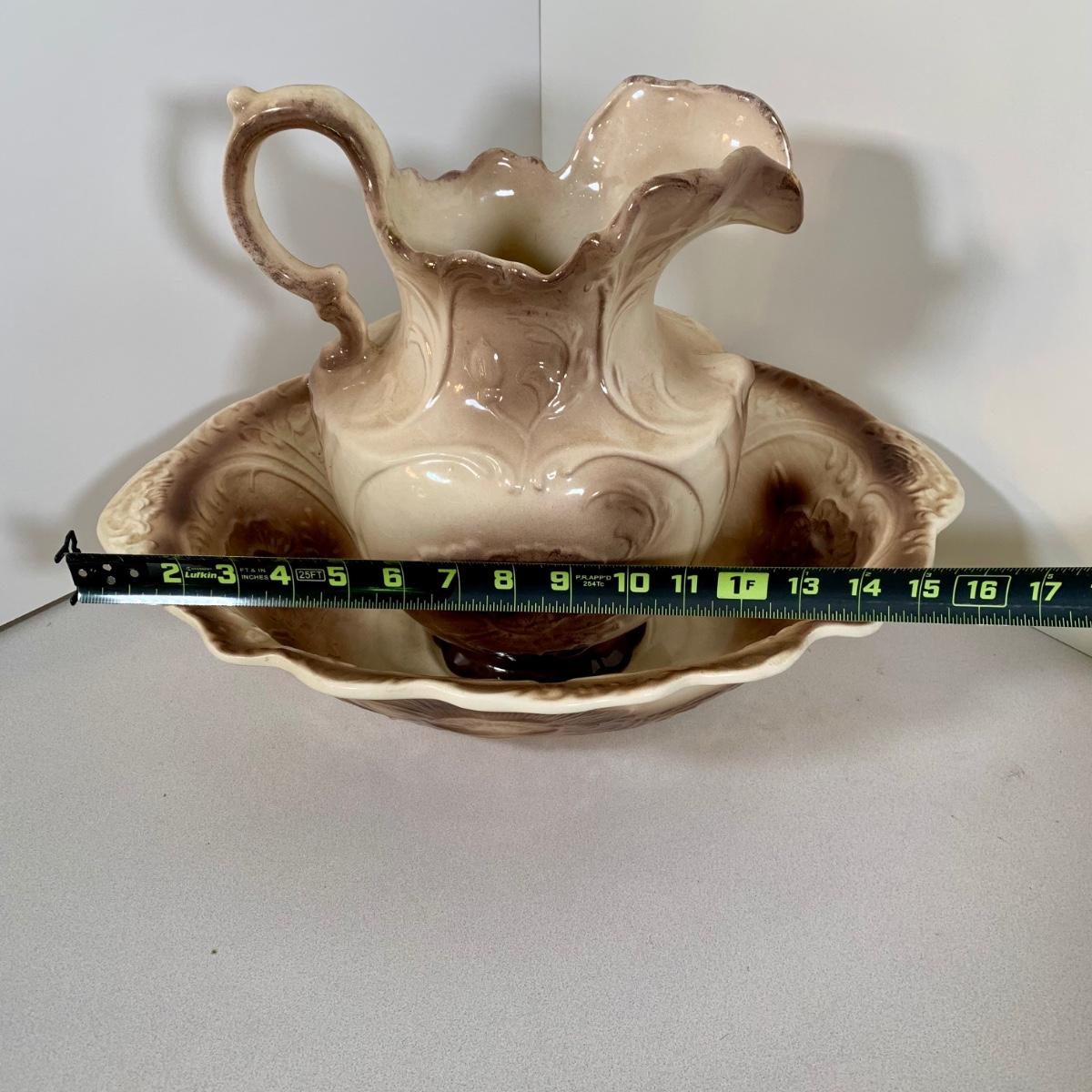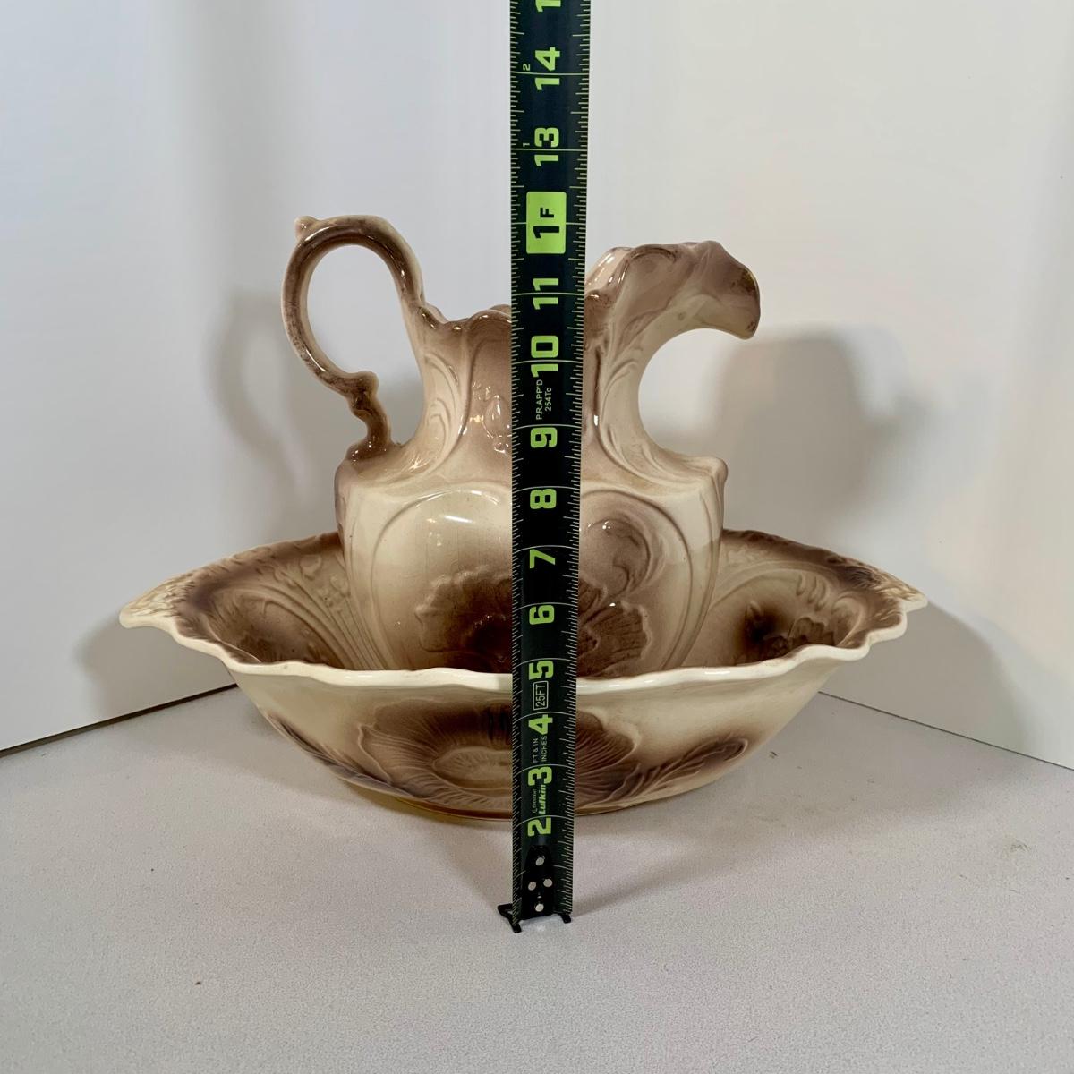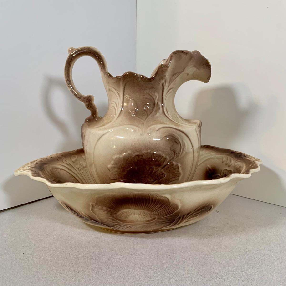 LOT 226 L: Unique Vintage M-C Brown & Cream Floral Ceramic Pitcher & Wash Bowl