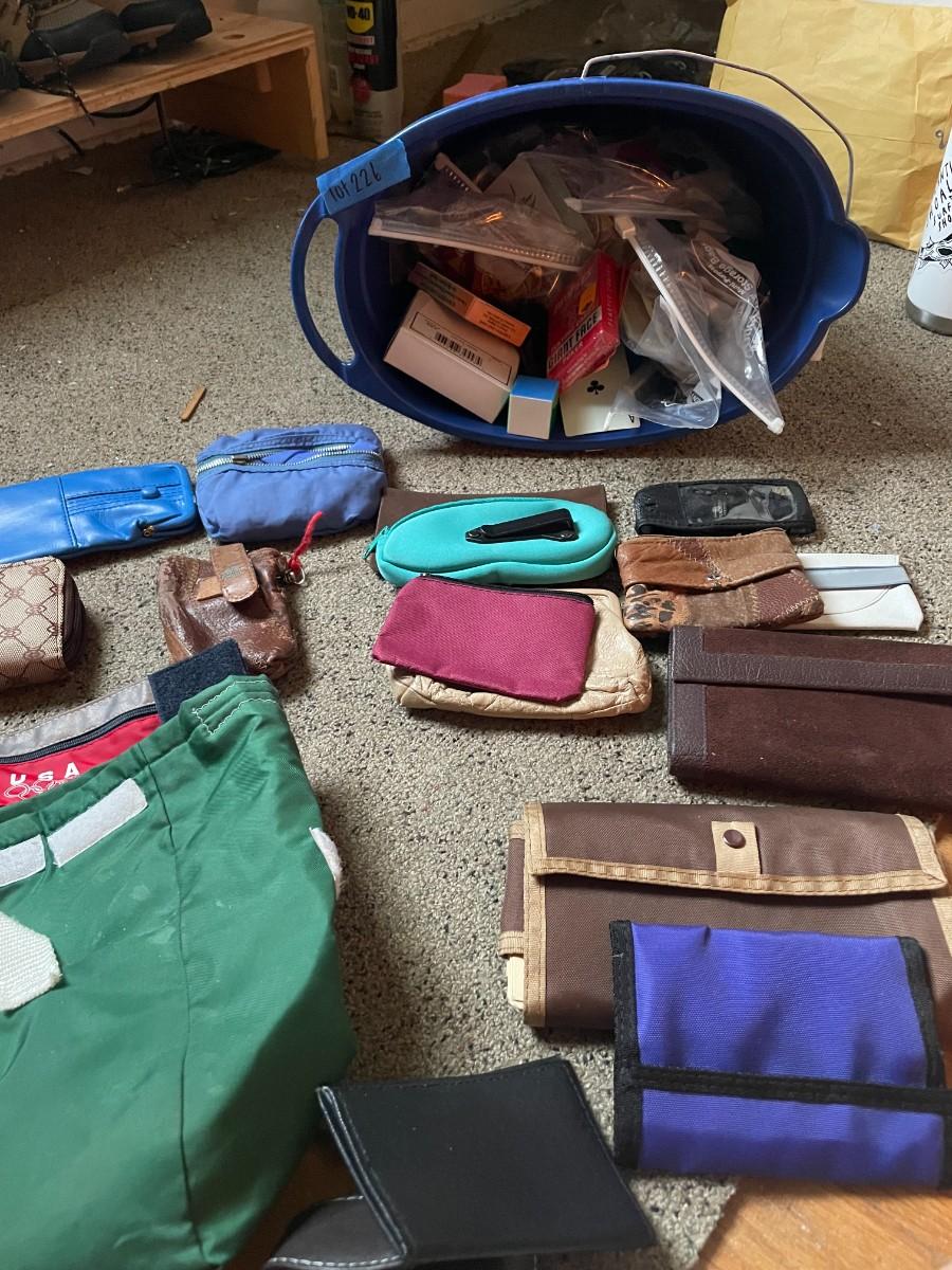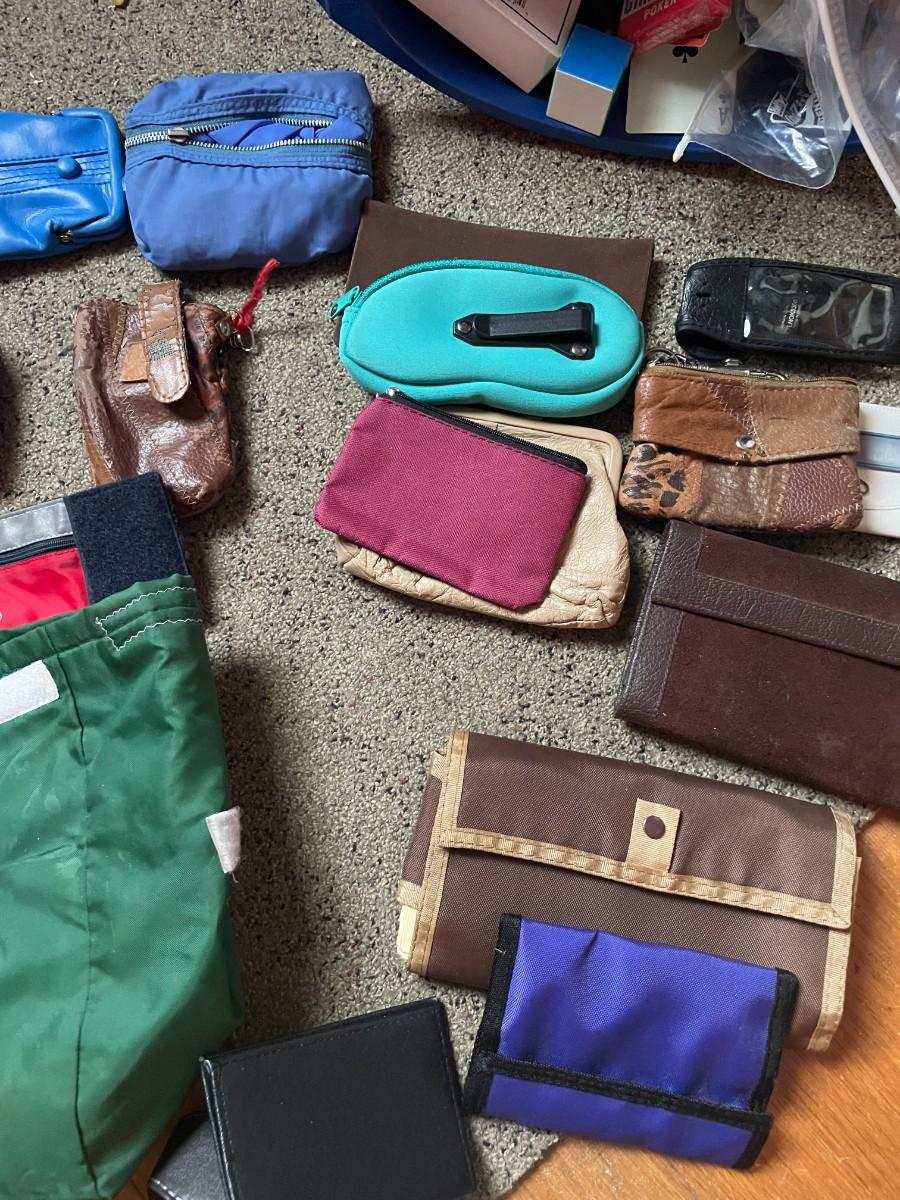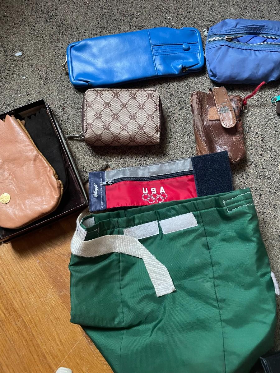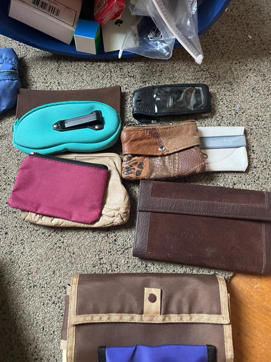 Misc. bags, purses, wallets, bucket of misc. cards and more.