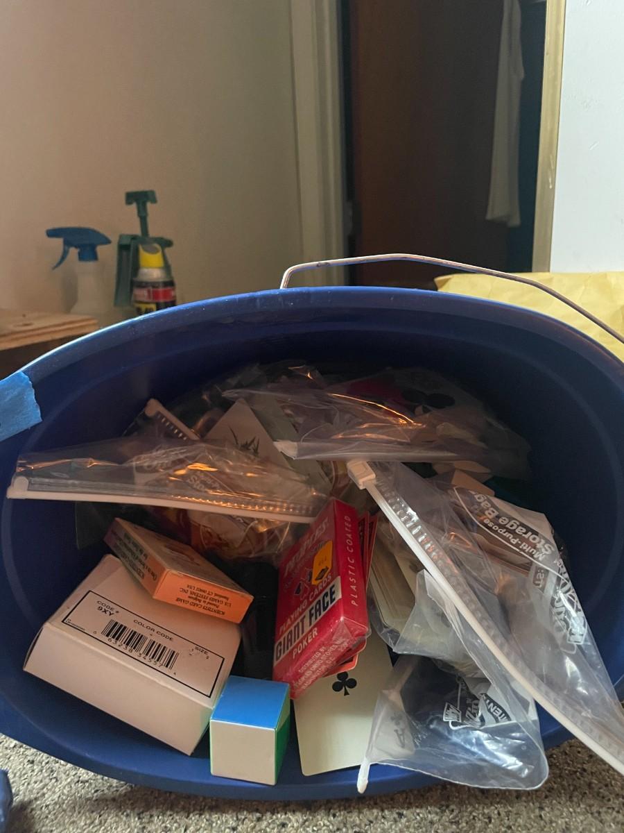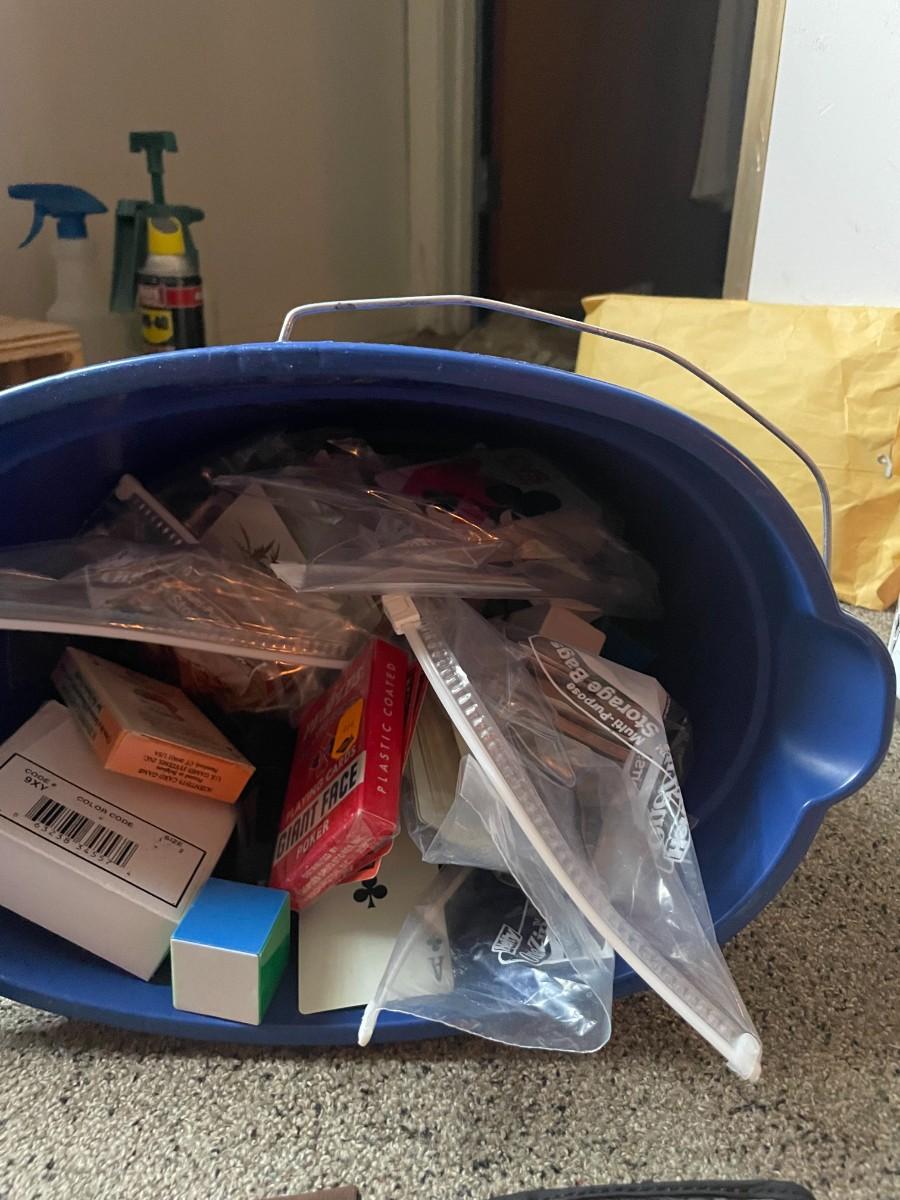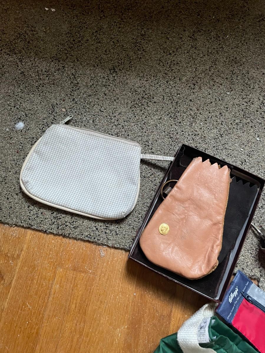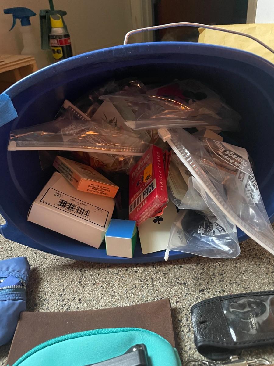 Misc. bags, purses, wallets, bucket of misc. cards and more.