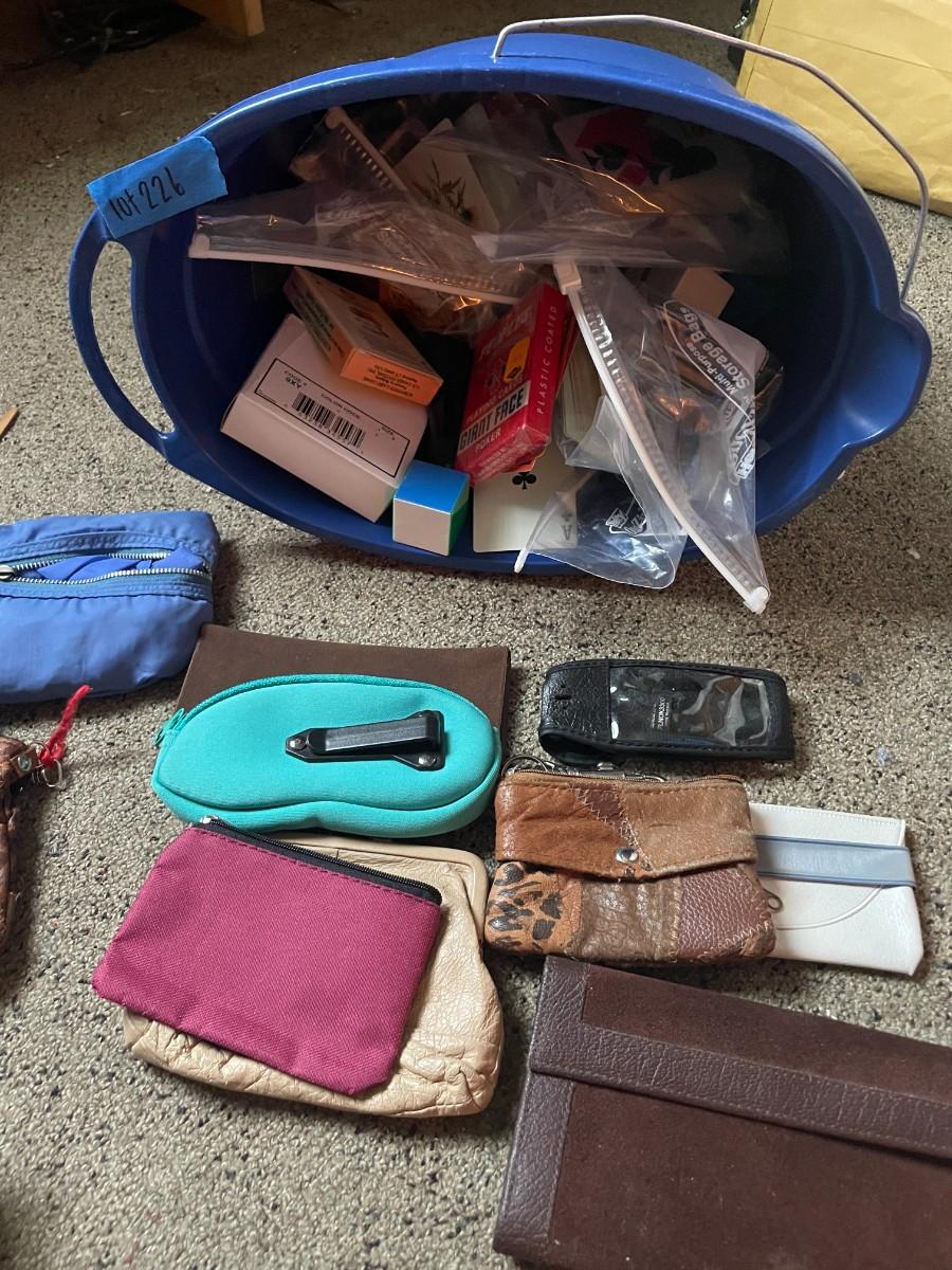 lot 226- Misc. bags, purses, wallets, bucket of misc. cards and more