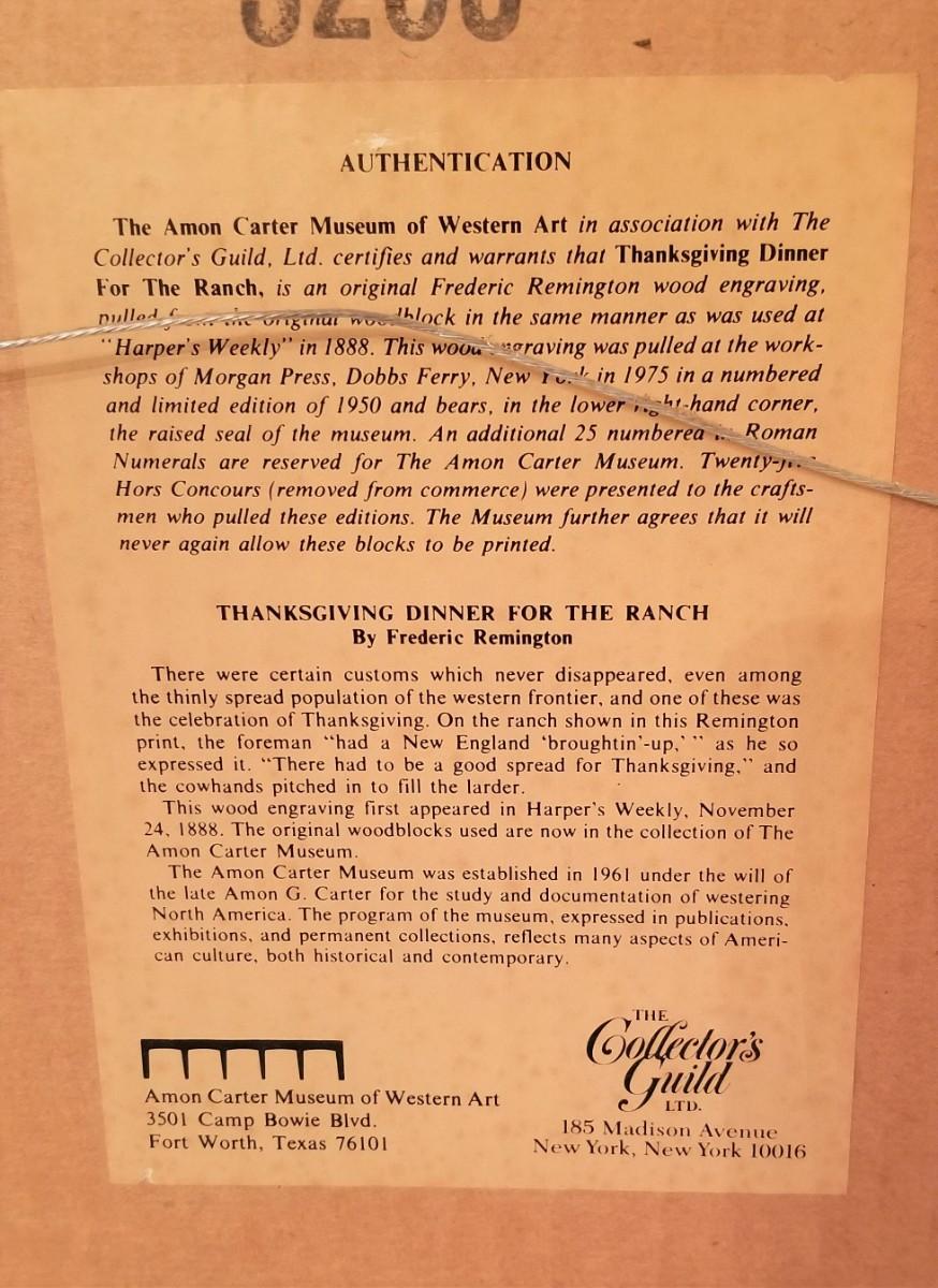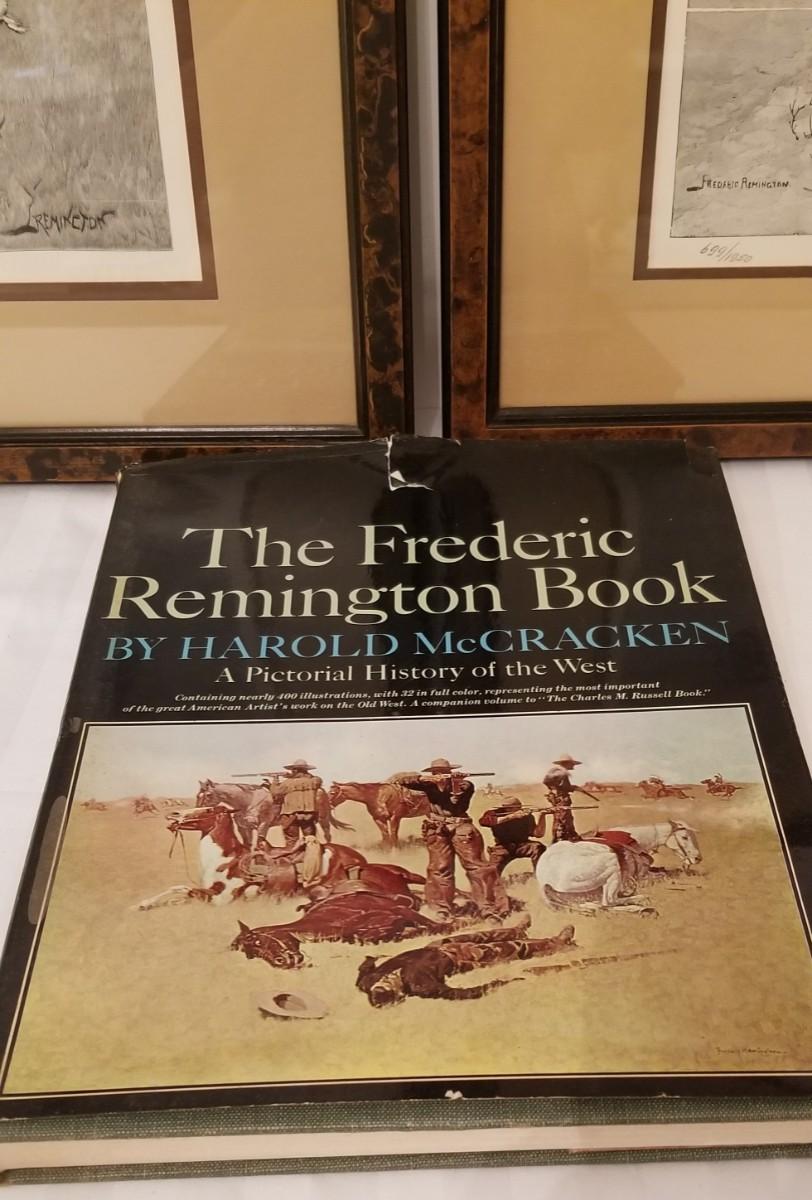 Super nice pair of Frederic Remington (famed Western artist) limited edition woodblocks from the Amon Carter Museum (has museum seal). Certificates on reverse - double mat. "Teaching a mustang pony to pack dead game" is 716/1950 and "Thanksgiving Dinner for the Ranch" is 699/1950. Also included is a Frederic Remington coffee table book on his life and artistic career, published 1966.