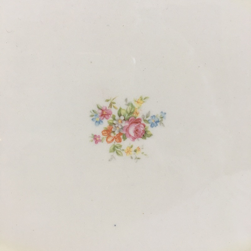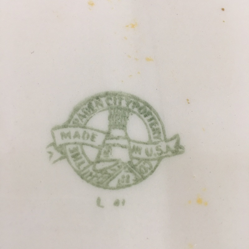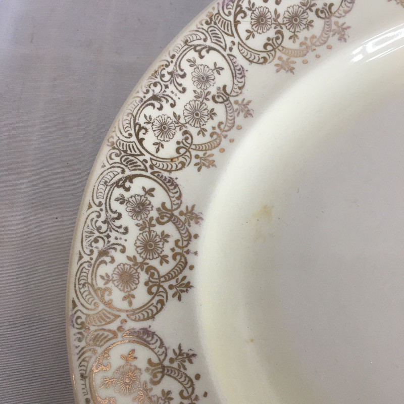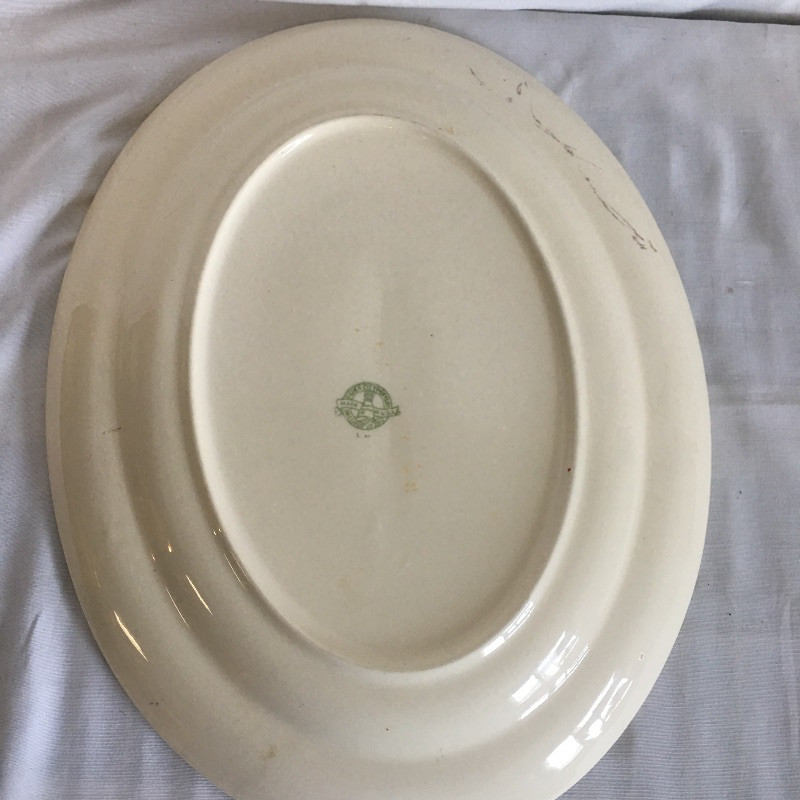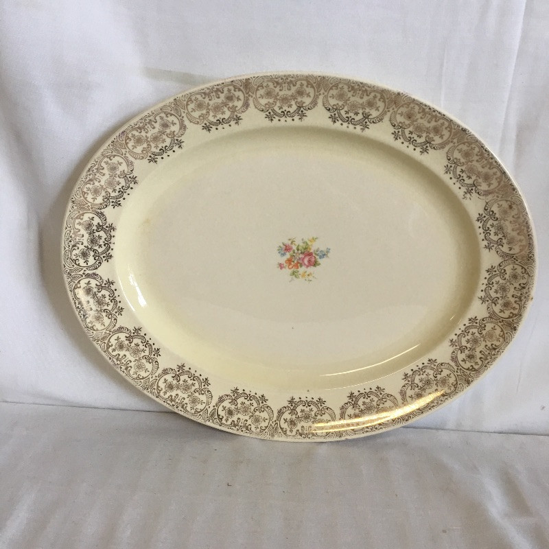 This vintage Paden City pottery platter has a delicate beautiful floral design in the center and an elegant gold colored design around the rim. Platter measures 12.5” x 16”.