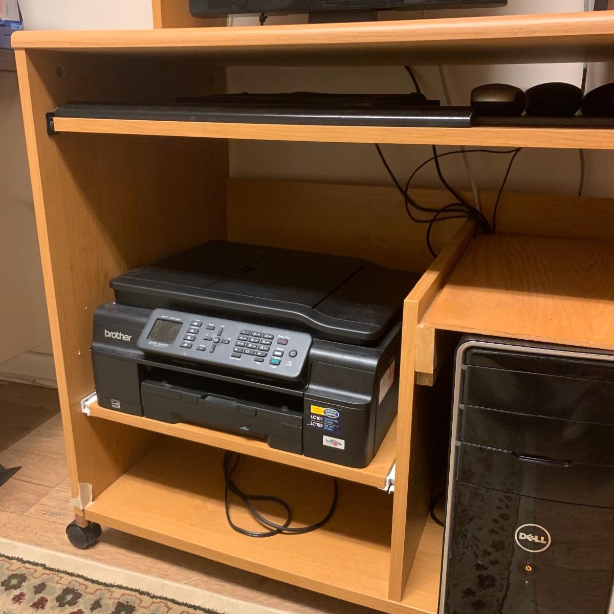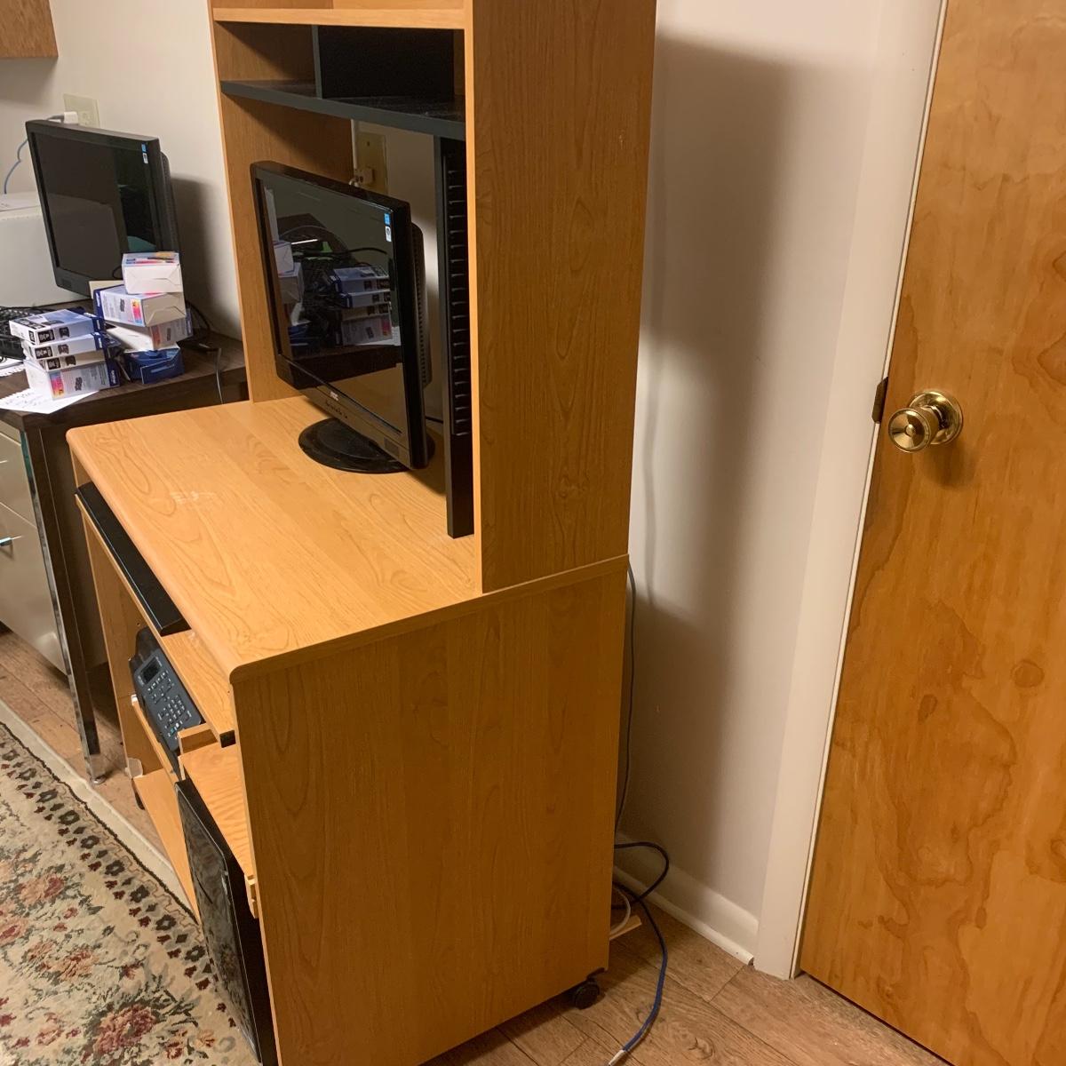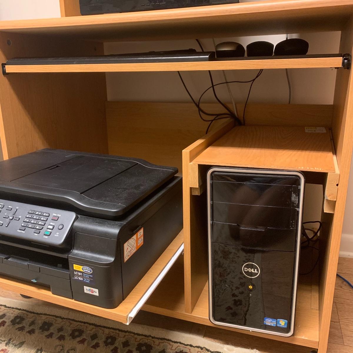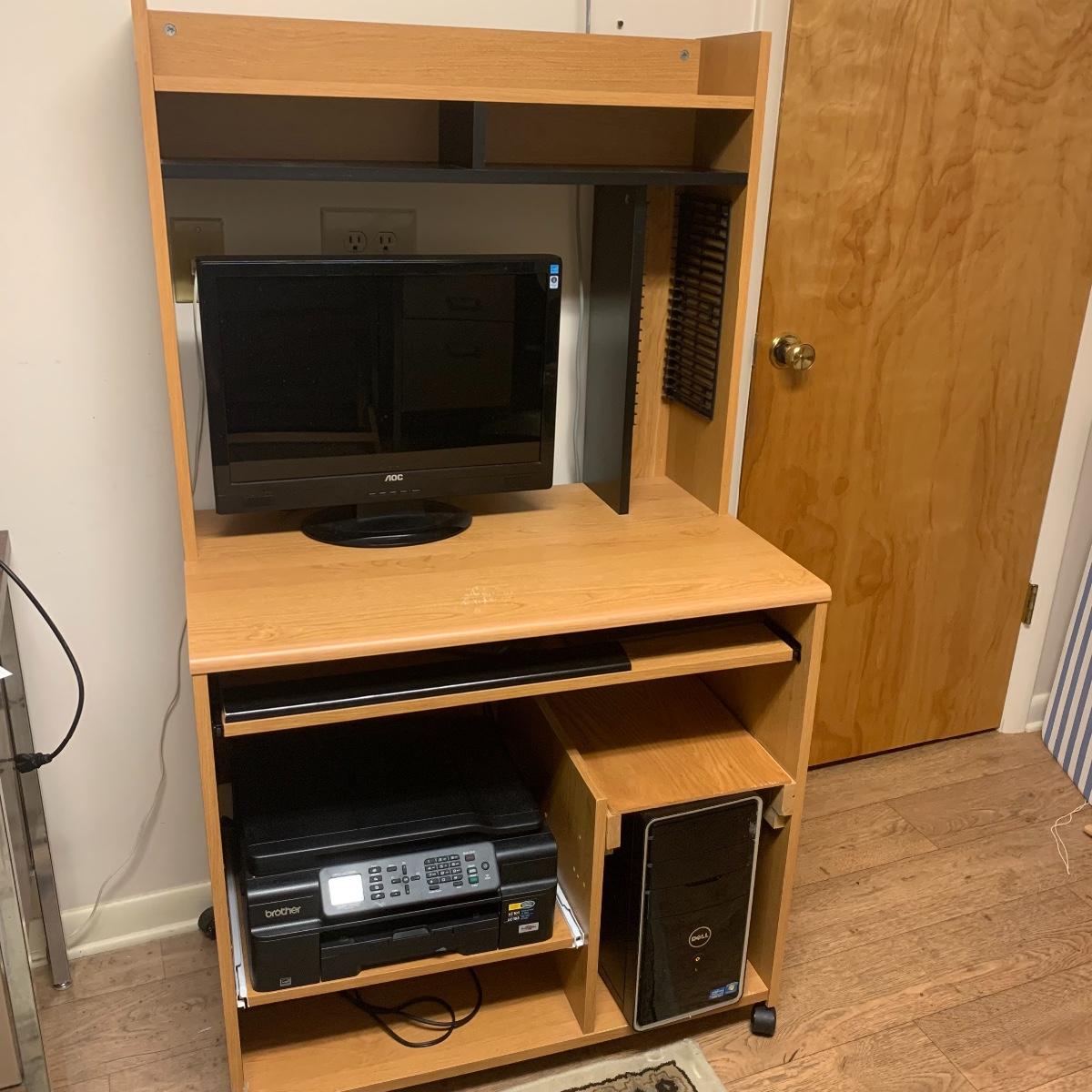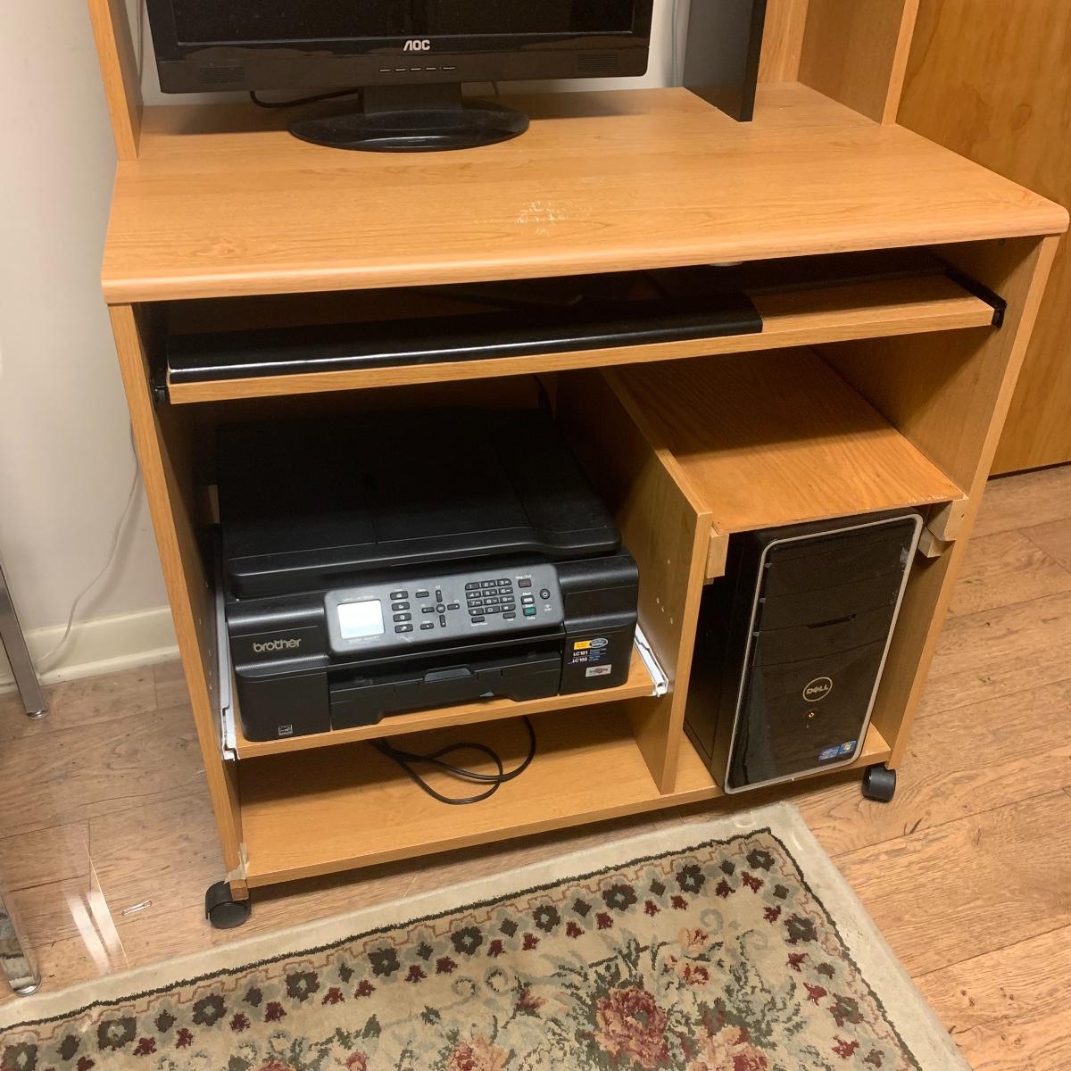 This lot includes two matching wooden computer desks. The desks both have slide-out shelving and a slide-out keyboard shelf. The desks have CD racks and open backing for cords. Both desks have some scratches in the wood (see photos). They both are on wheels; one of the desks is missing a wheel (see photos). The printer and Dell computer system are not included in the lot (lots 220 and 216). They measure about 20in x 31.5in x 55.5in. Local pick up only.