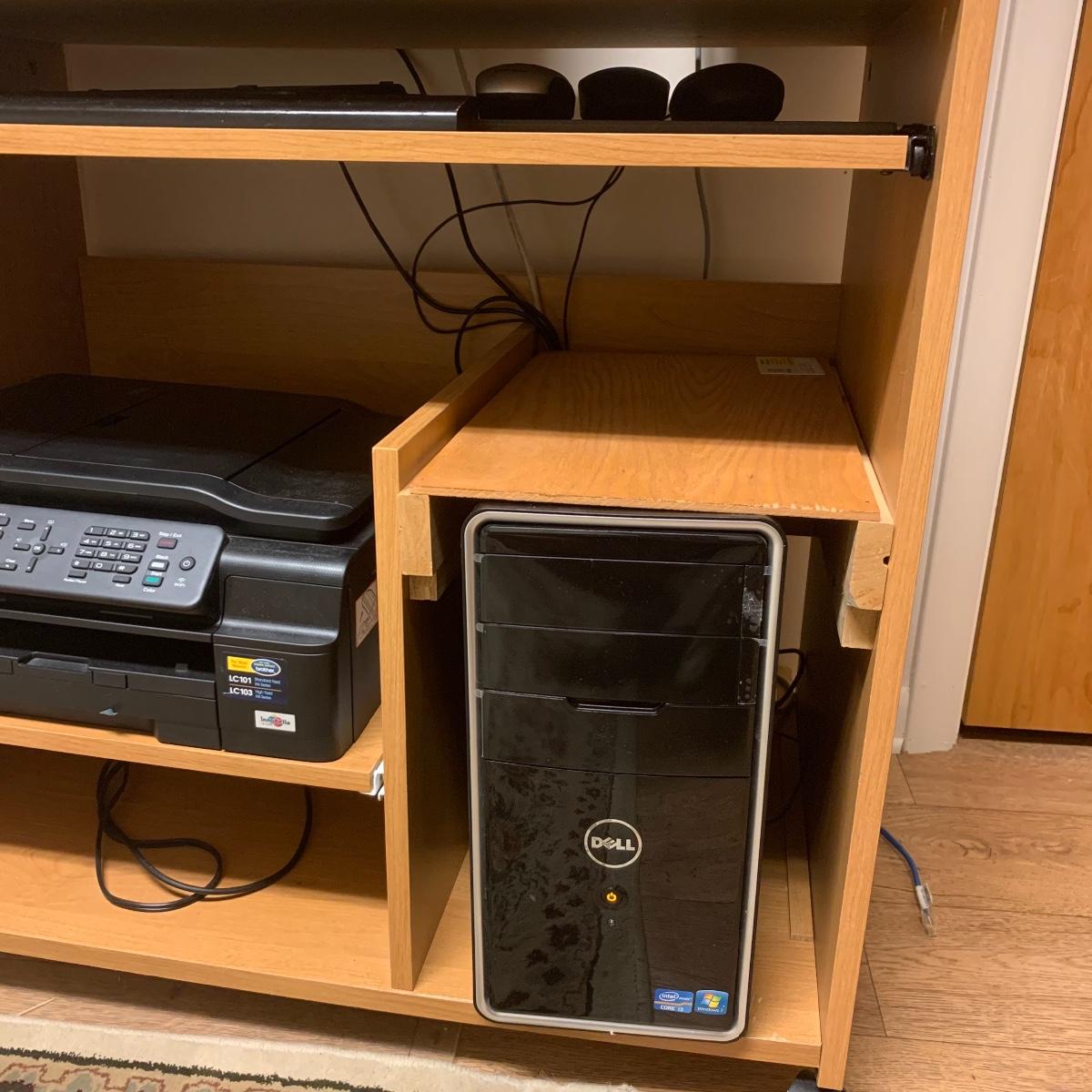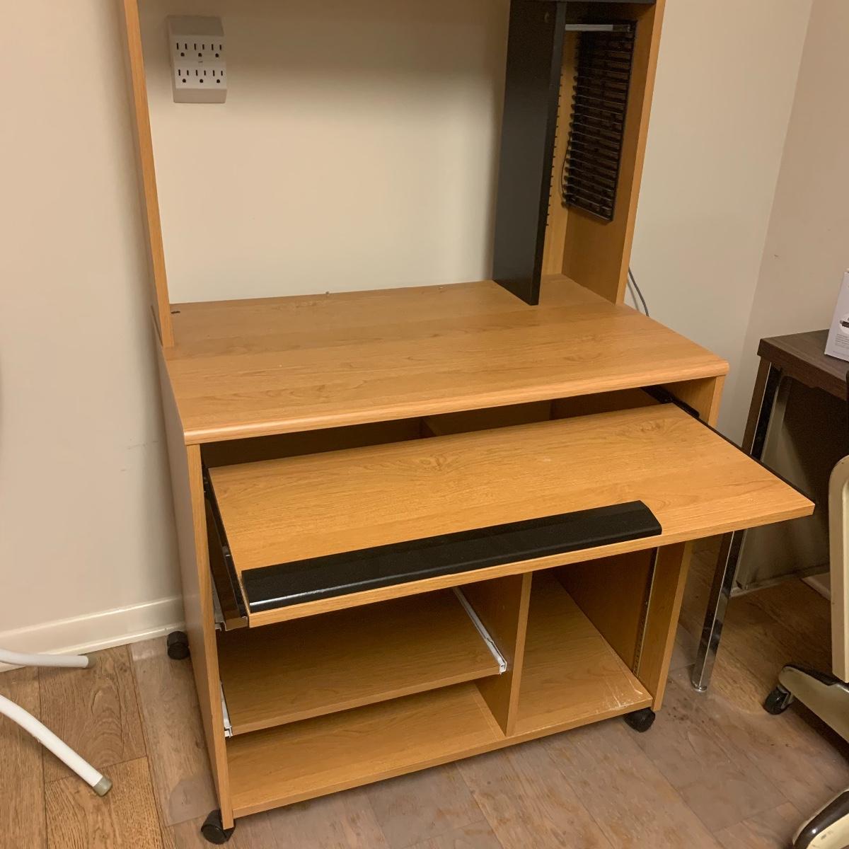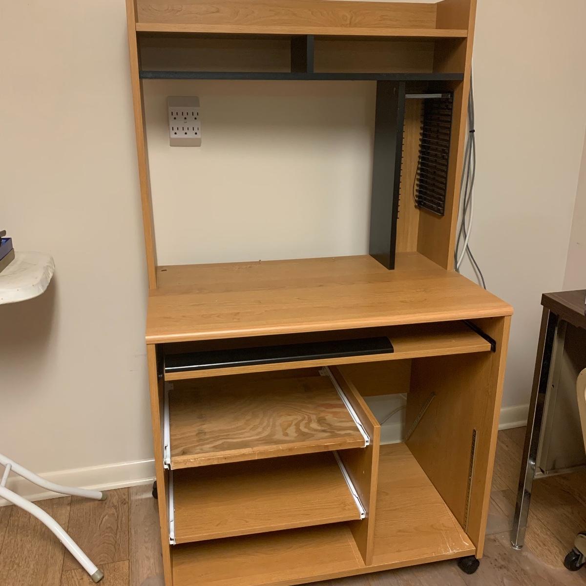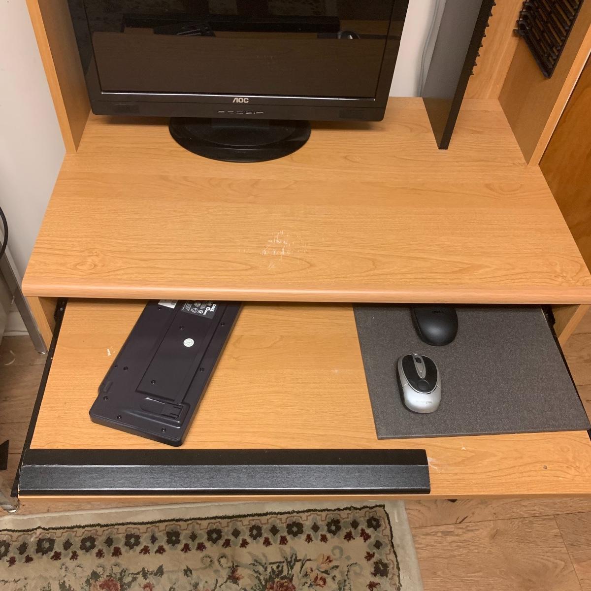 This lot includes two matching wooden computer desks. The desks both have slide-out shelving and a slide-out keyboard shelf. The desks have CD racks and open backing for cords. Both desks have some scratches in the wood (see photos). They both are on wheels; one of the desks is missing a wheel (see photos). The printer and Dell computer system are not included in the lot (lots 220 and 216). They measure about 20in x 31.5in x 55.5in. Local pick up only.