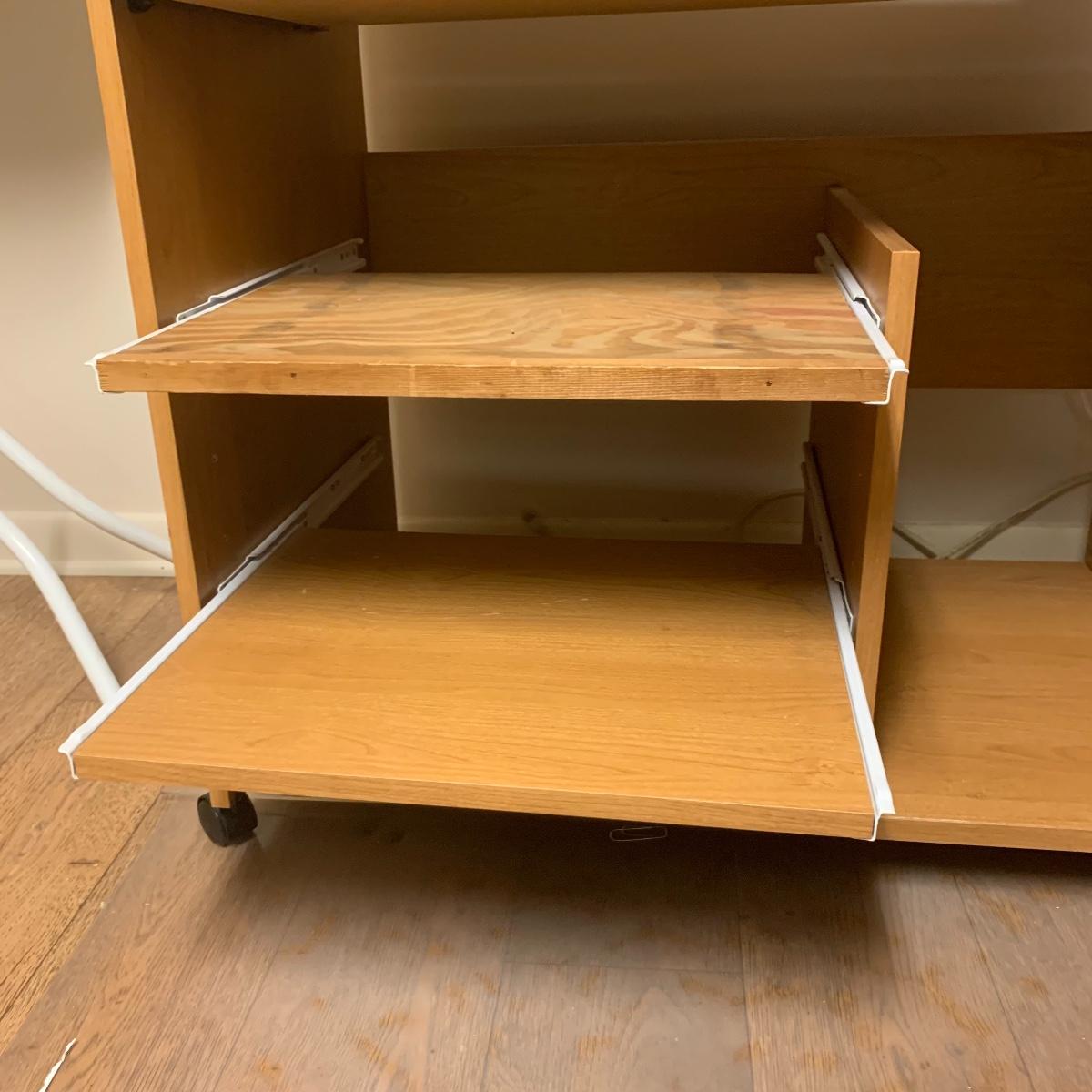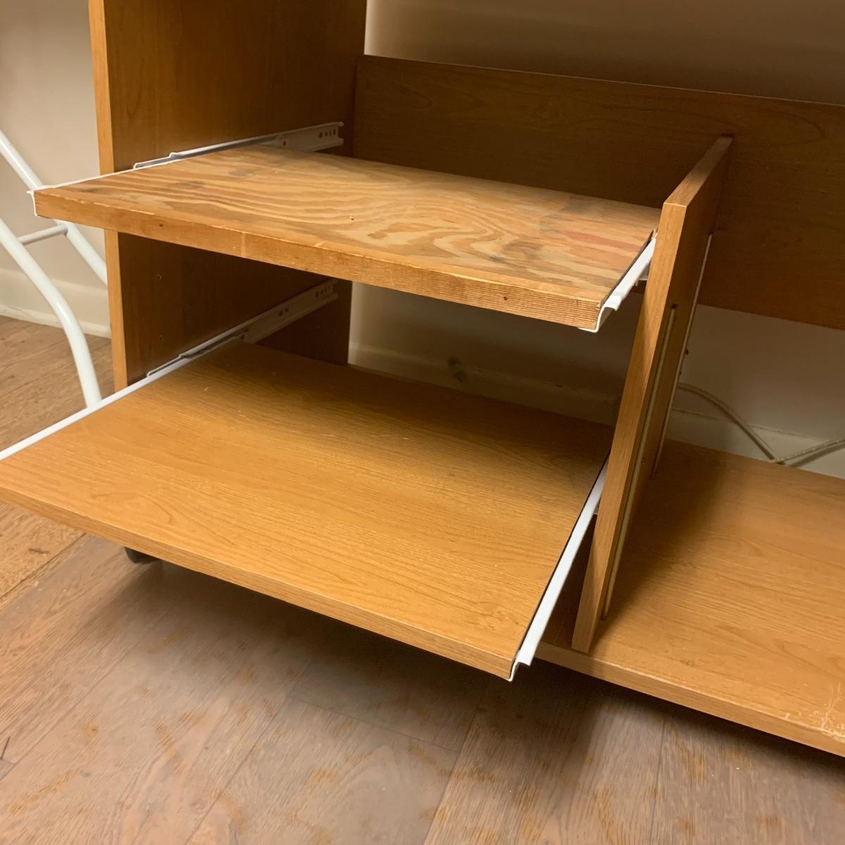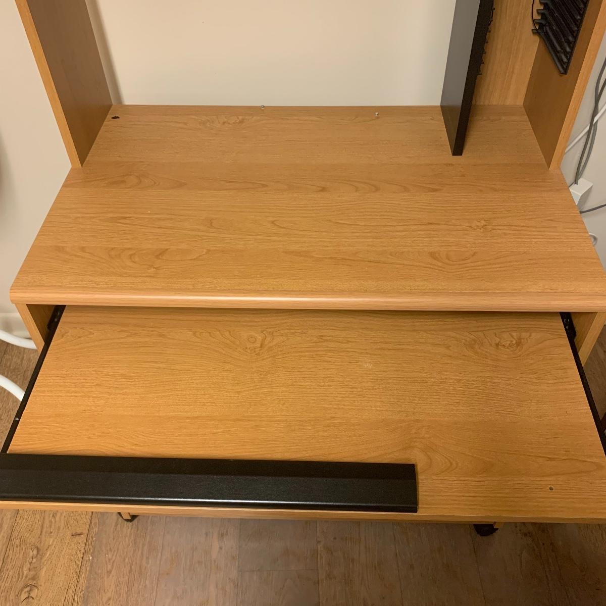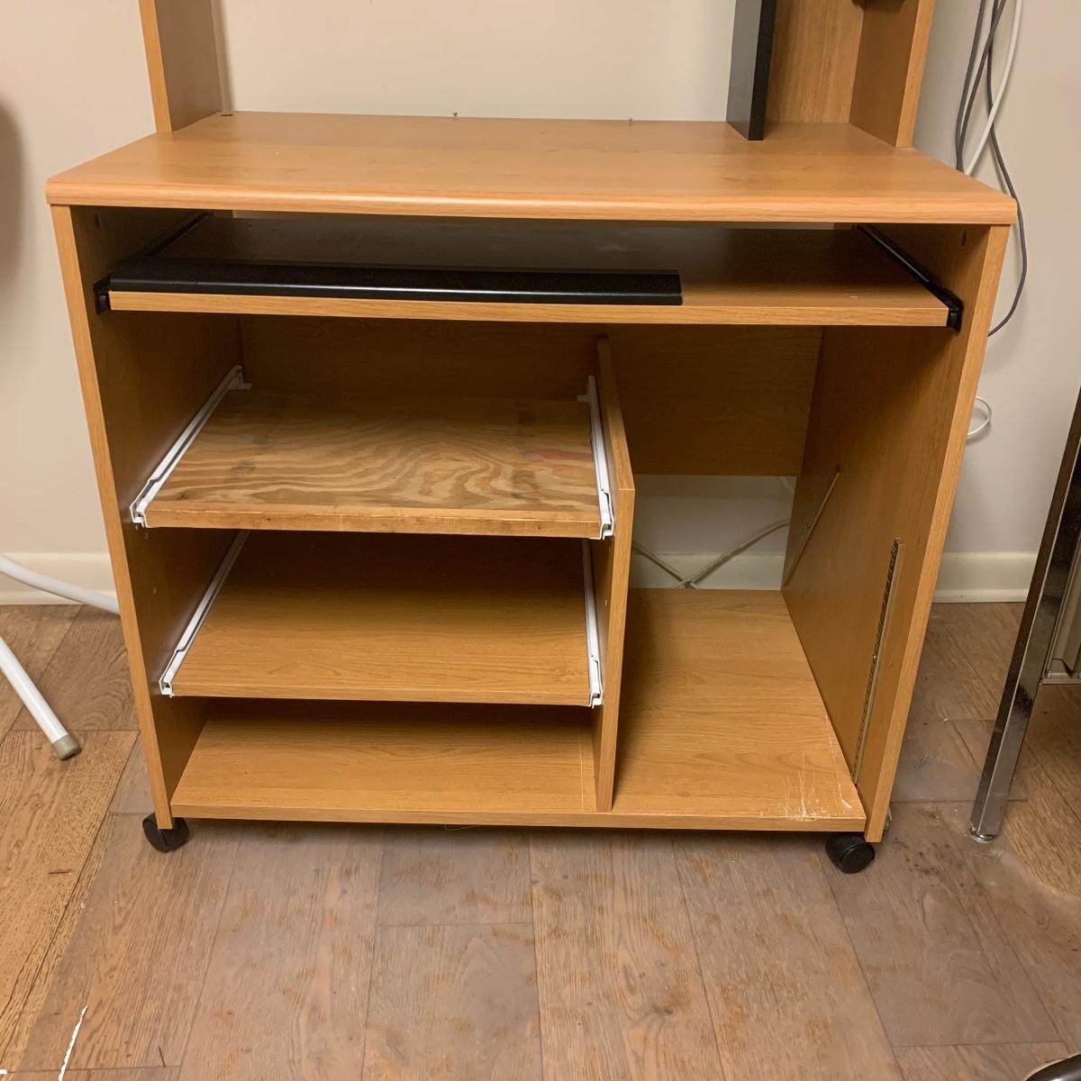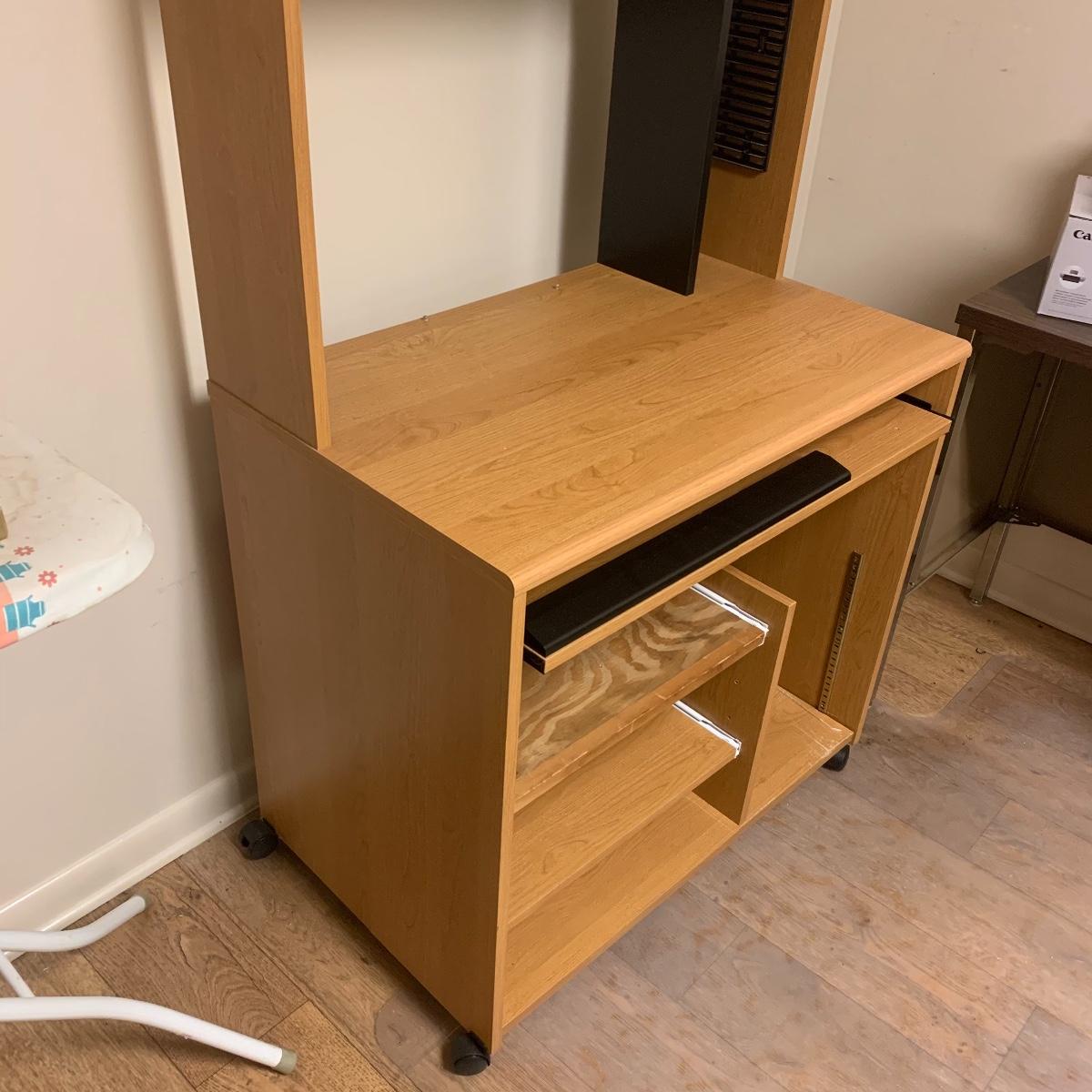 This lot includes two matching wooden computer desks. The desks both have slide-out shelving and a slide-out keyboard shelf. The desks have CD racks and open backing for cords. Both desks have some scratches in the wood (see photos). They both are on wheels; one of the desks is missing a wheel (see photos). The printer and Dell computer system are not included in the lot (lots 220 and 216). They measure about 20in x 31.5in x 55.5in. Local pick up only.