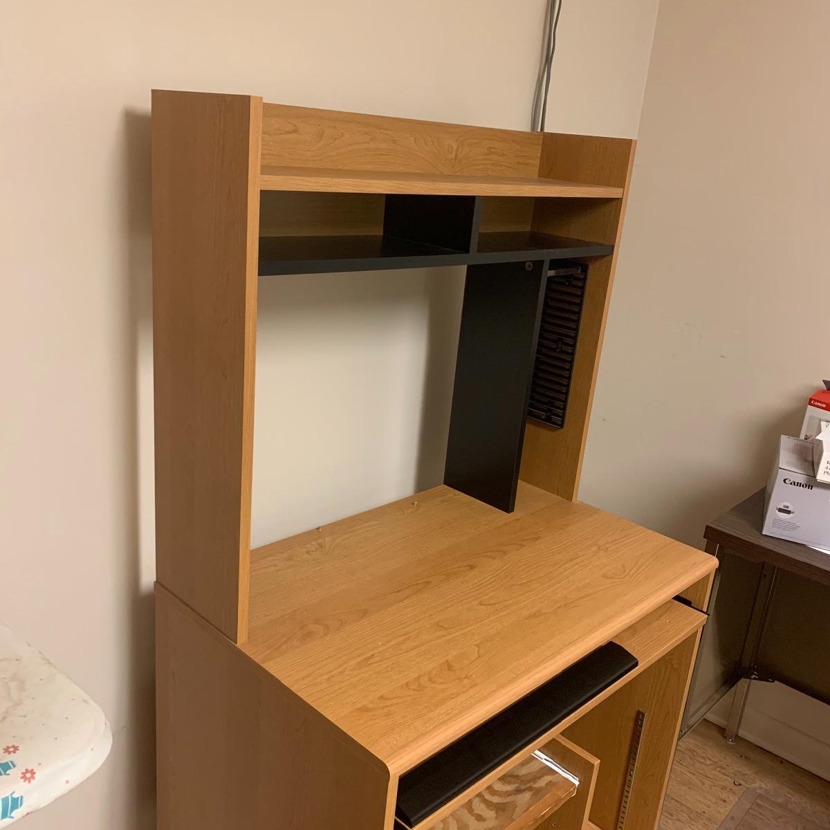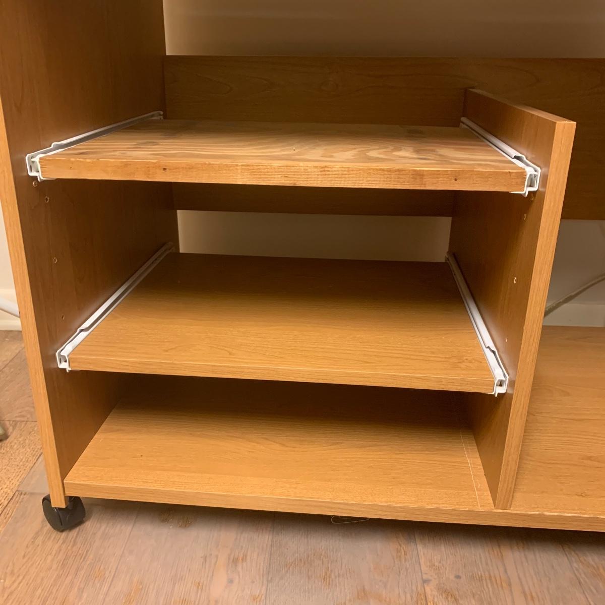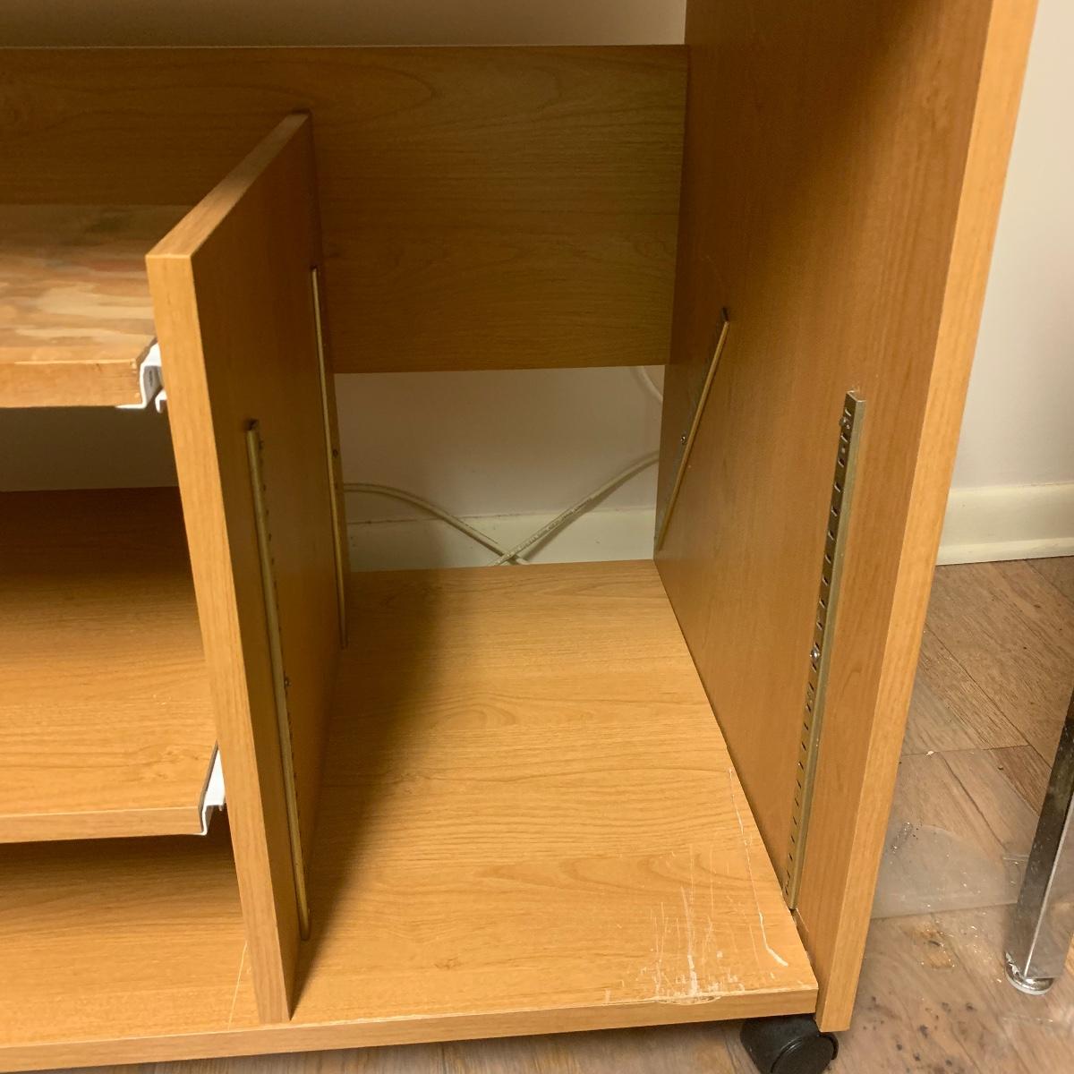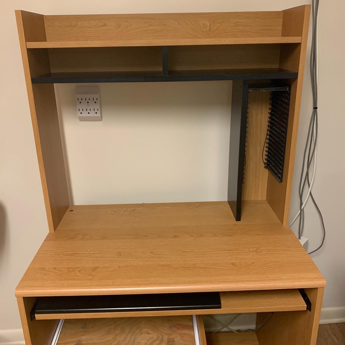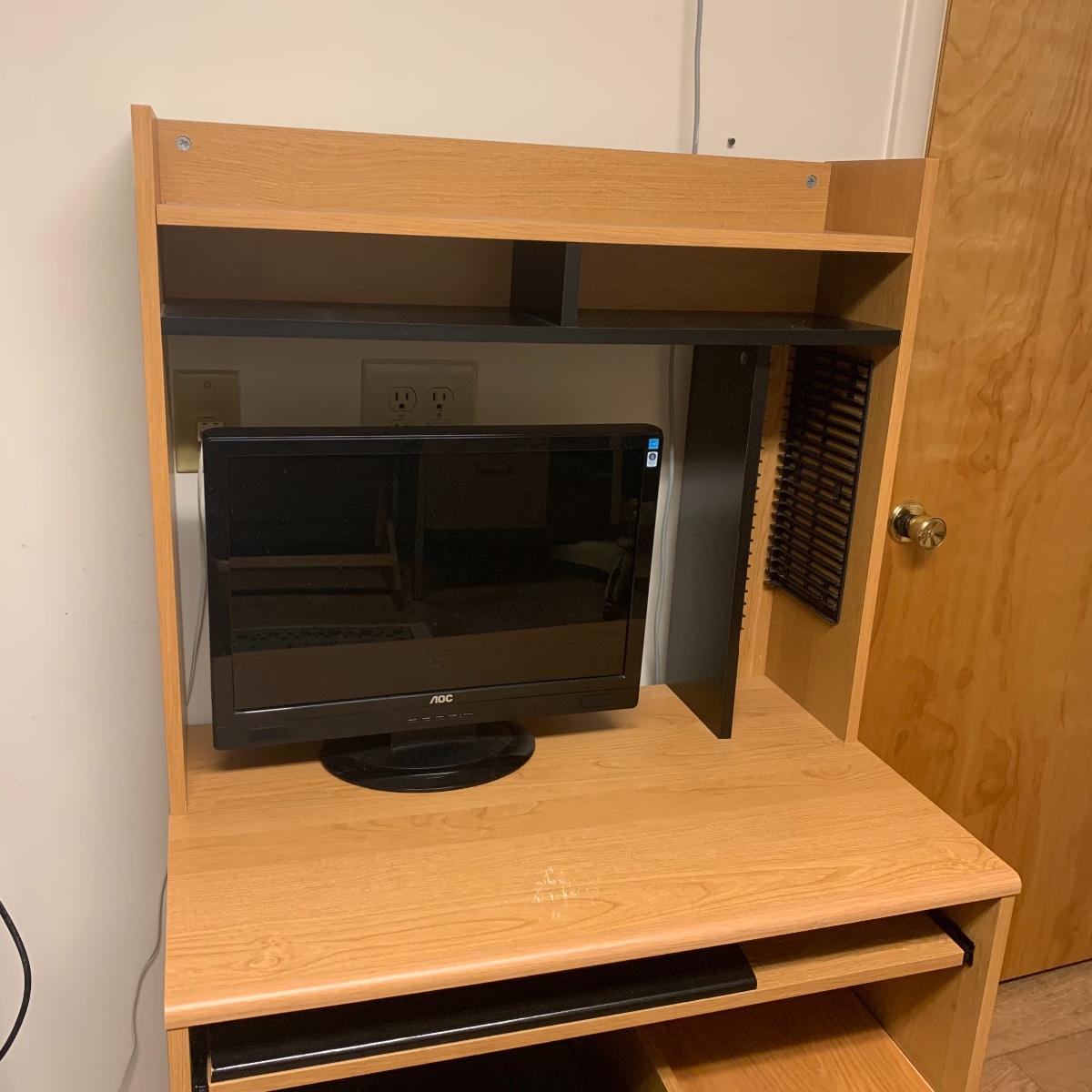 This lot includes two matching wooden computer desks. The desks both have slide-out shelving and a slide-out keyboard shelf. The desks have CD racks and open backing for cords. Both desks have some scratches in the wood (see photos). They both are on wheels; one of the desks is missing a wheel (see photos). The printer and Dell computer system are not included in the lot (lots 220 and 216). They measure about 20in x 31.5in x 55.5in. Local pick up only.