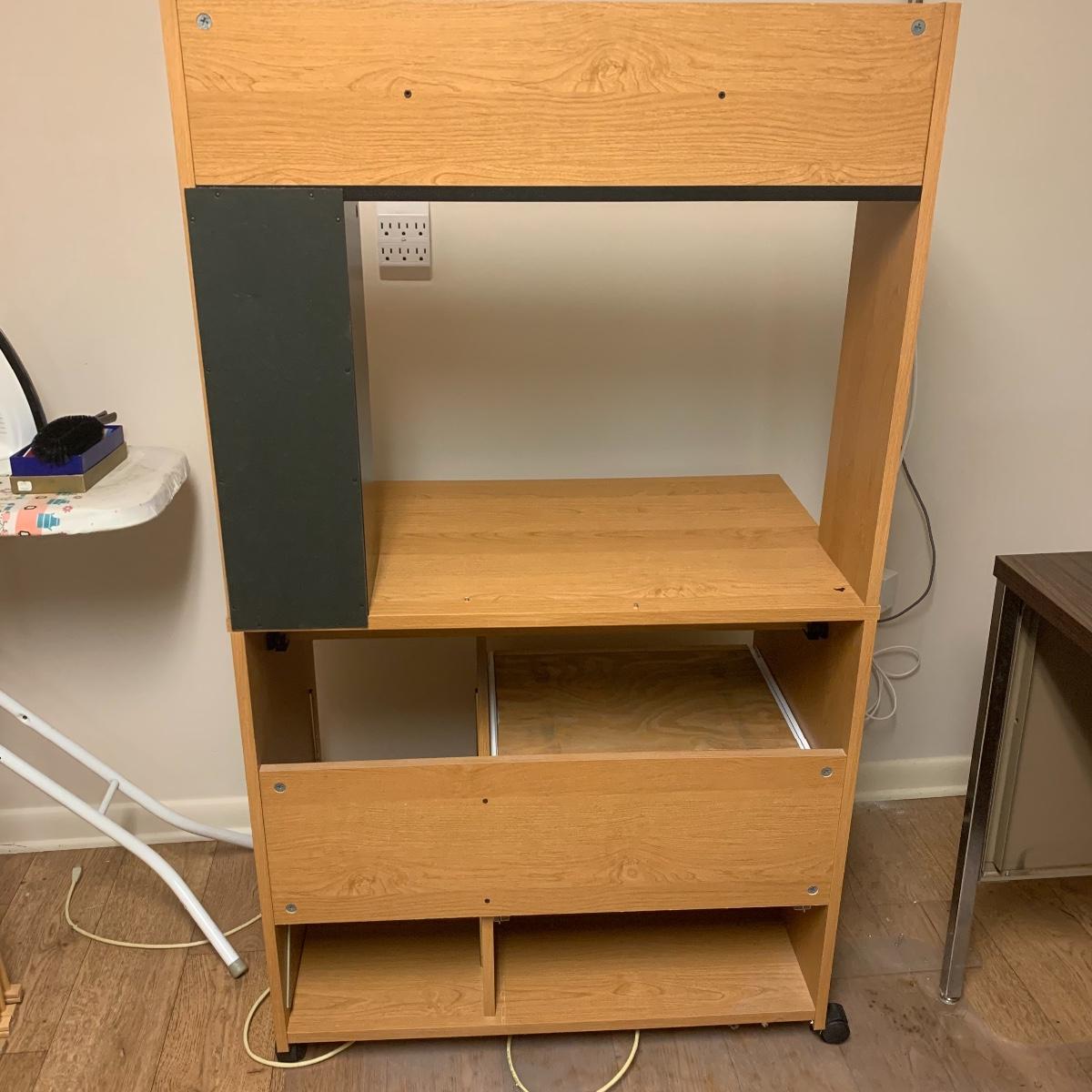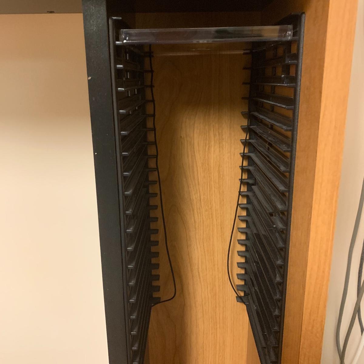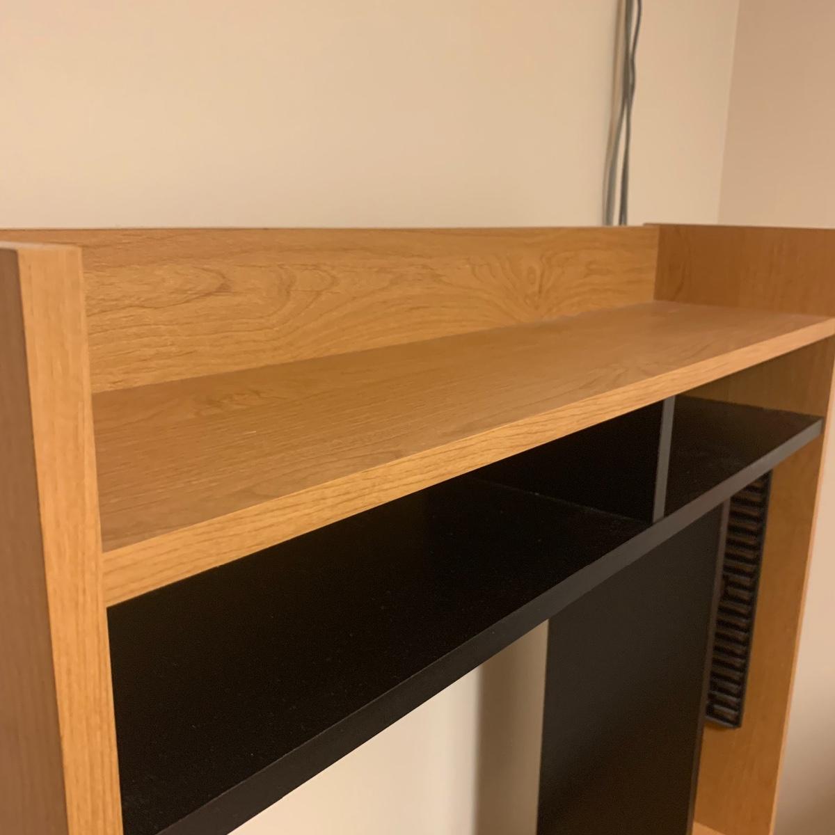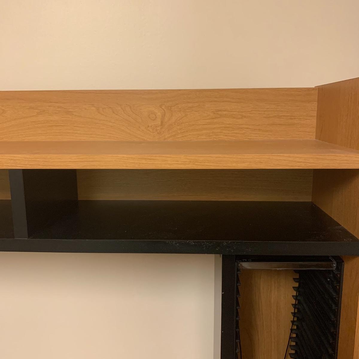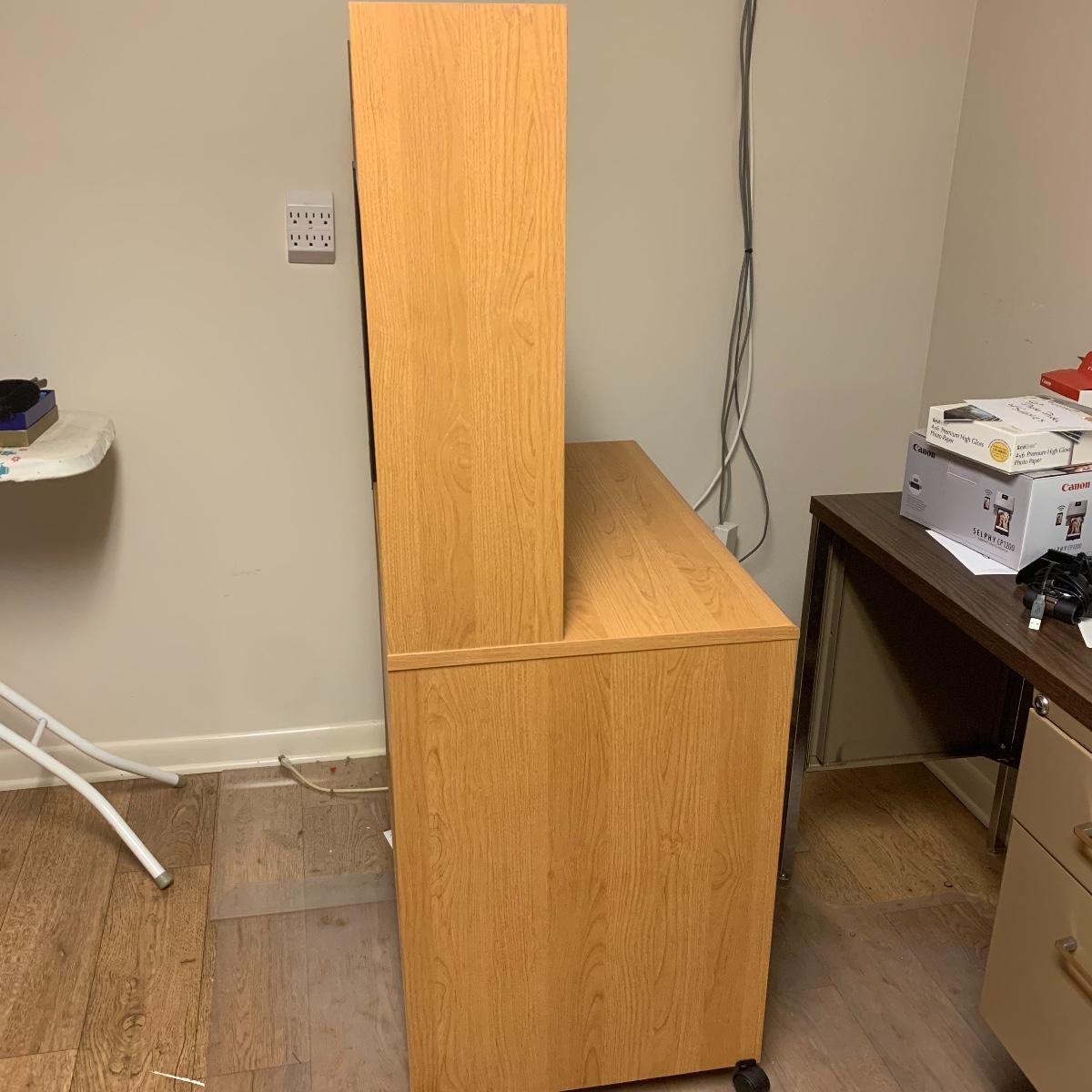 This lot includes two matching wooden computer desks. The desks both have slide-out shelving and a slide-out keyboard shelf. The desks have CD racks and open backing for cords. Both desks have some scratches in the wood (see photos). They both are on wheels; one of the desks is missing a wheel (see photos). The printer and Dell computer system are not included in the lot (lots 220 and 216). They measure about 20in x 31.5in x 55.5in. Local pick up only.