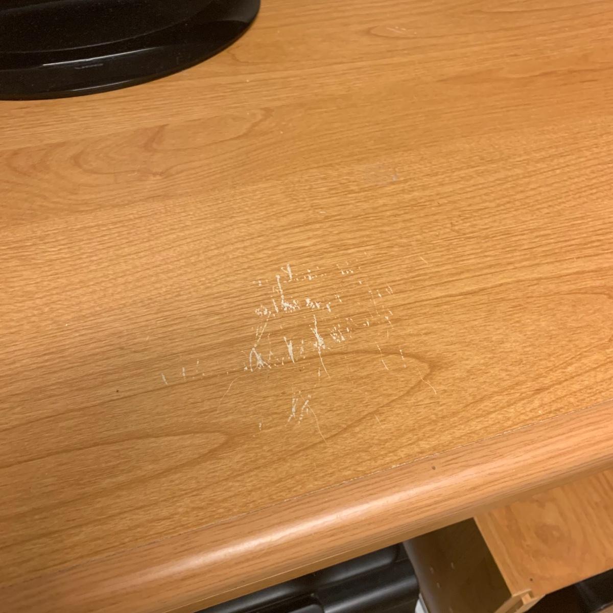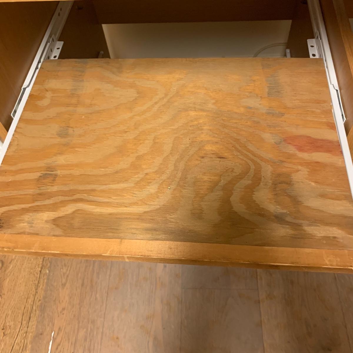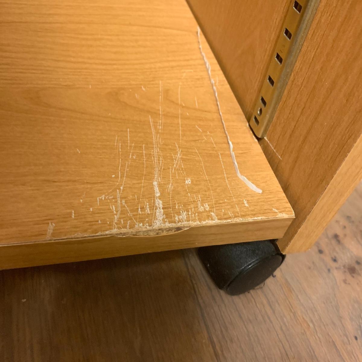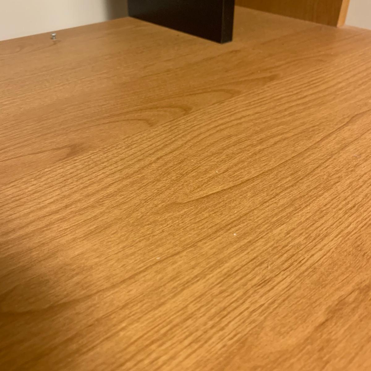 This lot includes two matching wooden computer desks. The desks both have slide-out shelving and a slide-out keyboard shelf. The desks have CD racks and open backing for cords. Both desks have some scratches in the wood (see photos). They both are on wheels; one of the desks is missing a wheel (see photos). The printer and Dell computer system are not included in the lot (lots 220 and 216). They measure about 20in x 31.5in x 55.5in. Local pick up only.