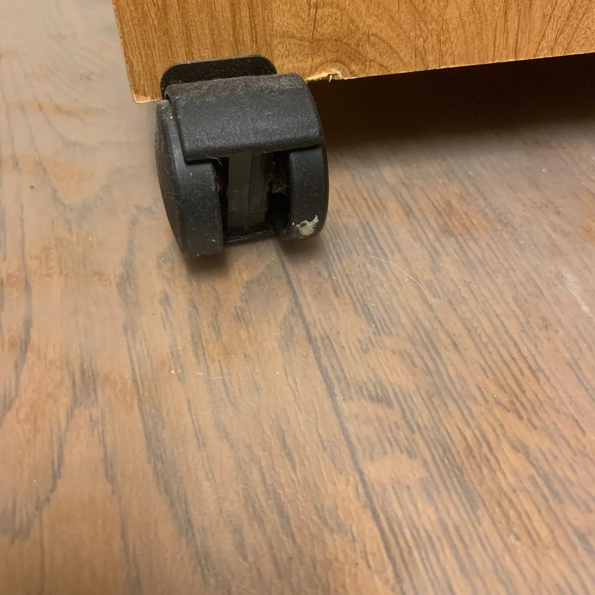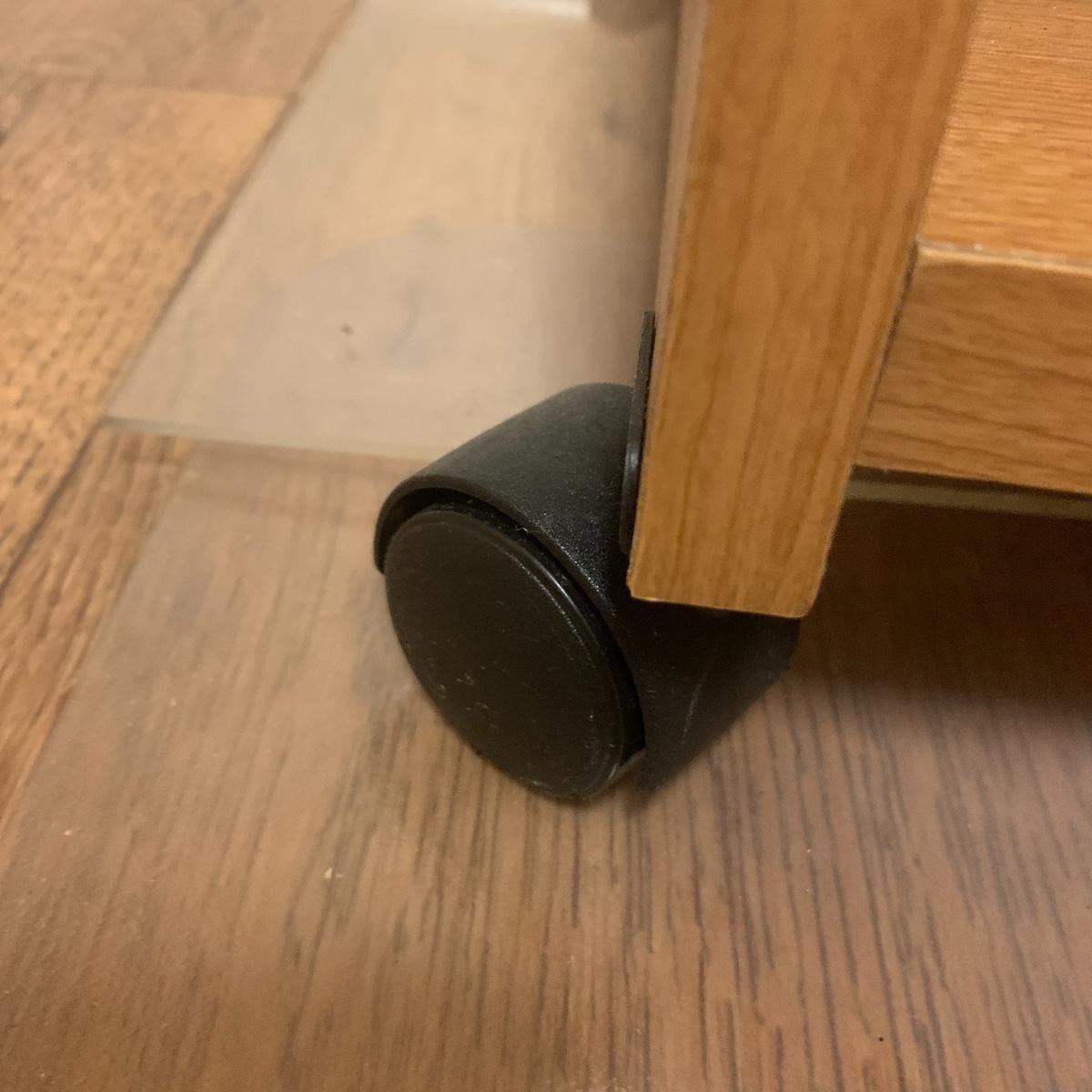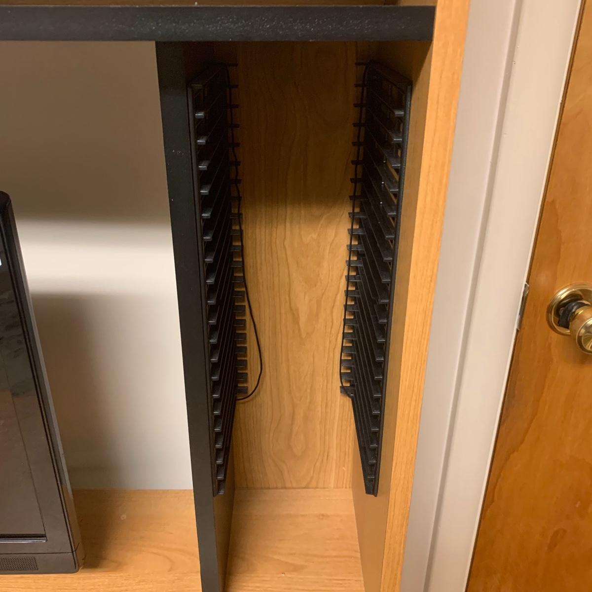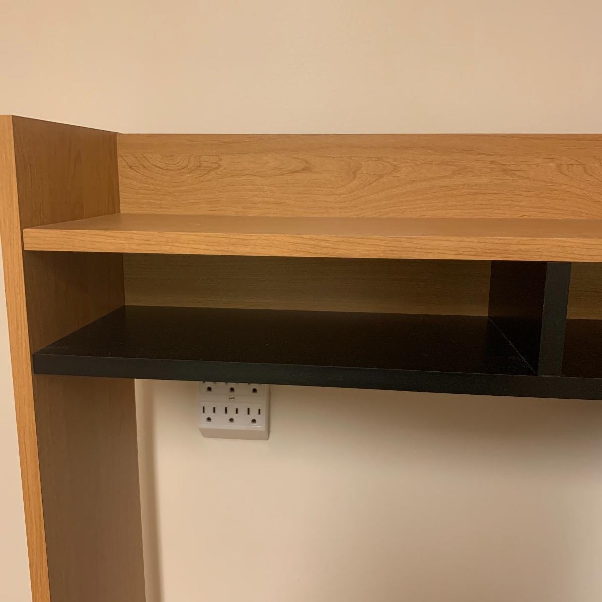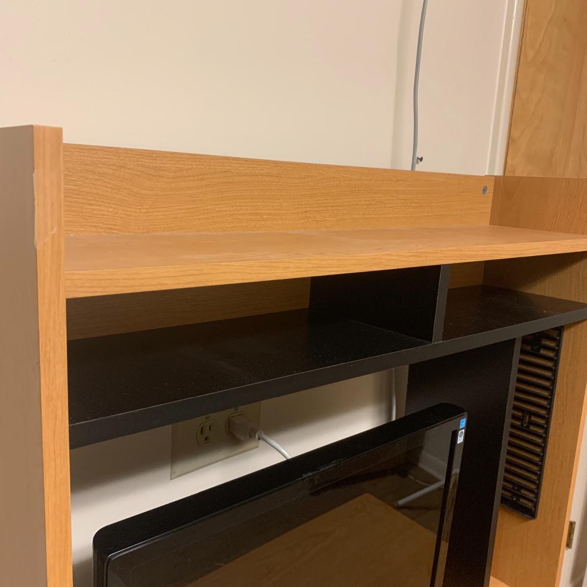 This lot includes two matching wooden computer desks. The desks both have slide-out shelving and a slide-out keyboard shelf. The desks have CD racks and open backing for cords. Both desks have some scratches in the wood (see photos). They both are on wheels; one of the desks is missing a wheel (see photos). The printer and Dell computer system are not included in the lot (lots 220 and 216). They measure about 20in x 31.5in x 55.5in. Local pick up only.